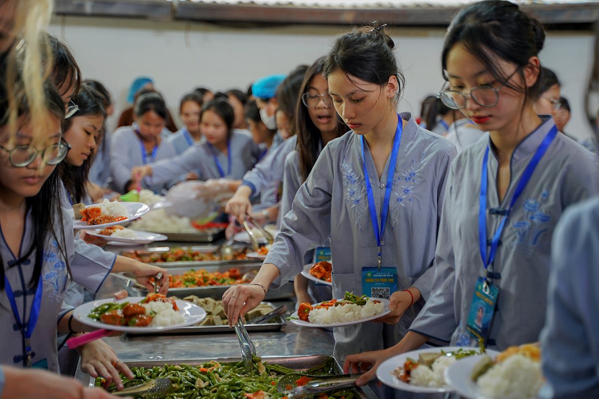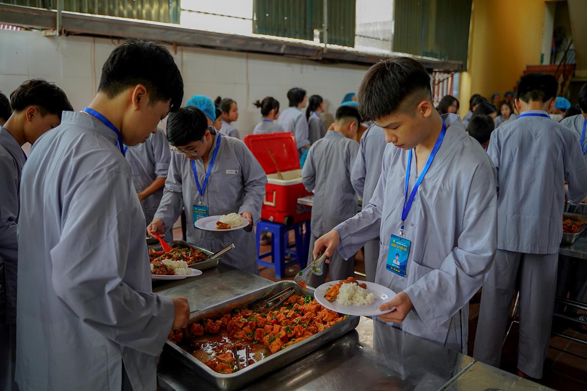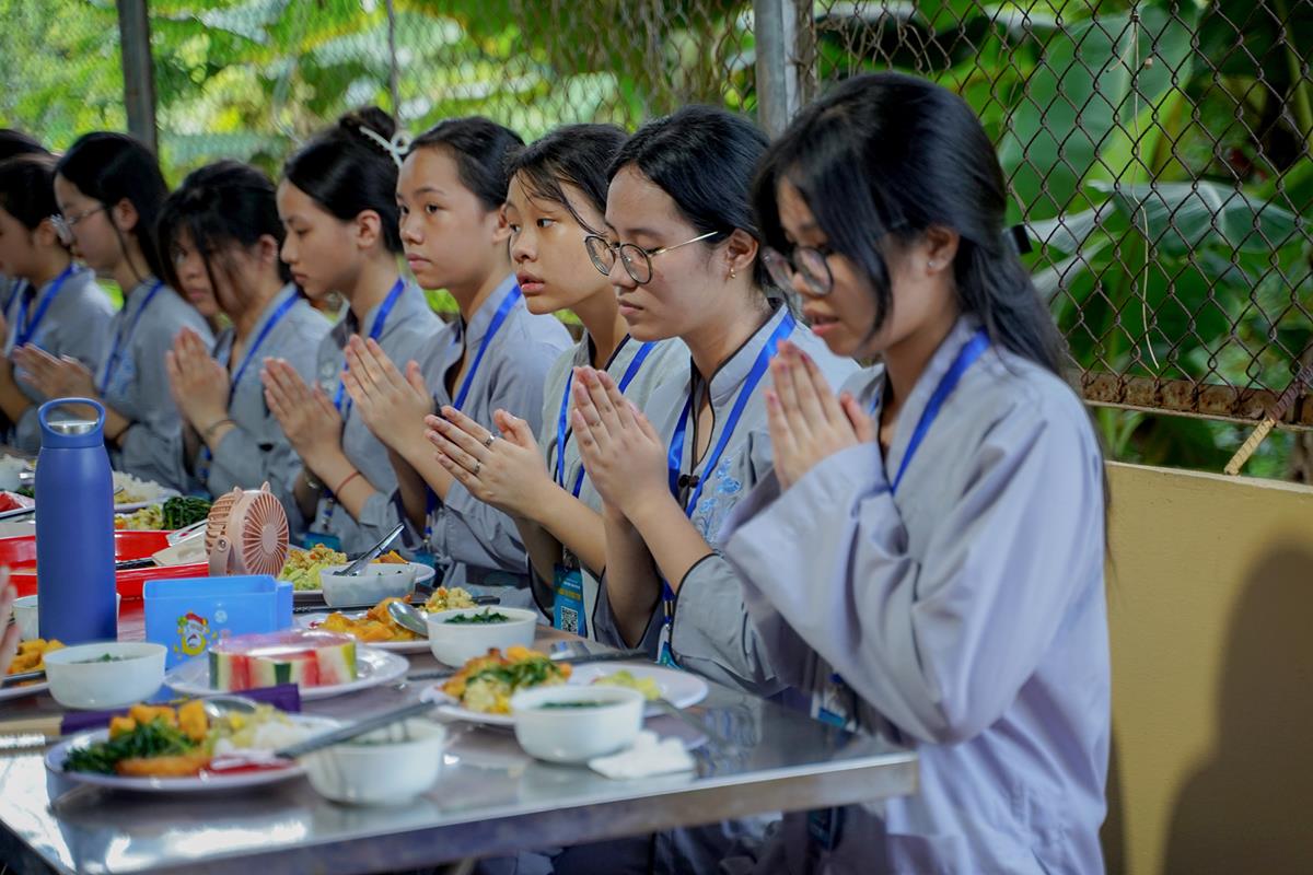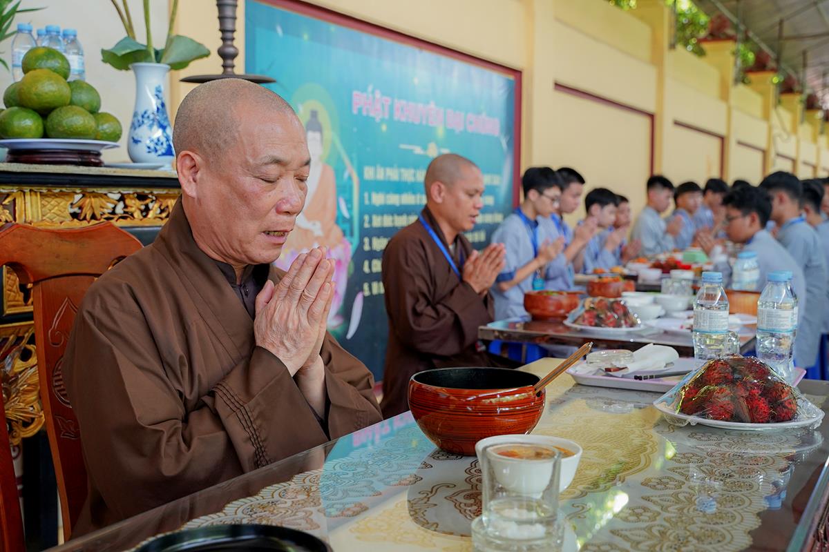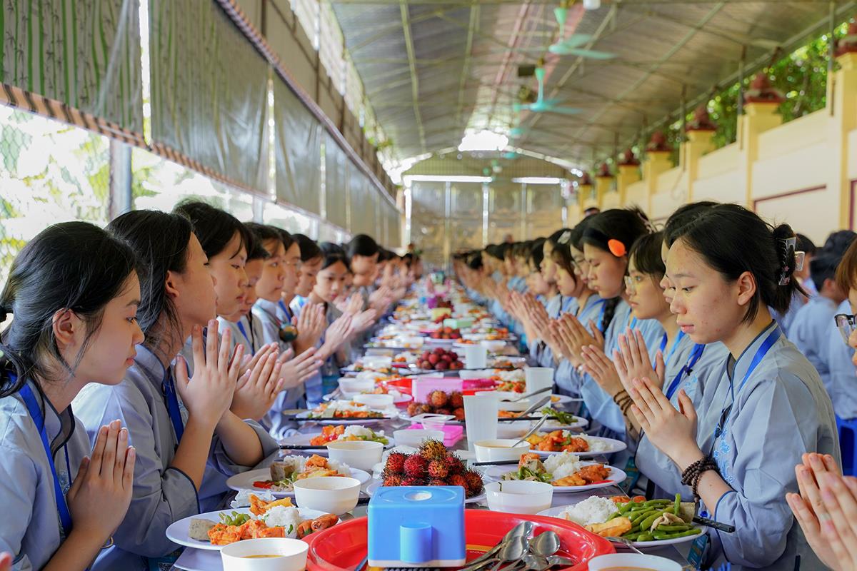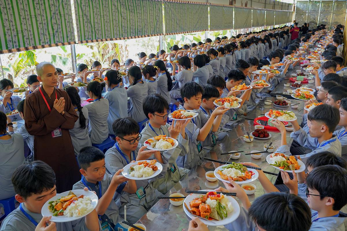 Buổi trưa, các bạn đã có bữa ăn chay đầu tiên đầy lạ lẫm, lần đầu trải nghiệm nghi thức cúng Quá Đường của thiền môn, dùng cơm trong chính niệm, học cách biết ơn tới những người đã làm ra bữa cơm cho mình. Những món ăn đầy hấp dẫn, phù hợp với sở thích, đáp ứng yêu cầu vệ sinh an toàn thực phẩm nghiêm ngặt đã khiến các bạn có một trải nghiệm ăn chay thú vị.