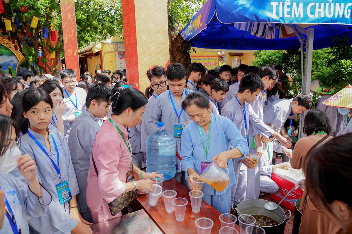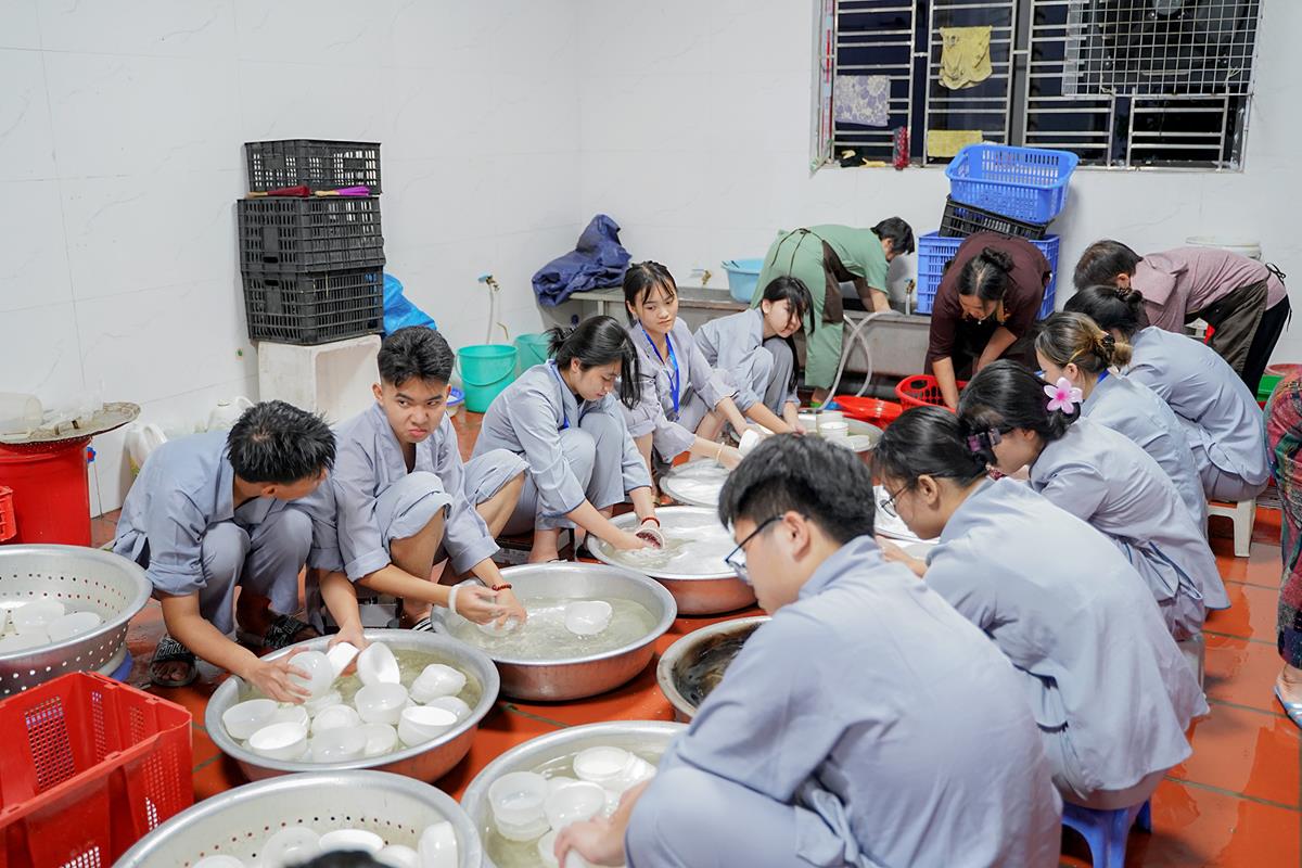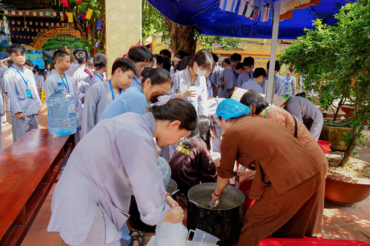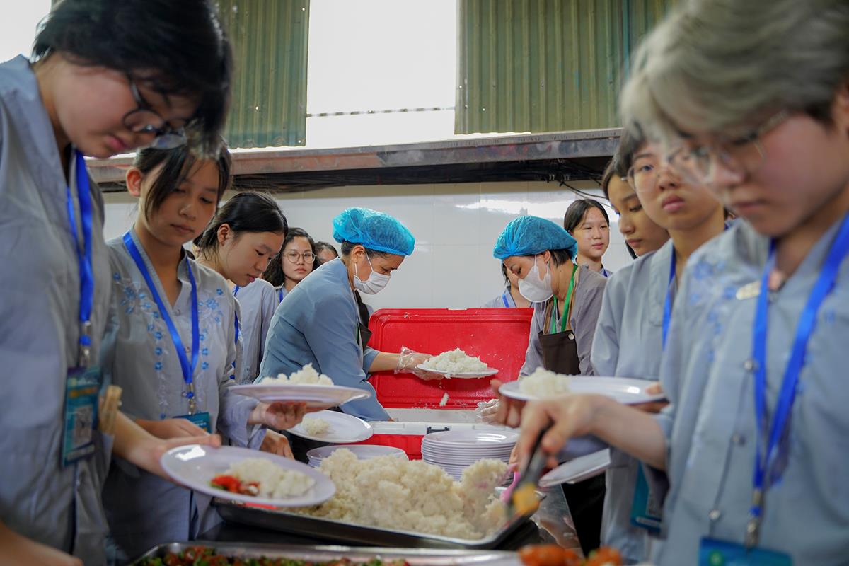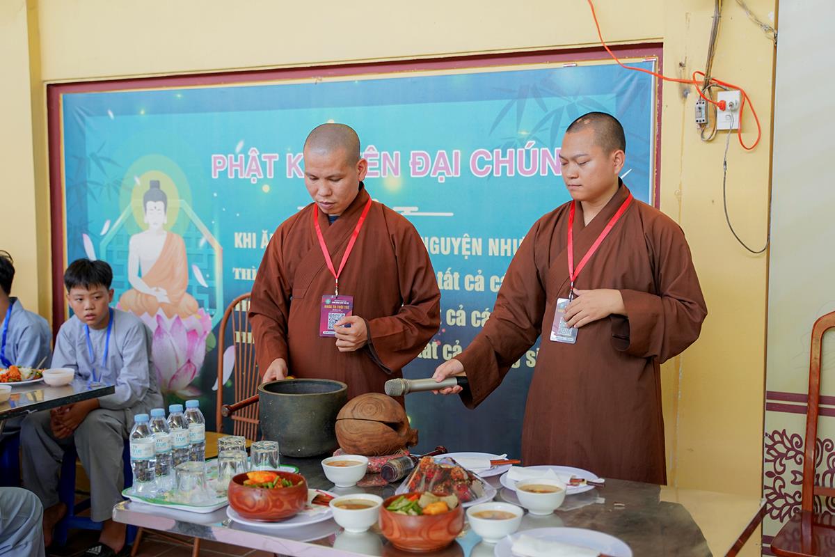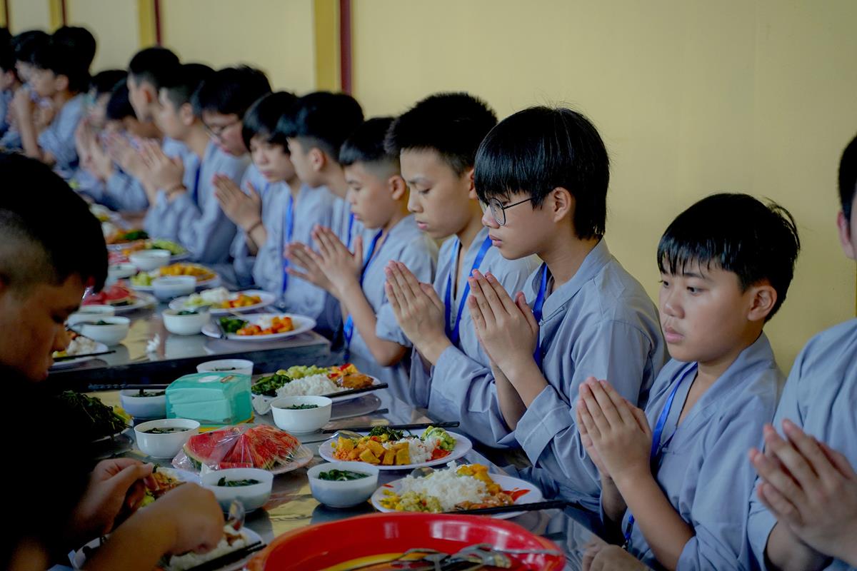 Buổi trưa, các bạn đã có bữa ăn chay đầu tiên đầy lạ lẫm, lần đầu trải nghiệm nghi thức cúng Quá Đường của thiền môn, dùng cơm trong chính niệm, học cách biết ơn tới những người đã làm ra bữa cơm cho mình. Những món ăn đầy hấp dẫn, phù hợp với sở thích, đáp ứng yêu cầu vệ sinh an toàn thực phẩm nghiêm ngặt đã khiến các bạn có một trải nghiệm ăn chay thú vị.