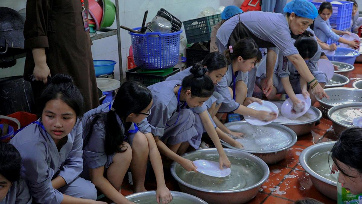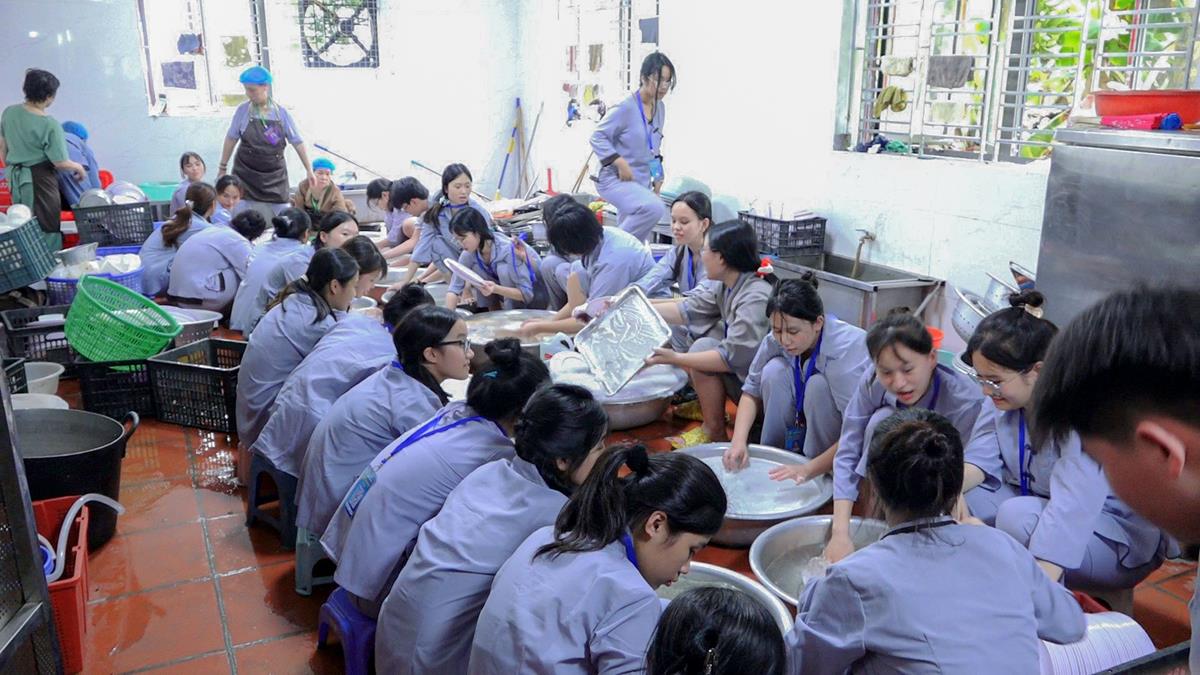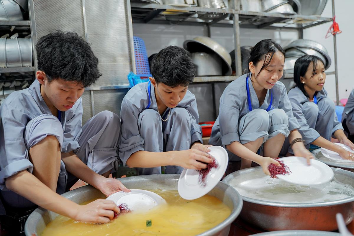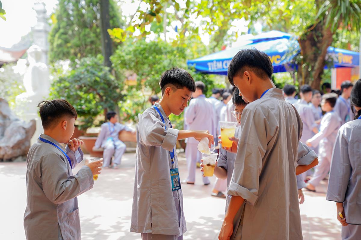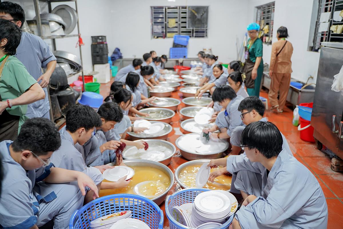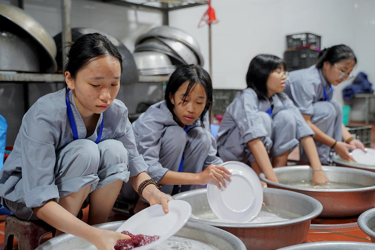 Buổi trưa, các bạn đã có bữa ăn chay đầu tiên đầy lạ lẫm, lần đầu trải nghiệm nghi thức cúng Quá Đường của thiền môn, dùng cơm trong chính niệm, học cách biết ơn tới những người đã làm ra bữa cơm cho mình. Những món ăn đầy hấp dẫn, phù hợp với sở thích, đáp ứng yêu cầu vệ sinh an toàn thực phẩm nghiêm ngặt đã khiến các bạn có một trải nghiệm ăn chay thú vị.