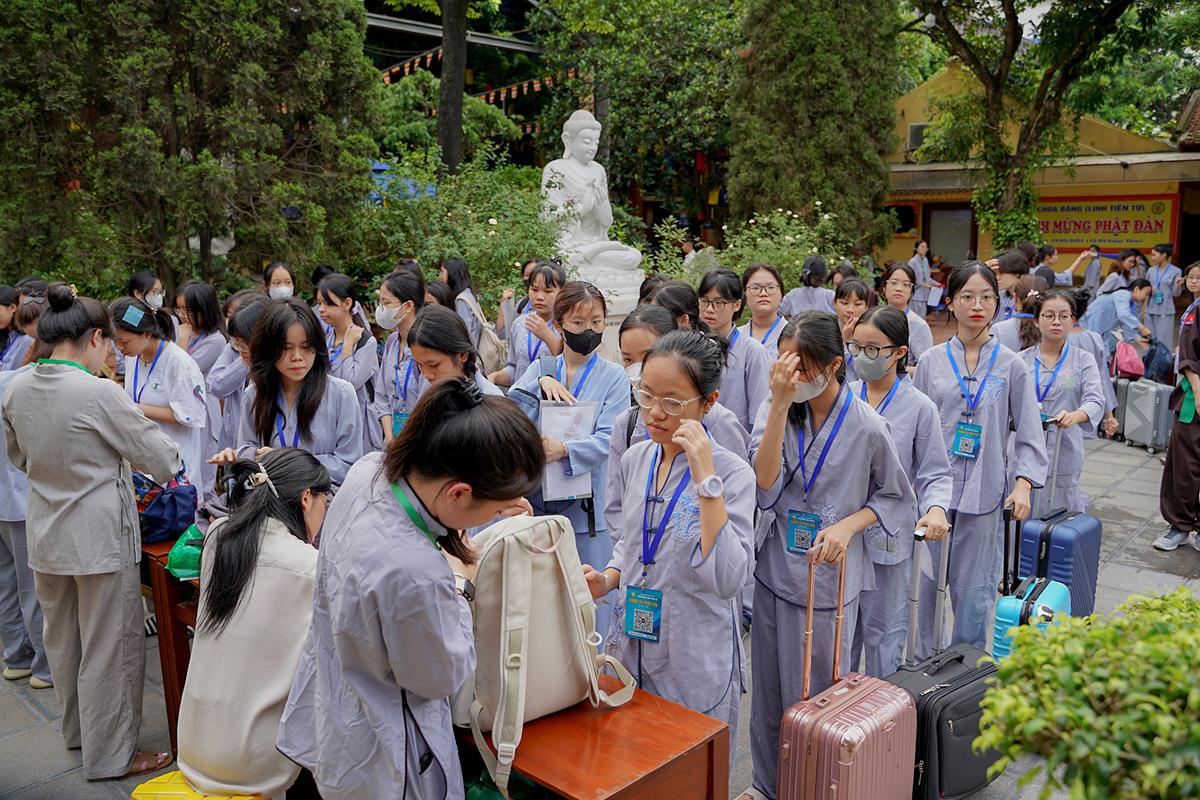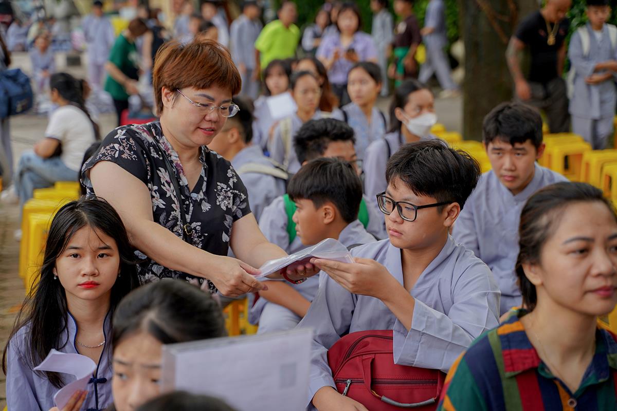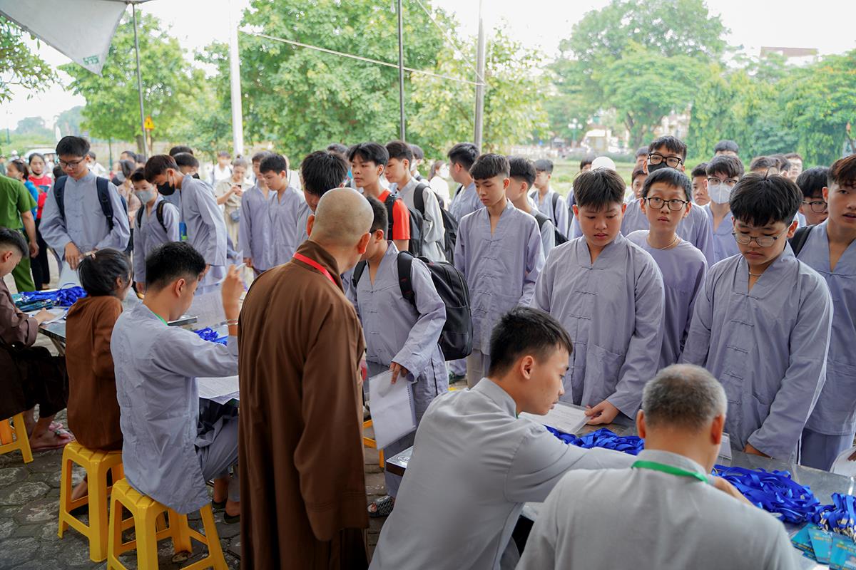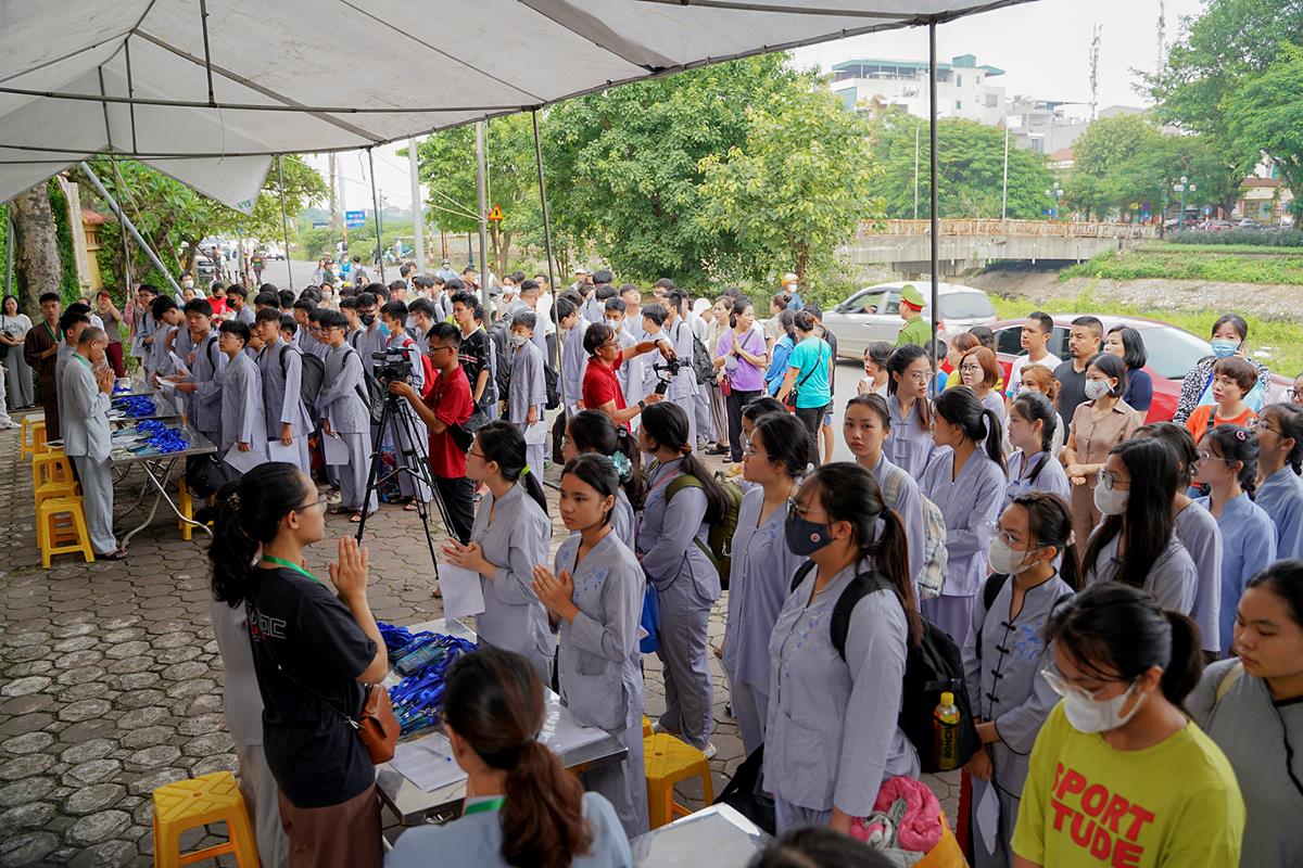 Ngoài cửa chùa, các khóa sinh trong màu áo lam dịu dàng đã có mặt từ sớm cùng các phụ huynh của mình, xếp hàng chờ làm thủ tục nhập chúng.