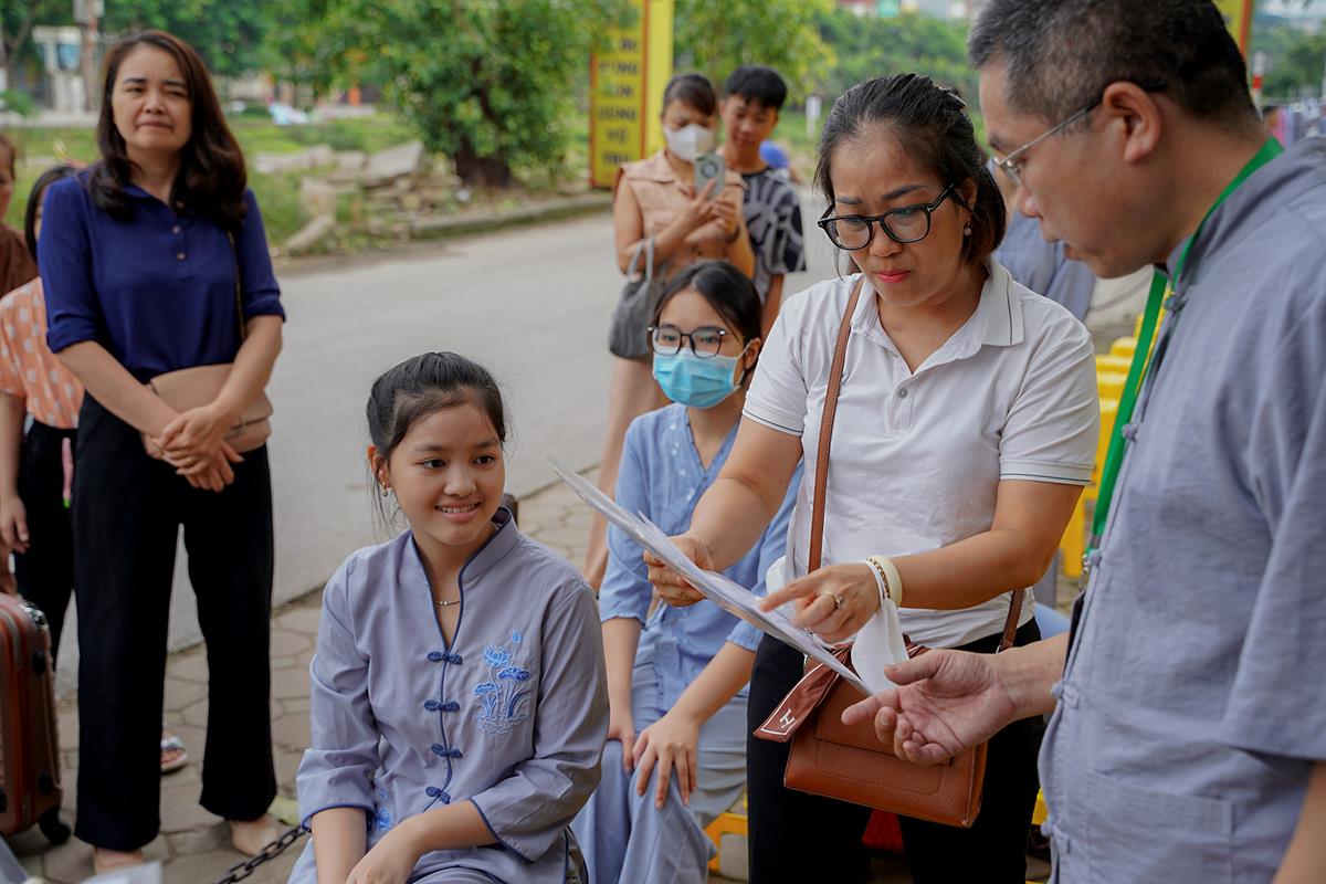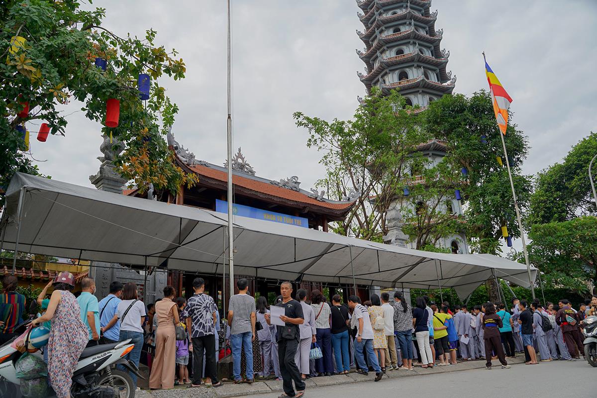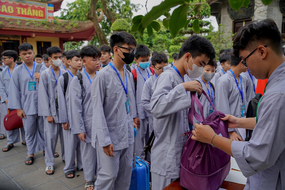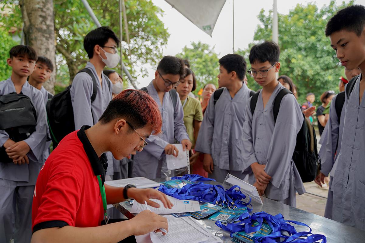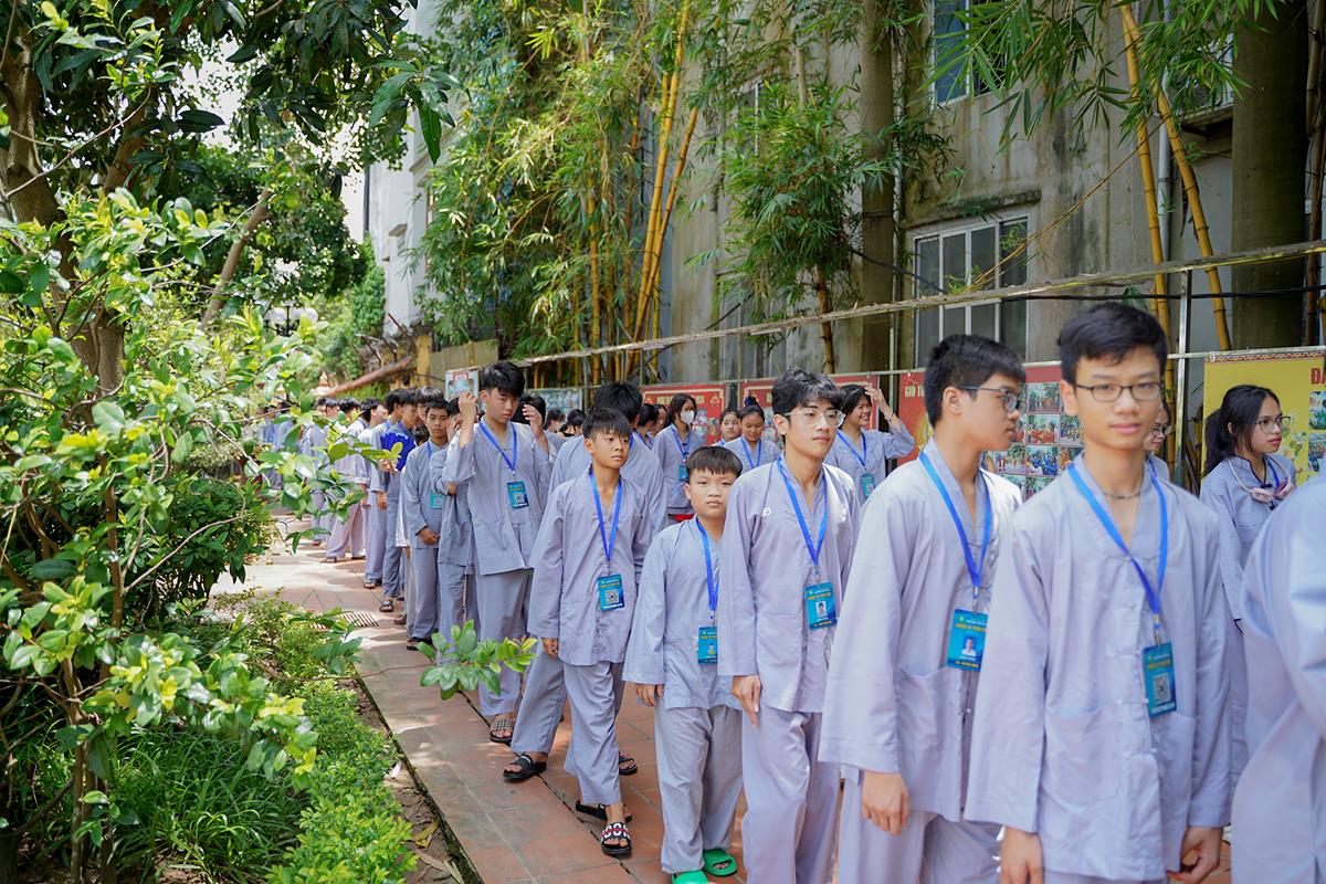 Ngoài cửa chùa, các khóa sinh trong màu áo lam dịu dàng đã có mặt từ sớm cùng các phụ huynh của mình, xếp hàng chờ làm thủ tục nhập chúng.