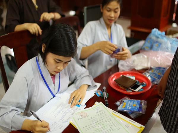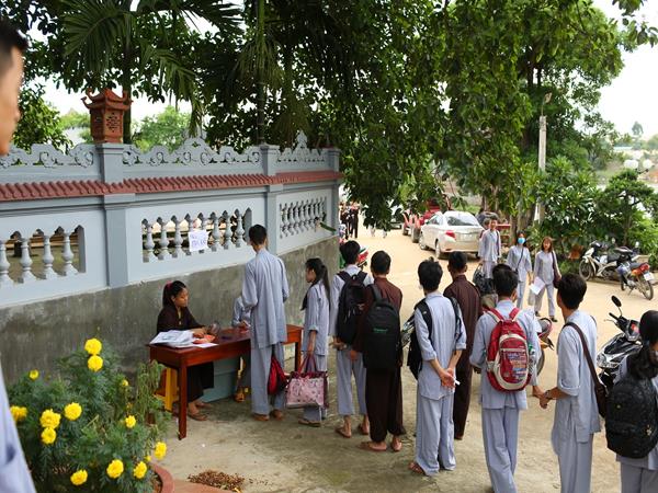 Ngay từ sáng sớm, số lượng khoá sinh và phụ huynh đã tập trung tại sân chùa để đón chờ đăng ký tham dự khoá tu. Đúng 7h00, dưới sự chỉ đạo trực tiếp của Đại đức Thích Tâm Hoà – trụ trì Chùa Hoà Phúc, ban tổ chức khoá tu mùa hè lần lượt hướng dẫn các bạn khoá sinh xếp hàng ổn định, đồng thời hướng dẫn hoàn thiện thủ tục đăng ký nhập khoá. Điểm mới trong công tác tổ chức đăng ký năm nay là khoá sinh tự tải mẫu đơn đăng ký tham dự khoá tu được nhà chùa công bố rộng rãi trên internet và tự hoàn thiện theo hướng dẫn. Đến 11h00, số lượng khoá sinh đăng ký tham dự đã chạm mốc 900, nhiều gần gấp đôi so với số lượng dự kiến ban đầu (500 khoá sinh). Để đảm bảo chất lượng cho khoá tu, nhà chùa đã đóng cổng đăng ký vào 11h00 cùng ngày.