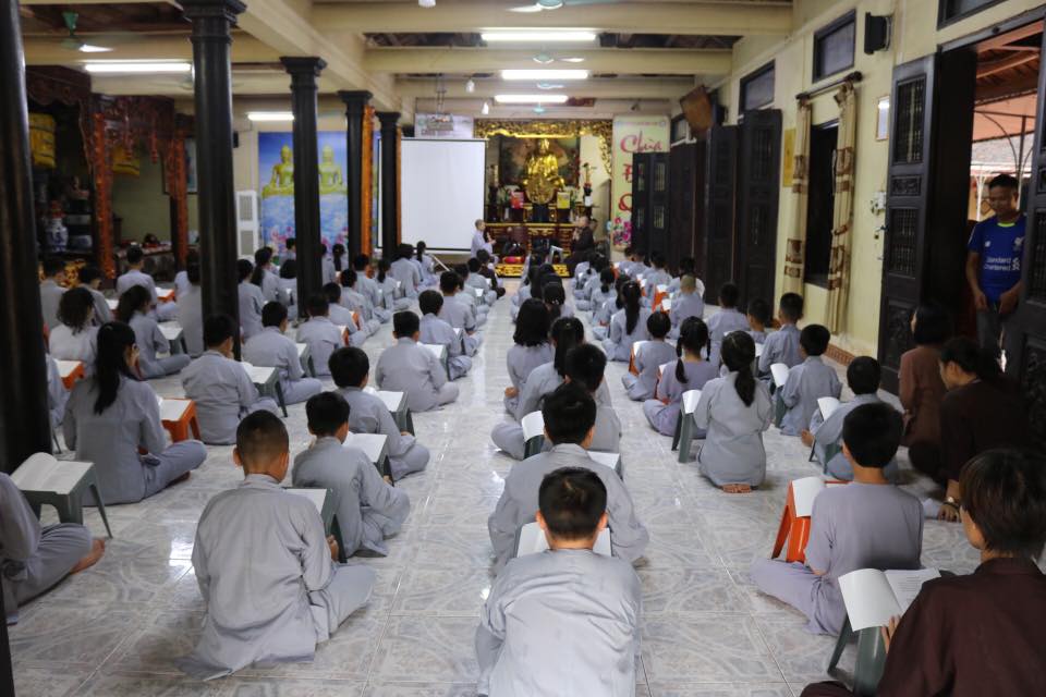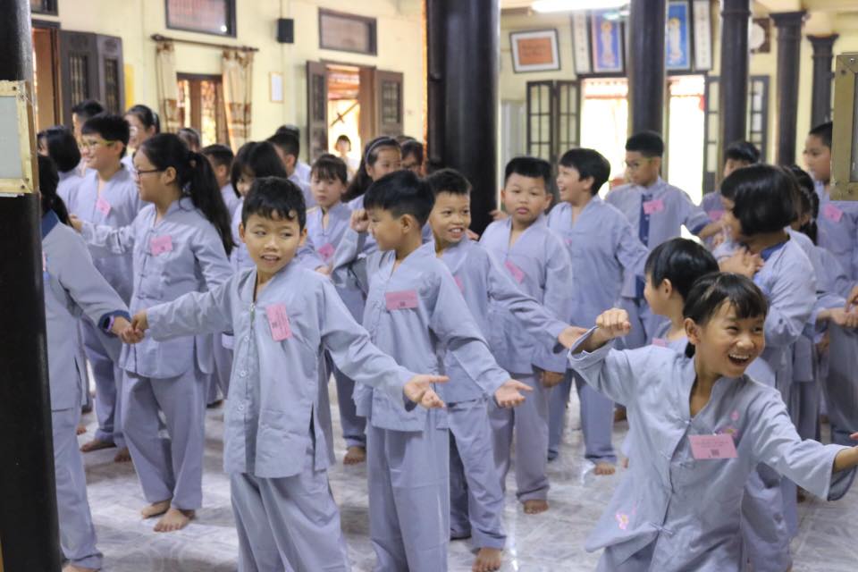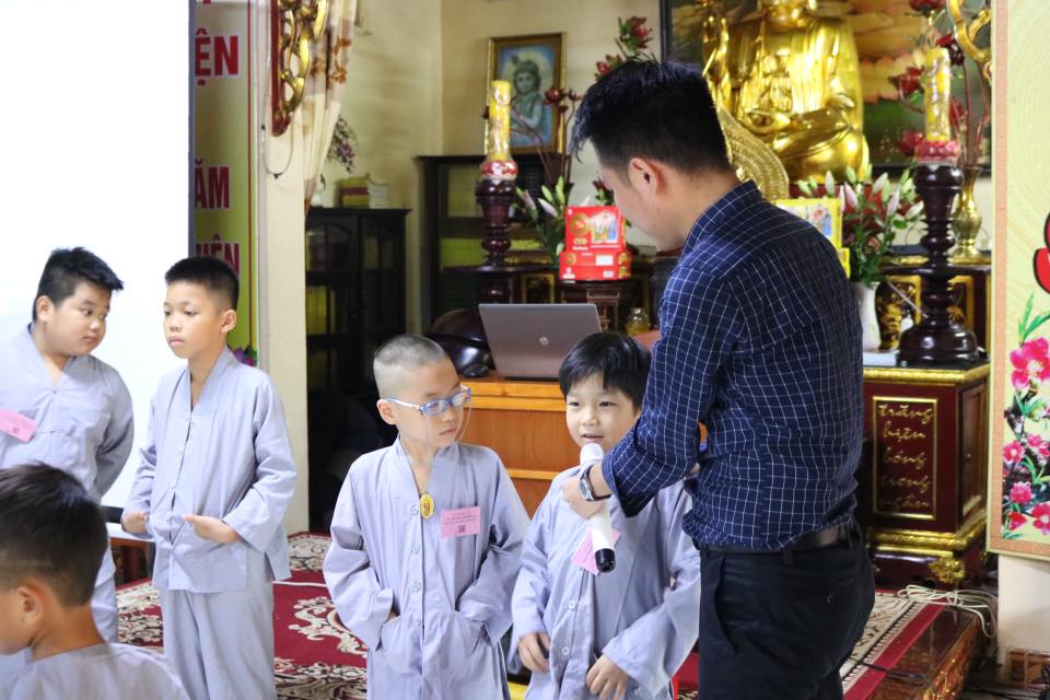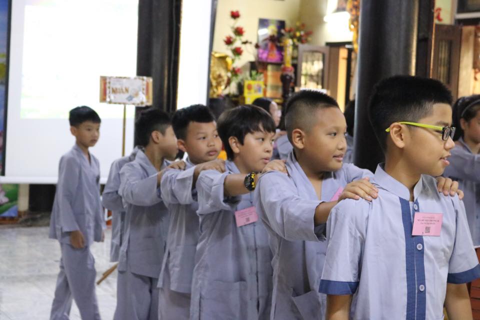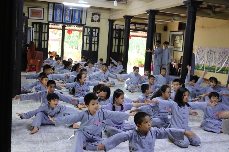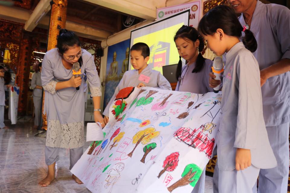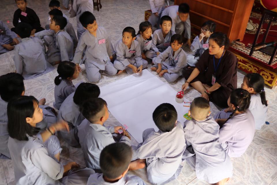 Thời khoá cuối buổi sáng là các trò chơi vui nhộn mà vẫn mang tính Phật giáo, kỹ năng làm bài nhóm và thuyết trình, kỹ năng bảo vệ môi trường và ngay sau buổi học các con được thực hành: từng đội nhóm chia nhau nhặt rác quanh khu vườn chùa vừa dứt cơn mưa xanh mướt, thật tuyệt vời