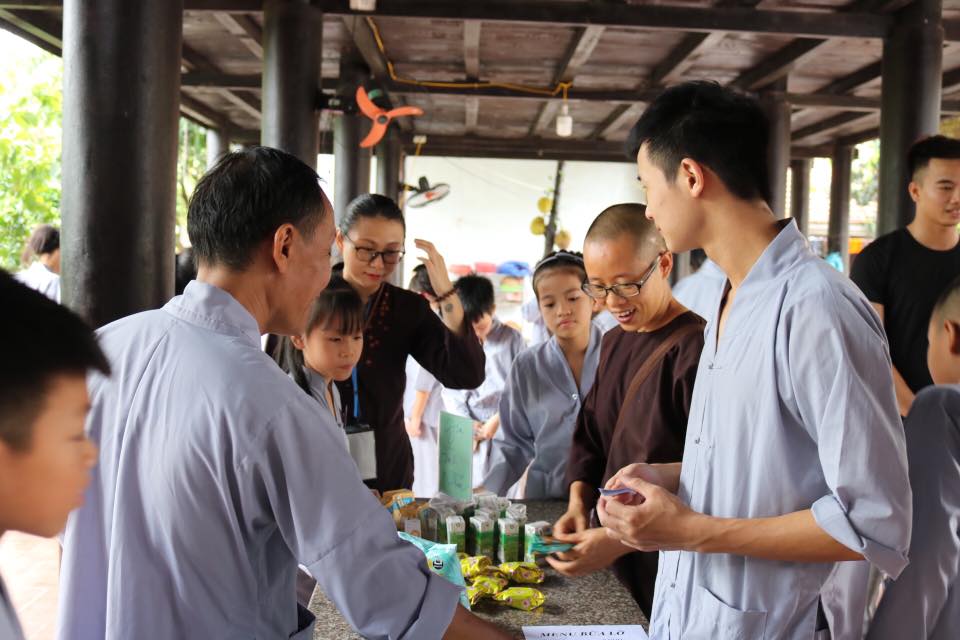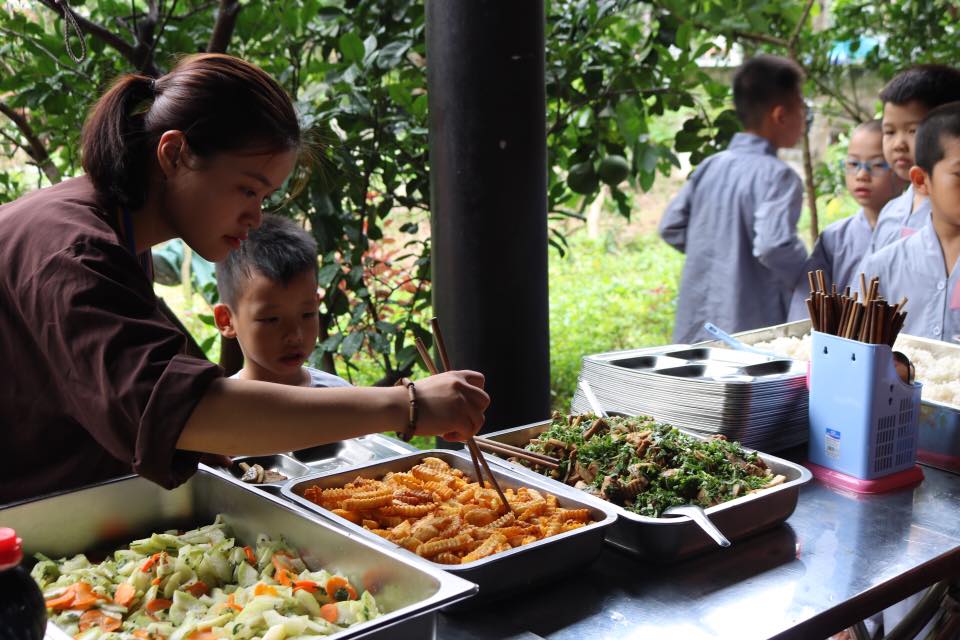 Các khoá sinh xếp hàng lấy đồ ăn để ăn trưa trong chính niệm. Các con được các quý Thầy giảng dạy về ơn nghĩa người làm ra hạt gạo, bát cơm, tri ân công sức các bà, các bác nhà bếp đã nấu nướng vất vả để các con có được bữa ăn ngon lành và ấm cúng.