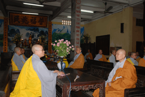 Đứng ngôi đường chủ HT. Thích Thanh Tứ – Viện chủ Tùng lâm Quán Sứ. Sau khoá lễ tụng kinh niệm Phật, HT. Thích Thanh Tứ thuyết giảng ý nghĩa và bổn phận người tu sĩ trong việc an cư kiết hạ. Hoà thượng mong muốn chư Tăng Ni trong 3 tháng an cư có điều kiện tu tập đoạn trừ nghiệp chướng, trưởng dưỡng đạo tâm. Đó là mục đích để thúc liễm thân tâm – trau dồi giới đức.