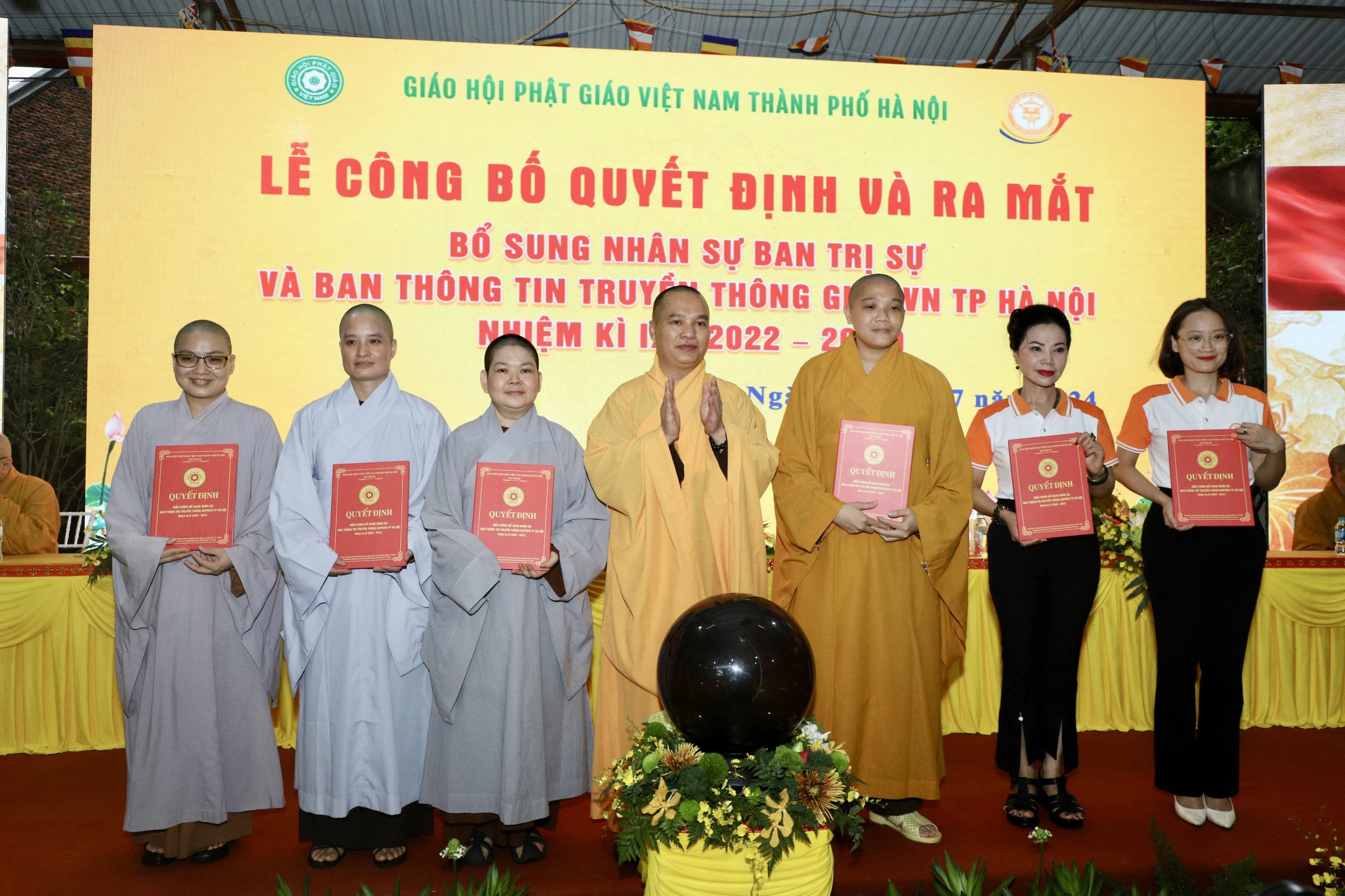 Hòa thượng Thích Bảo Nghiêm – Trưởng Ban Trị sự GHPGVN Tp Hà Nội trao quyết định bổ sung 6 ủy viên Ban Trị sự GHPGVN Tp Hà Nội bao gồm: Thượng tọa Thích Quảng Tiếp, Thượng tọa Thích Tiến Đức, Đại Đức Thích Nhân Từ, Đại Thích Bảo Phước, ĐĐ Thích Tuệ Hải, Ni Sư Thích Đàm Xuân.