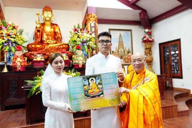 Cuối buổi lễ, Hòa thượng trụ trì và toàn thể đại chúng đã làm lễ cầu nguyện chúc phúc cho đôi trẻ “trăm năm tình viên mãn, bạc đầu nghĩa phu thê“.