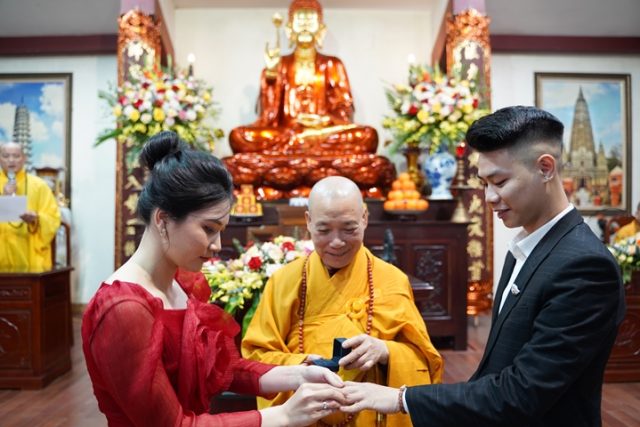 Tiếp theo, ba đôi bạn trẻ đã trao nhẫn cưới cho nhau trước sự chứng minh chúc phúc của chư tôn đức, cùng lễ tạ Tam Bảo, tạ ơn cha mẹ và hành lễ với nhau tôn trọng sự bình đẳng. Trong không gian thiêng liêng, ba đôi bạn trẻ đã đối trước chư tôn đức đọc lời thệ nguyện kết hôn.