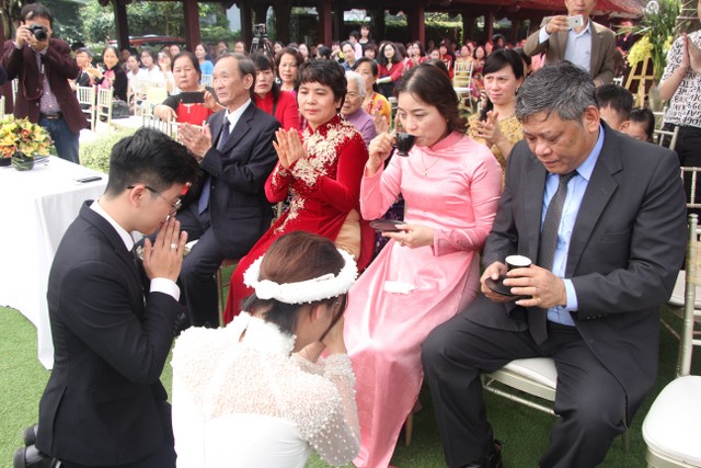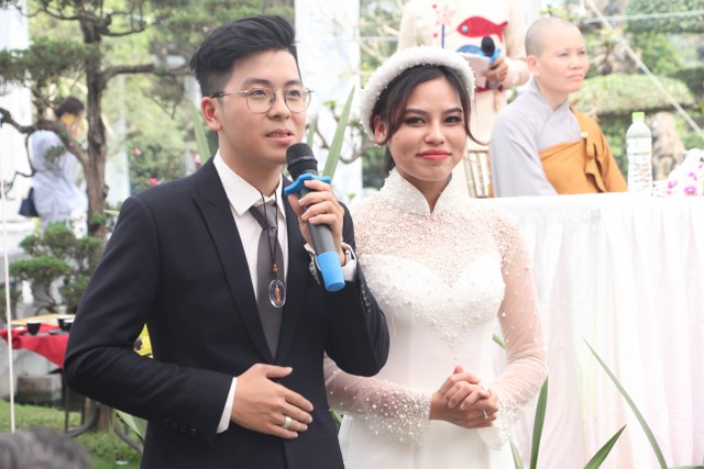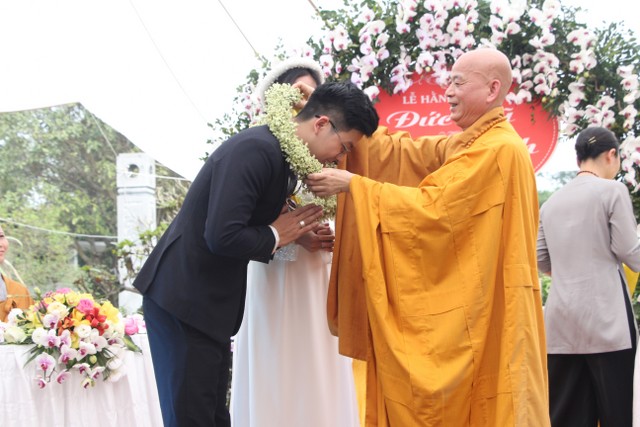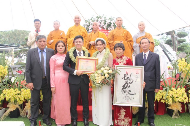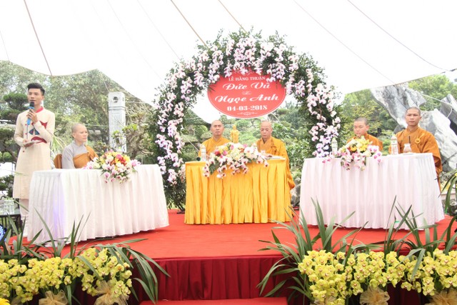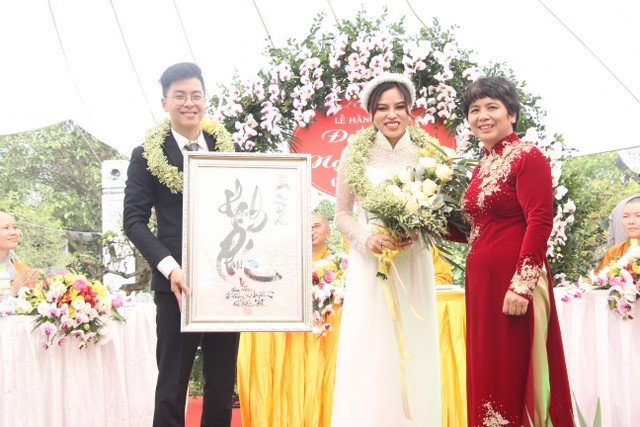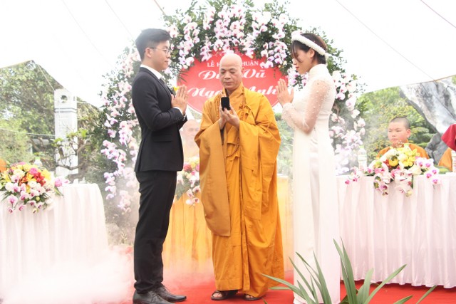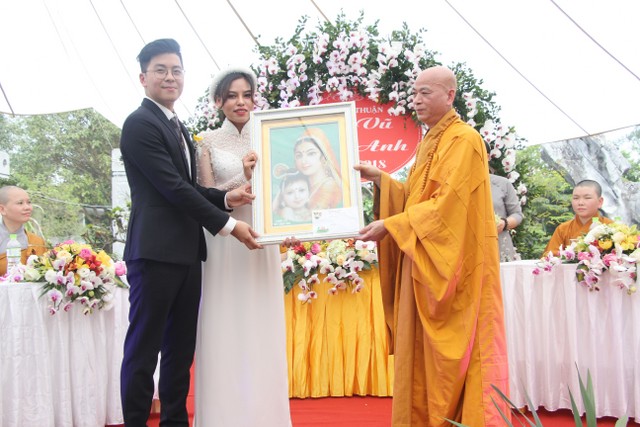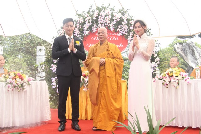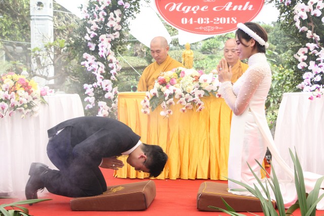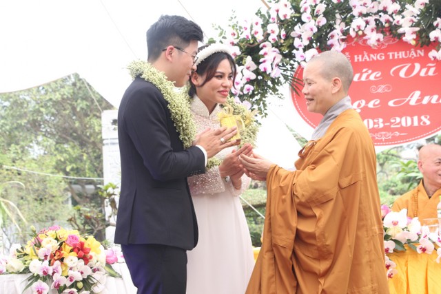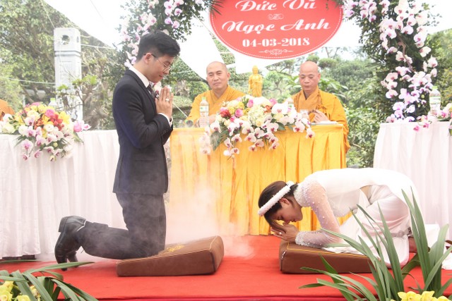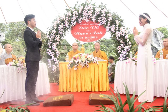 Đối trước chư tôn đức cùng họ hàng, bạn bè hai bên, hai bạn đã phát nguyện yêu thương nhau trọn đời, đỉnh lễ tôn trọng sự bình đẳng và ký vào bằng chứng nhận hằng thuận. Phần nghi lễ xúc động nhất trong chương trình là nghi thức tri ân cha mẹ. Hai bạn đã lần lượt lễ tạ công ơn sinh thành, dưỡng dục của song thân hai bên; dâng chén trà tỏ lòng hiếu kính. Sau đó, đích thân Thượng tọa trao nhẫn và trao quà cưới cho hai bạn. Trong niềm hoan hỷ của buổi lễ, quý Thầy đã khuyến tấn tân lang, tân nương phải sống trọn vẹn bổn phận làm vợ và làm chồng, làm dâu hiền, rể thảo cùng xây dựng hạnh phúc gia đình theo năm điều ứng xử của vợ và chồng trong kinh Thiện Sinh.