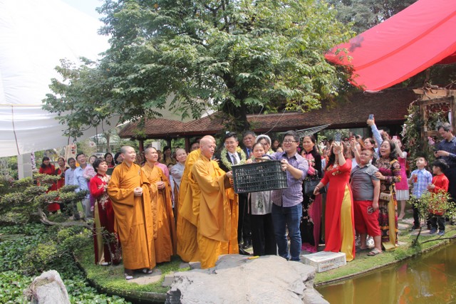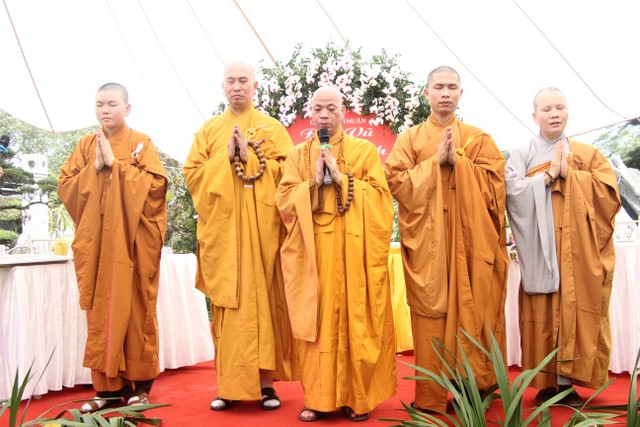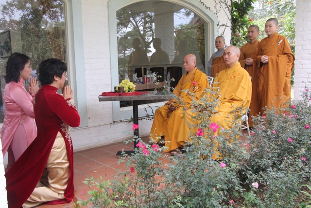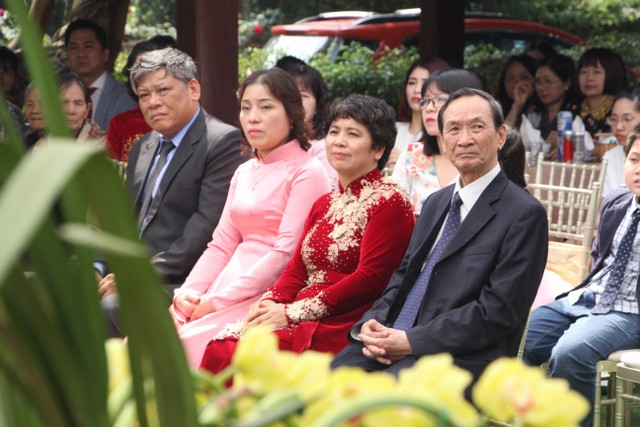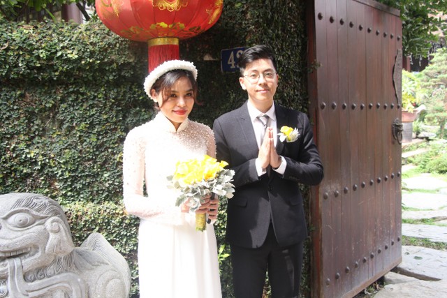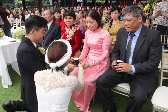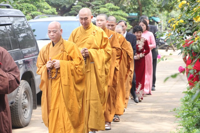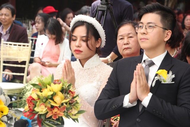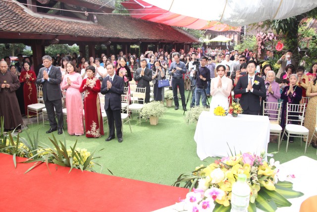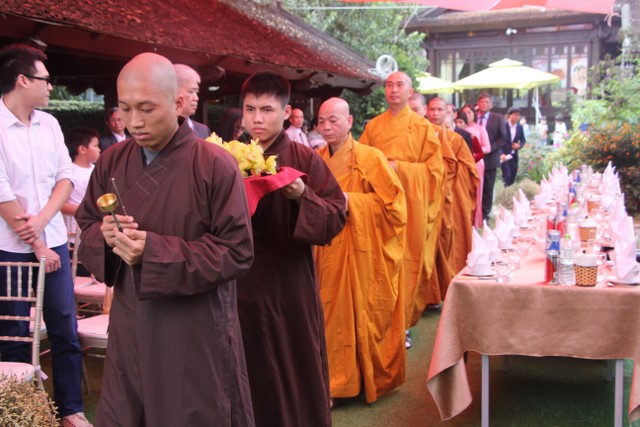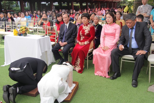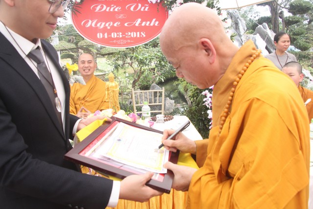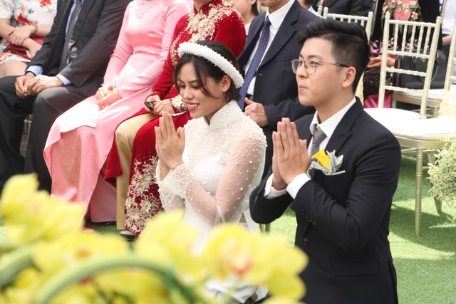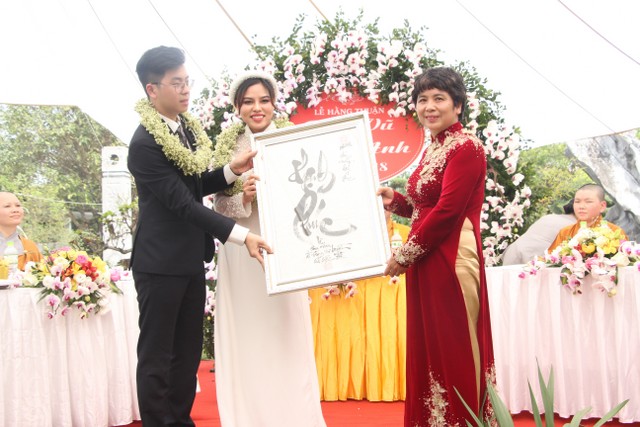 Đối trước chư tôn đức cùng họ hàng, bạn bè hai bên, hai bạn đã phát nguyện yêu thương nhau trọn đời, đỉnh lễ tôn trọng sự bình đẳng và ký vào bằng chứng nhận hằng thuận. Phần nghi lễ xúc động nhất trong chương trình là nghi thức tri ân cha mẹ. Hai bạn đã lần lượt lễ tạ công ơn sinh thành, dưỡng dục của song thân hai bên; dâng chén trà tỏ lòng hiếu kính. Sau đó, đích thân Thượng tọa trao nhẫn và trao quà cưới cho hai bạn. Trong niềm hoan hỷ của buổi lễ, quý Thầy đã khuyến tấn tân lang, tân nương phải sống trọn vẹn bổn phận làm vợ và làm chồng, làm dâu hiền, rể thảo cùng xây dựng hạnh phúc gia đình theo năm điều ứng xử của vợ và chồng trong kinh Thiện Sinh.