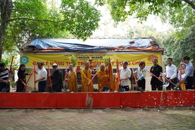 Trước khi kết thúc buổi lễ, chư tôn đức tăng ni và các Phật tử đã cử hành nghi lễ trì chú, niêm hương bạch Phật và xúc những xẻng cát đầu tiên, chính thức động thổ ngôi xây dựng ngôi Đại Hùng Bảo Điện chùa Khô trong không khí hoan hỷ, ấm tình đạo vị.