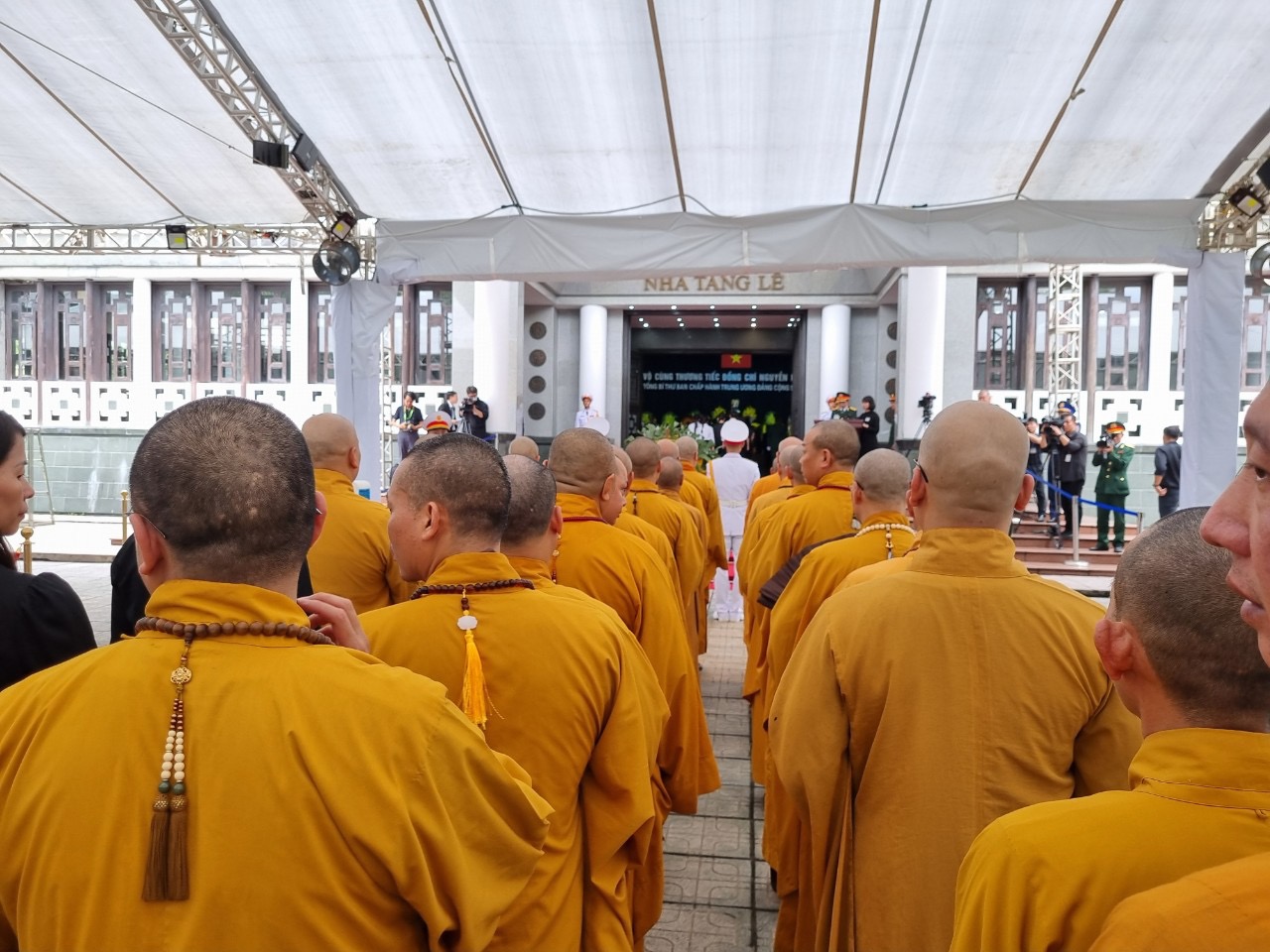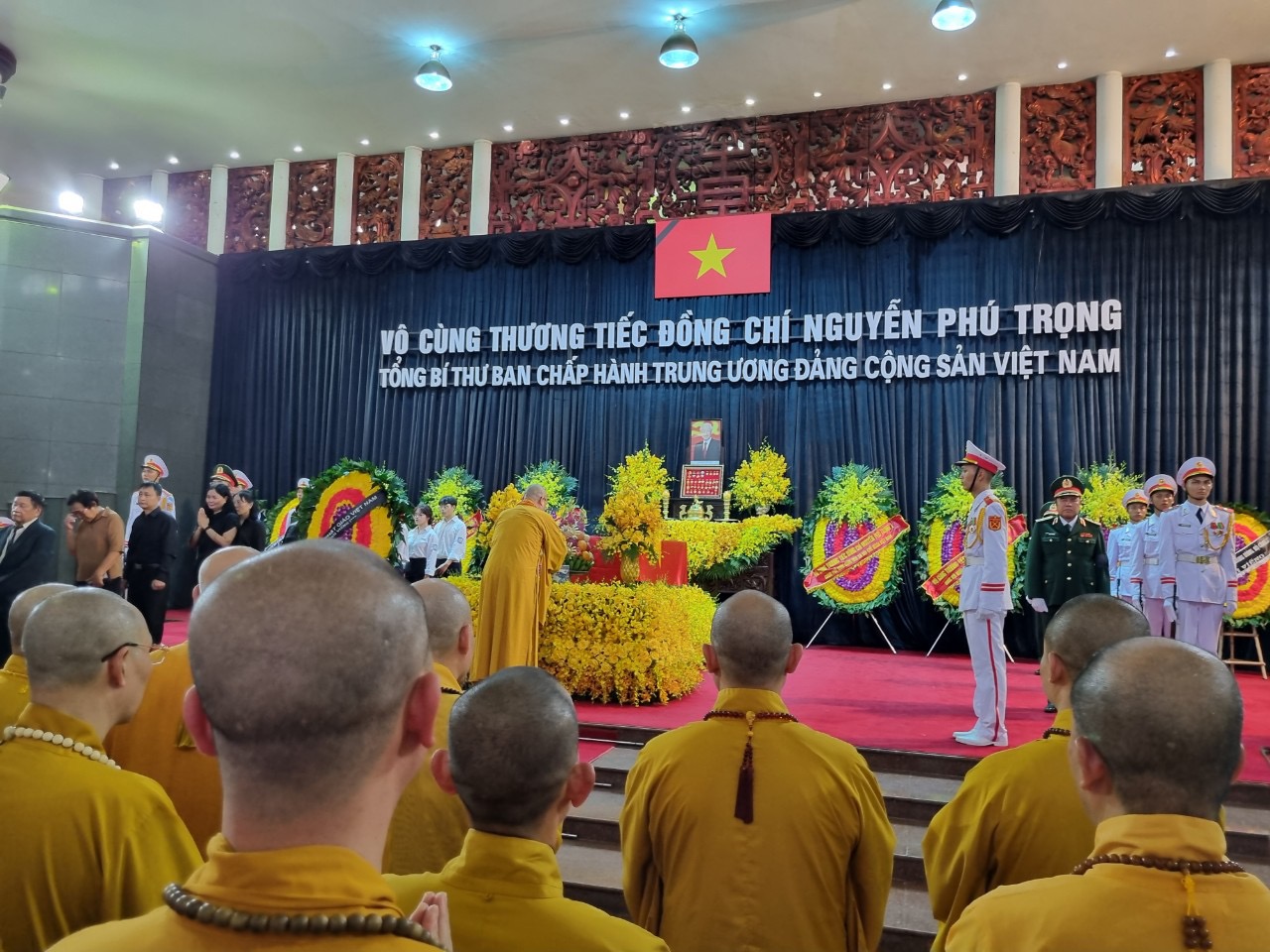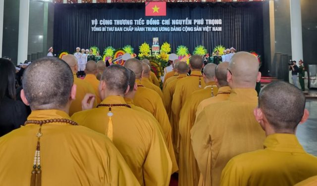 Chiều ngày 25/7/2024 Chư Tôn đức HĐTS GHPGVN kính viếng cố Tổng Bí thư Nguyễn Phú Trọng tại Nhà tang lễ Quốc gia số 5 Trần Thánh Tông, thành phố Hà Nội dẫn đầu phái đoàn GHPGVN có HT. Thích Thanh Nhiễu – Thành viên HĐCM – Phó chủ tịch TT HĐTS GHPGVN cùng chư tôn đức HĐTS GHPVN, BTS GHPGVN các tỉnh thành, đại diện các đạo tràng Phật tử trong cả nước cùng vào kính viếng.