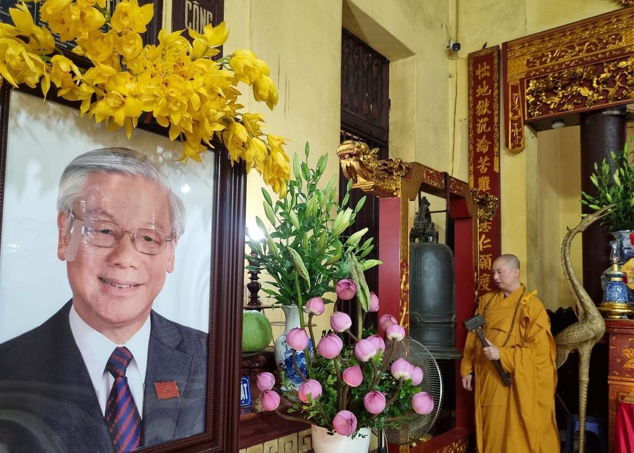 Tại Trung ương Giáo hội Phật giáo Việt Nam cùng chư Tăng hạ trường Tùng lâm Quán Sứ trang nghiêm, thành kính tụng kinh tưởng niệm anh linh cố Tổng Bí thư Nguyễn Phú Trọng tại tam bảo chùa Quán Sứ.