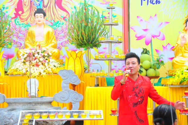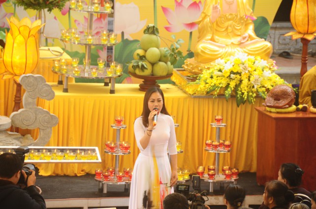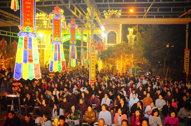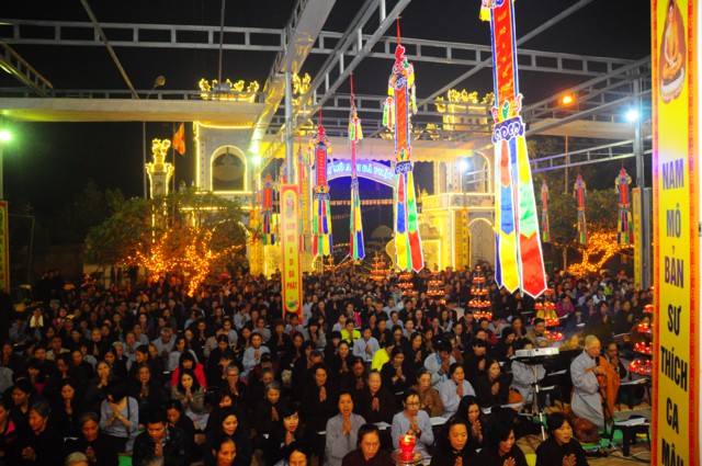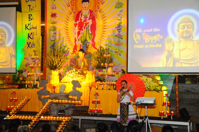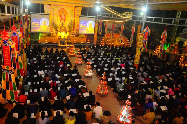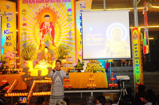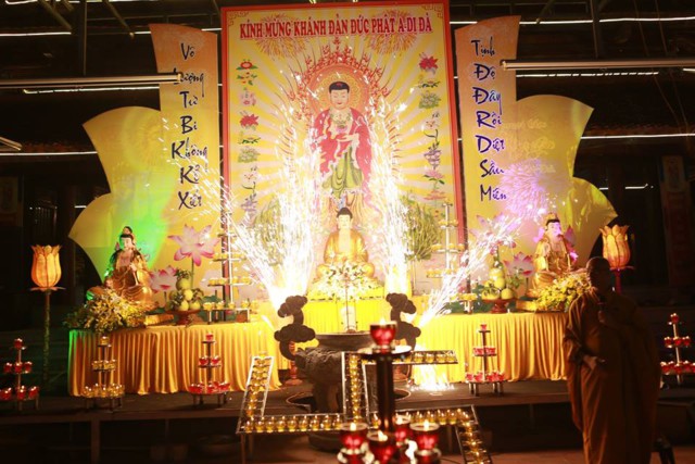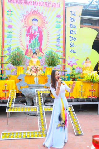 Vào tối ngày 10/12/2016 ( 12/11/Bính Thân), Đại đức Thích Quảng Hiếu đã cùng hơn 1000 Phật tử, nhân dân địa phương tổ chức chương trình văn nghệ, đêm hoa đăng kính mừng khánh đản Đức Phật A Di Đà. Đêm văn nghệ có sự tham gia của các nghệ sỹ, diễn viên đến từ đoàn chèo, đoàn cải lương thành phố Hà Nội. Buổi lễ đã diễn ra trong không khí trang nghiêm thành kính qua khóa lễ tụng kinh A Di Đà và xưng tán 48 lời phát nguyện của Đức Phật A Di Đà. Mỗi một lời phát nguyện được chư Tăng xướng lên là toàn thể đại chúng lại cất vang tiếng niệm hồng danh Đức Phật A Di Đà trong không khí linh thiêng, trầm hùng, tha thiết xuất phát từ cái tâm thanh tịnh, cái tâm thành kính nhất để kính dâng lên Đức Phật A Di Đà nhân kỷ niệm ngày Ngài giáng trần. Khóa lễ tụng kinh A Di Đà, xưng tán 48 lời phát nguyện đã để lại rất nhiều ấn tượng, nhiều cảm xúc trong lòng mỗi người con Phật khi được tham dự khóa lễ đầy ý nghĩa này.