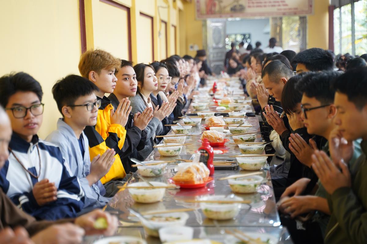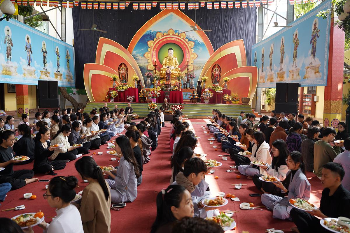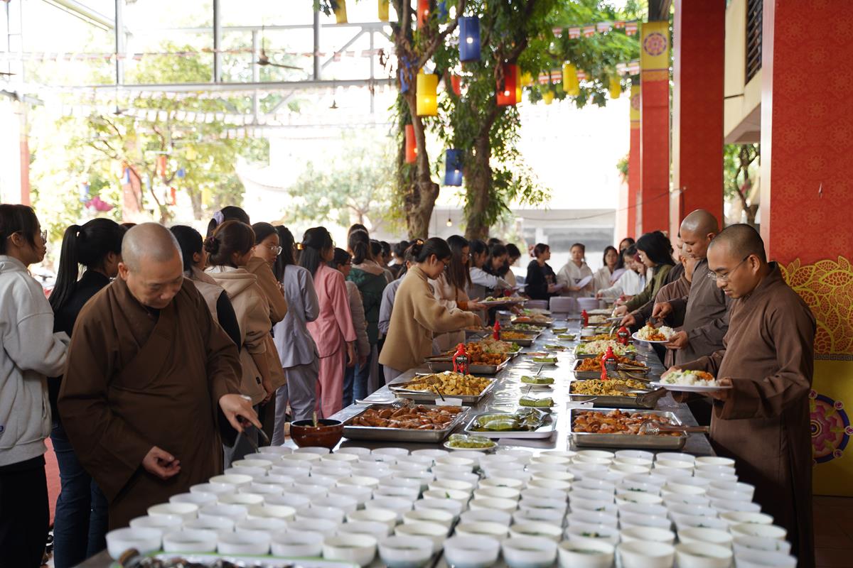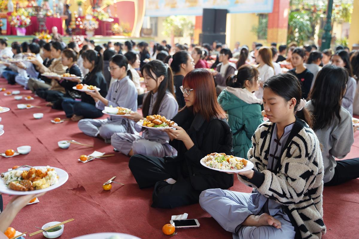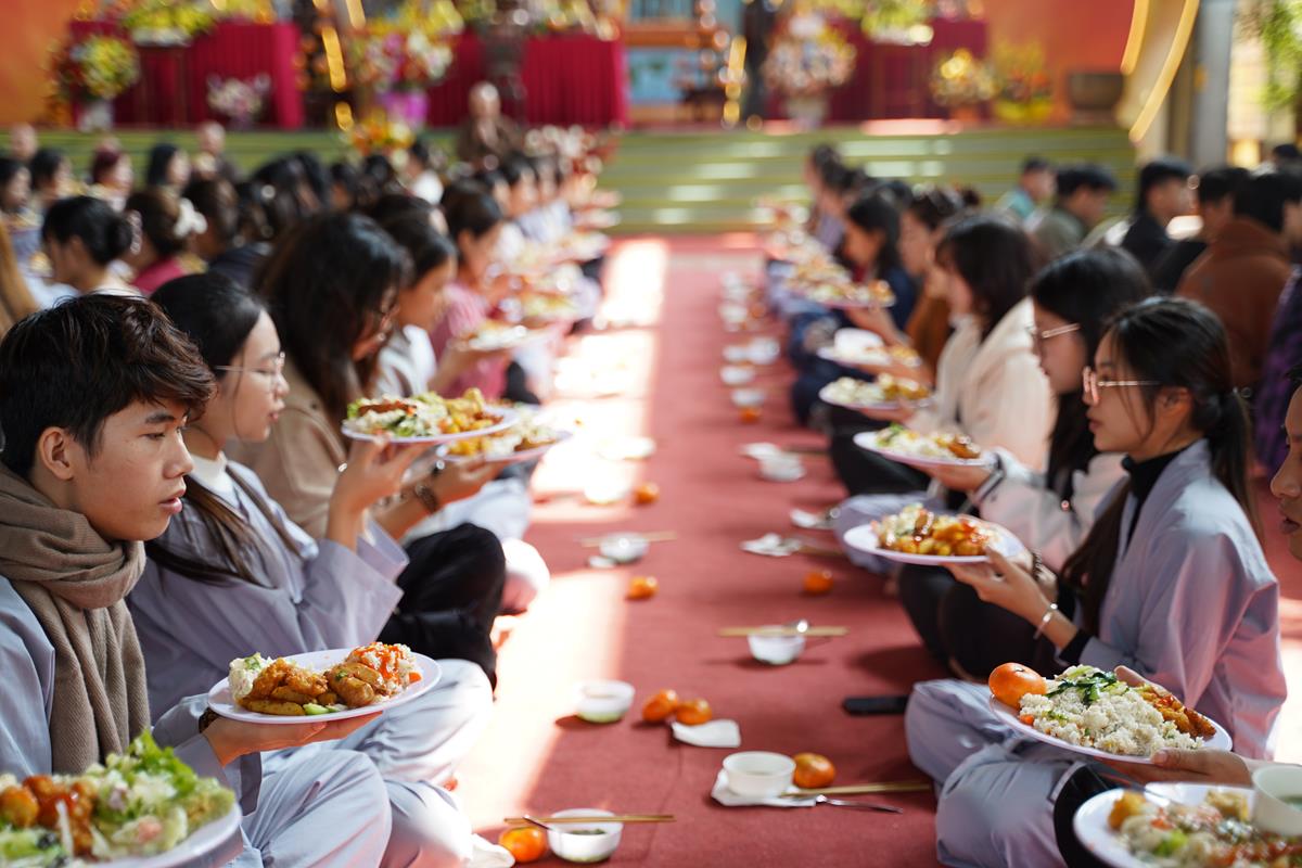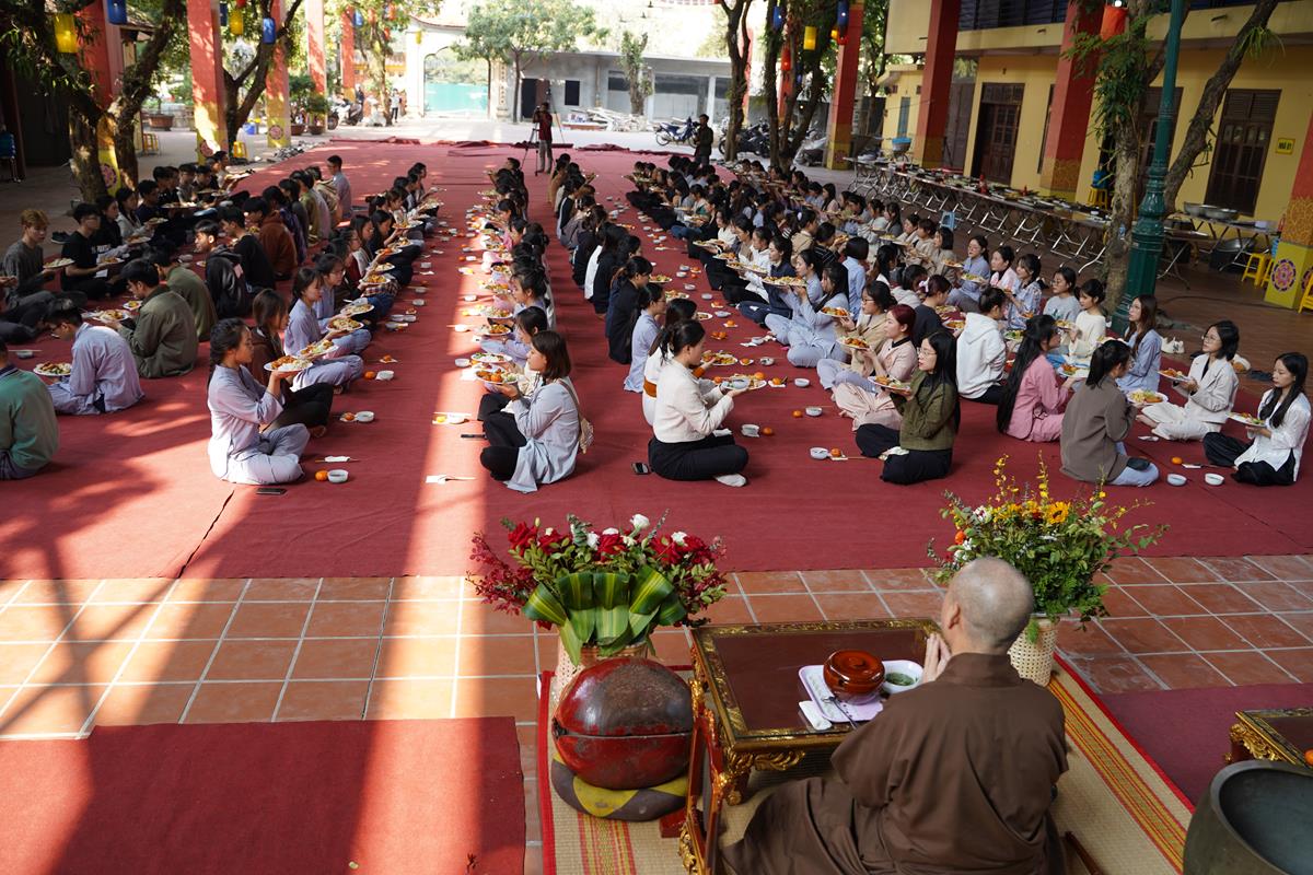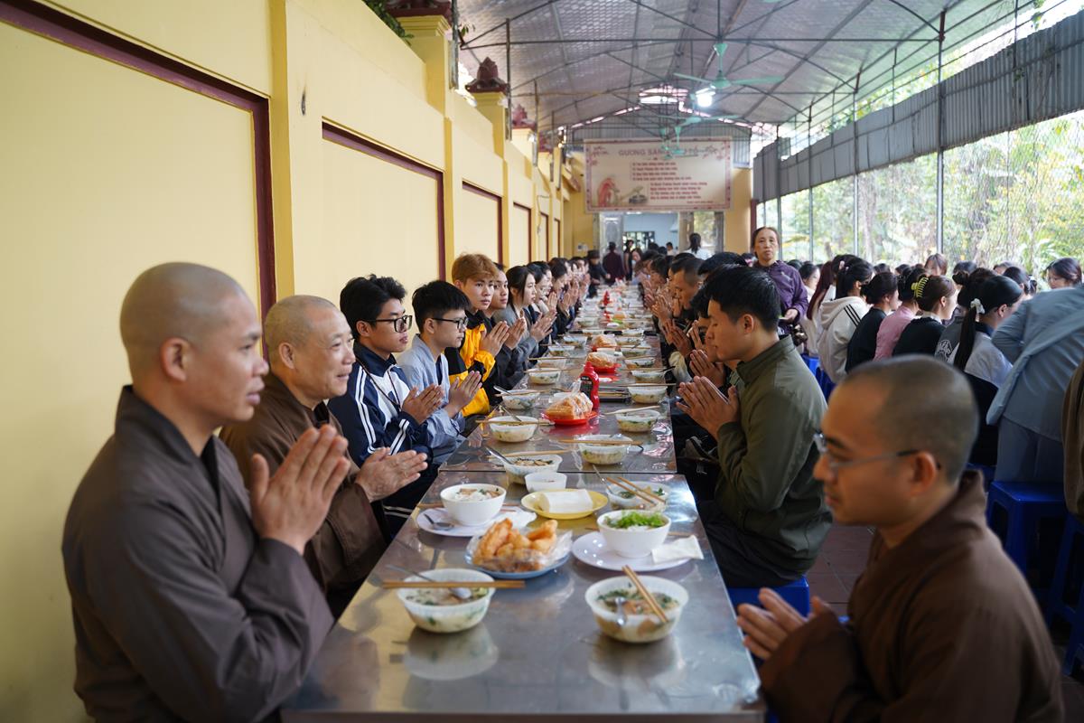 Buổi trưa, các khóa sinh đã cùng Hòa thượng trụ trì và chư Tôn đức Tăng thực hiện nghi thức dâng cơm dâng trà cúng Tam Bảo, Tổ tiên, sau đó dùng bữa cơm chay ấm cúng, mở đầu một năm mới viên mãn, bình yên. Trước khi các bạn trở về với gia đình, với cuộc sống bộn bề công việc và học tập, Hòa thượng trụ trì Thích Bảo Nghiêm đã có lời động viên tinh thần các bạn trẻ. Hòa thượng mong rằng các bạn khóa sinh sẽ khép lại quá khứ để mở cửa tương lai, mỗi điều chúng ta đã trải qua chính là bài học và kinh nghiệm để chúng ta vững bước ở tương lai. Vì vậy, mong các bạn hãy nỗ lực và cố gắng, vận dụng những điều đã học được ở khóa tu này để áp dụng vào cuộc sống thường ngày để cân bằng cảm xúc, không rơi vào bế tắc hay khủng hoảng tâm lý, luôn an vui và lạc quan, để kiến tạo một cuộc sống hạnh phúc. Những lời dạy quý báu của Hòa thượng đã khép lại khóa tu mừng năm mới 2024 thành tựu và tràn đầy hỷ lạc.
