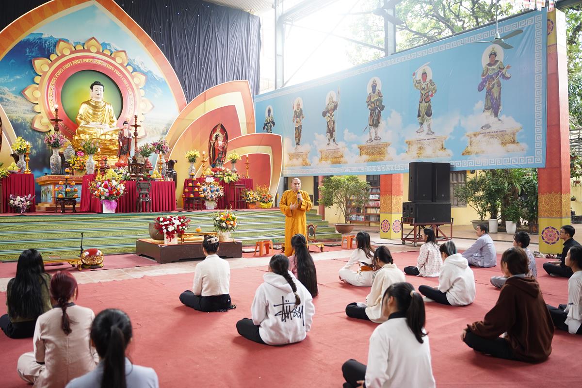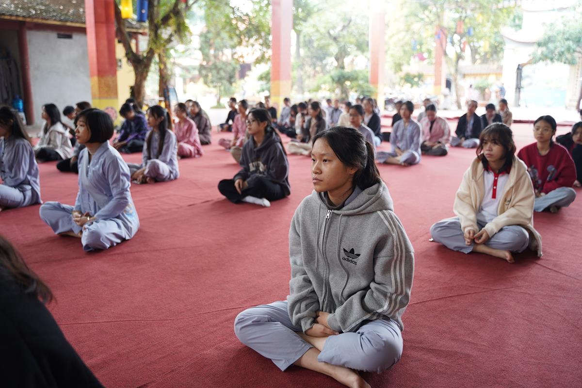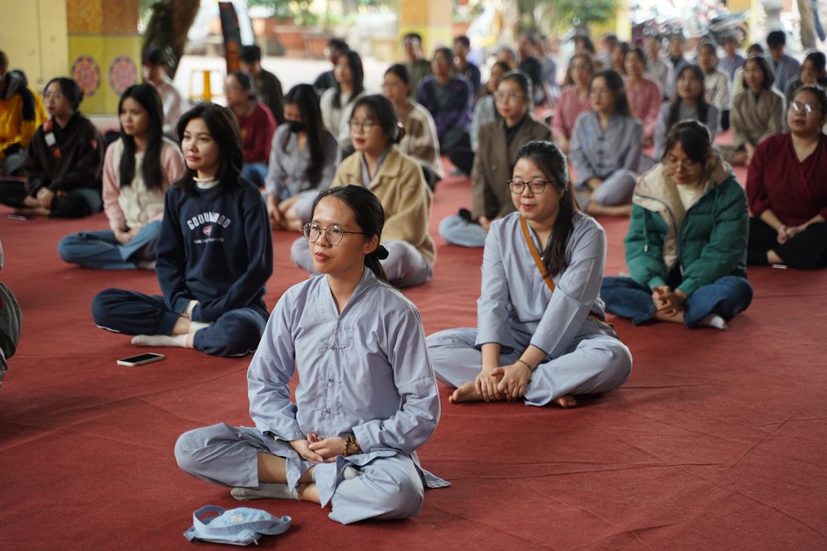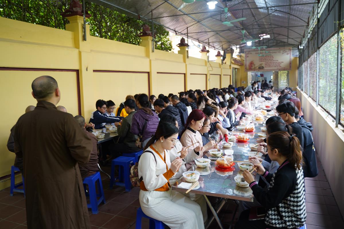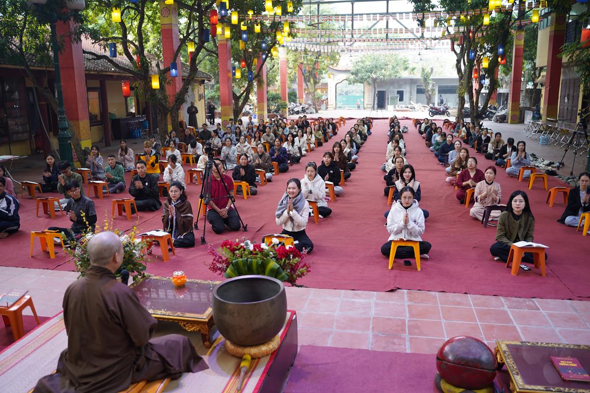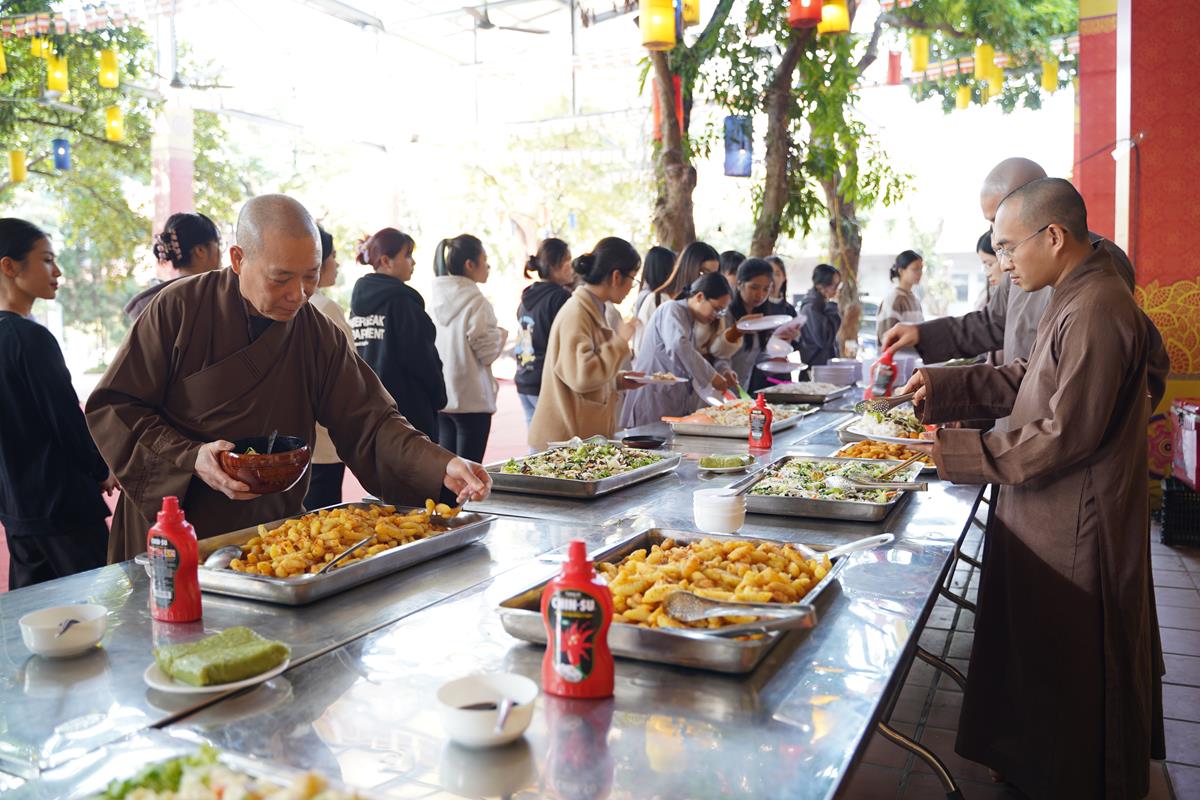 Buổi trưa, các khóa sinh đã cùng Hòa thượng trụ trì và chư Tôn đức Tăng thực hiện nghi thức dâng cơm dâng trà cúng Tam Bảo, Tổ tiên, sau đó dùng bữa cơm chay ấm cúng, mở đầu một năm mới viên mãn, bình yên. Trước khi các bạn trở về với gia đình, với cuộc sống bộn bề công việc và học tập, Hòa thượng trụ trì Thích Bảo Nghiêm đã có lời động viên tinh thần các bạn trẻ. Hòa thượng mong rằng các bạn khóa sinh sẽ khép lại quá khứ để mở cửa tương lai, mỗi điều chúng ta đã trải qua chính là bài học và kinh nghiệm để chúng ta vững bước ở tương lai. Vì vậy, mong các bạn hãy nỗ lực và cố gắng, vận dụng những điều đã học được ở khóa tu này để áp dụng vào cuộc sống thường ngày để cân bằng cảm xúc, không rơi vào bế tắc hay khủng hoảng tâm lý, luôn an vui và lạc quan, để kiến tạo một cuộc sống hạnh phúc. Những lời dạy quý báu của Hòa thượng đã khép lại khóa tu mừng năm mới 2024 thành tựu và tràn đầy hỷ lạc.