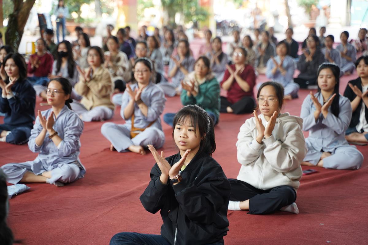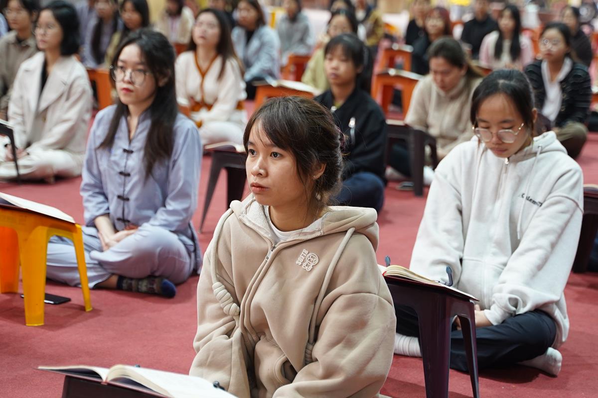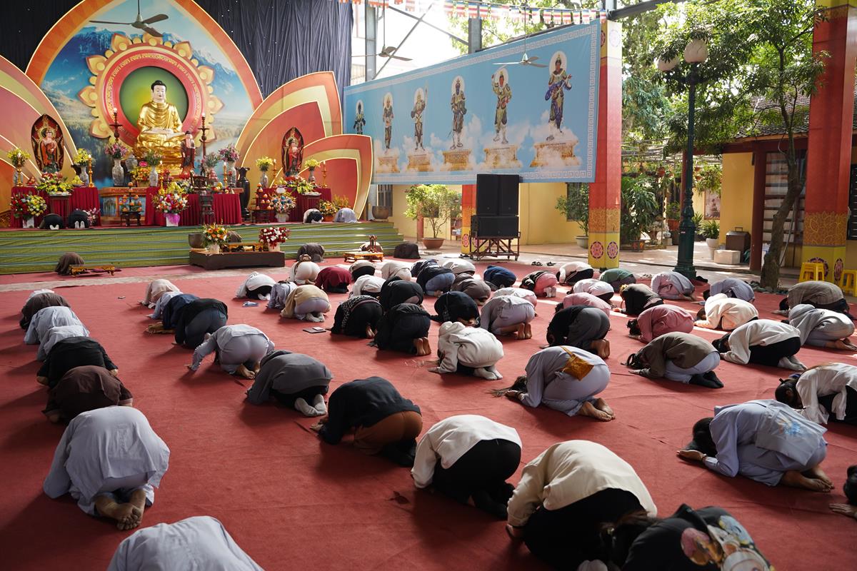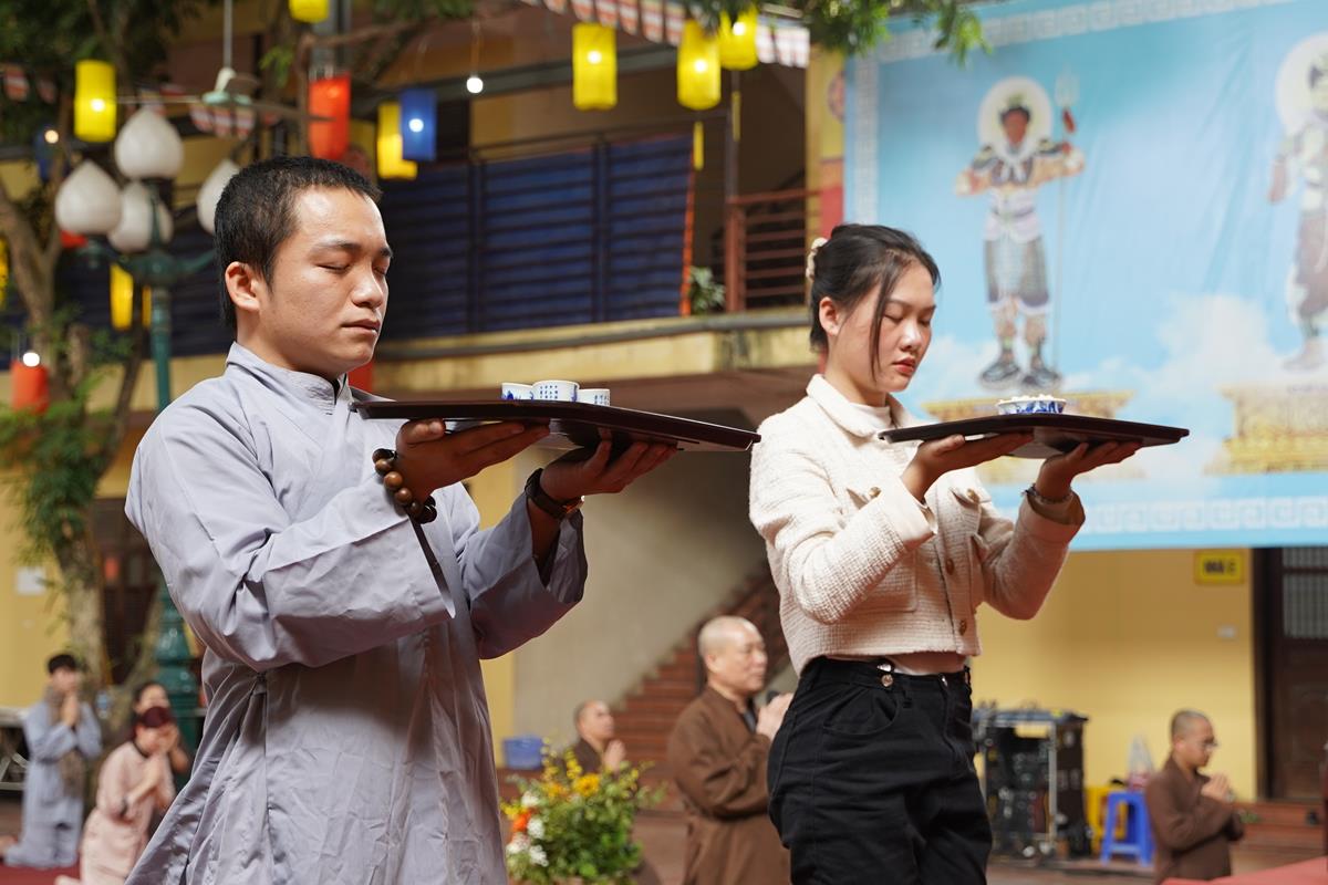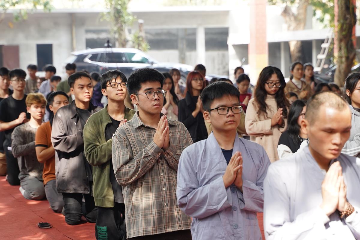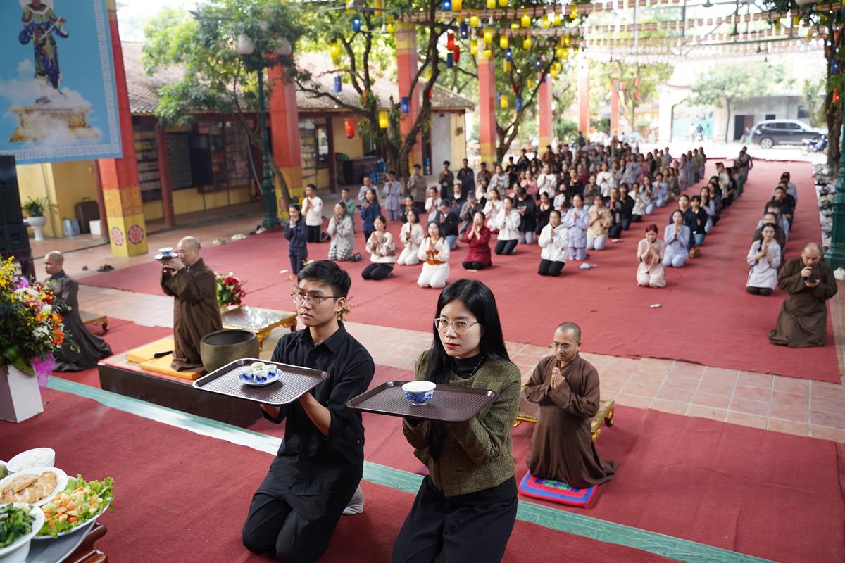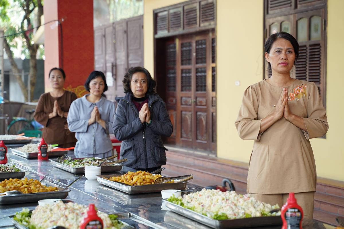 Buổi trưa, các khóa sinh đã cùng Hòa thượng trụ trì và chư Tôn đức Tăng thực hiện nghi thức dâng cơm dâng trà cúng Tam Bảo, Tổ tiên, sau đó dùng bữa cơm chay ấm cúng, mở đầu một năm mới viên mãn, bình yên. Trước khi các bạn trở về với gia đình, với cuộc sống bộn bề công việc và học tập, Hòa thượng trụ trì Thích Bảo Nghiêm đã có lời động viên tinh thần các bạn trẻ. Hòa thượng mong rằng các bạn khóa sinh sẽ khép lại quá khứ để mở cửa tương lai, mỗi điều chúng ta đã trải qua chính là bài học và kinh nghiệm để chúng ta vững bước ở tương lai. Vì vậy, mong các bạn hãy nỗ lực và cố gắng, vận dụng những điều đã học được ở khóa tu này để áp dụng vào cuộc sống thường ngày để cân bằng cảm xúc, không rơi vào bế tắc hay khủng hoảng tâm lý, luôn an vui và lạc quan, để kiến tạo một cuộc sống hạnh phúc. Những lời dạy quý báu của Hòa thượng đã khép lại khóa tu mừng năm mới 2024 thành tựu và tràn đầy hỷ lạc.