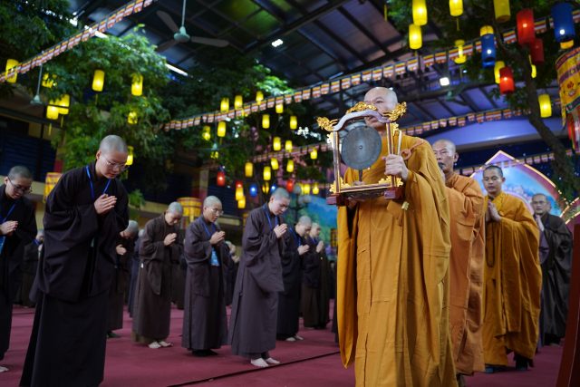 Sau đó, trong không khí trang nghiêm thanh tịnh, các giới tử đã bước vào thời khóa sám nguyện nhiễu Phật. Từng tiếng niệm “Nam Mô A Di Đà Phật” âm vang trầm hùng nơi lễ đường, các giới tử đã bước từng bước chân an nhiên, tự tại và vững chãi nhiễu Phật để lắng đọng tâm tư hướng lòng thành về Đức Thế Tôn – vị Thầy của ba cõi, người cha lành của bốn loài.