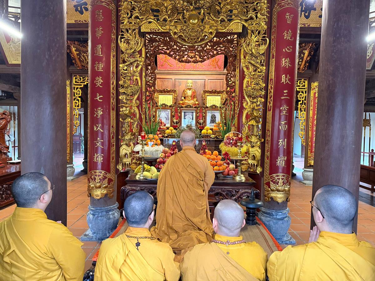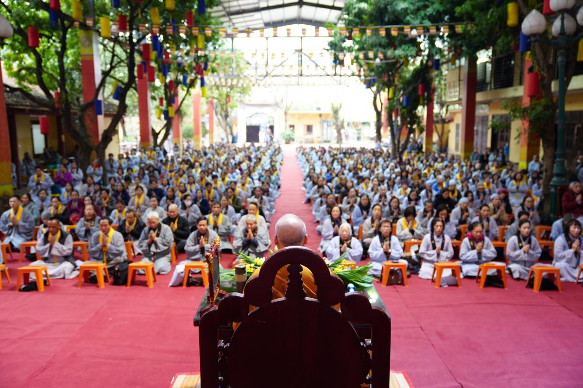 Ngay từ sáng sớm, Thượng tọa Thích Chiếu Tuệ – Ủy viên HĐTS, Phó Trưởng ban Thường trực Ban Hoằng pháp TW, Trưởng ban Hoằng pháp GHPGVN Tp. Hà Nội, Trưởng Ban cố vấn Đạo tràng Pháp Hoa miền Bắc đã làm lễ niêm hương bạch Phật, yết Tổ và và đăng đàn truyền giới cho các hành giả tu tập Bát Quan Trai giới trong ngày tu này.
