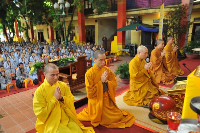 Đúng 7h30′ sáng, Hòa thượng trụ trì Thích Bảo Nghiêm đã làm lễ niêm hương bạch Phật và đăng đàn truyền giới cho hành giả tu tập Bát Quan Trai giới trong ngày tu này.
