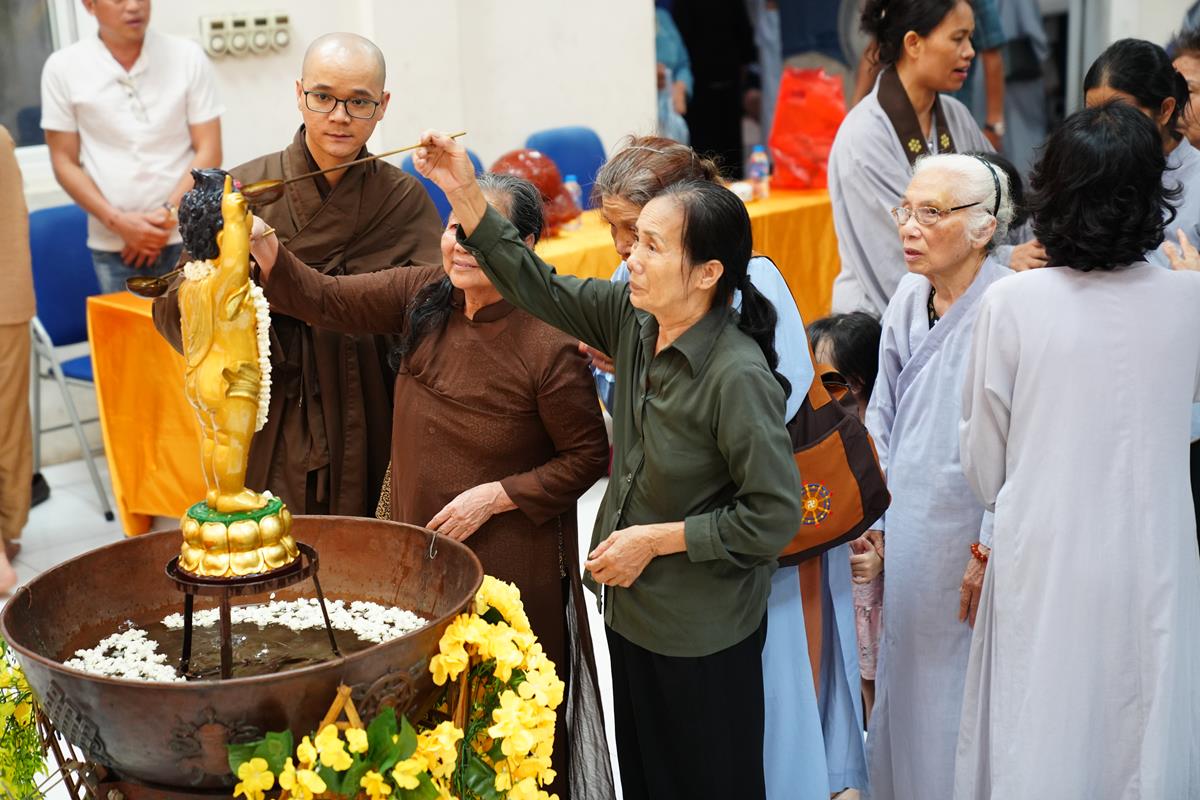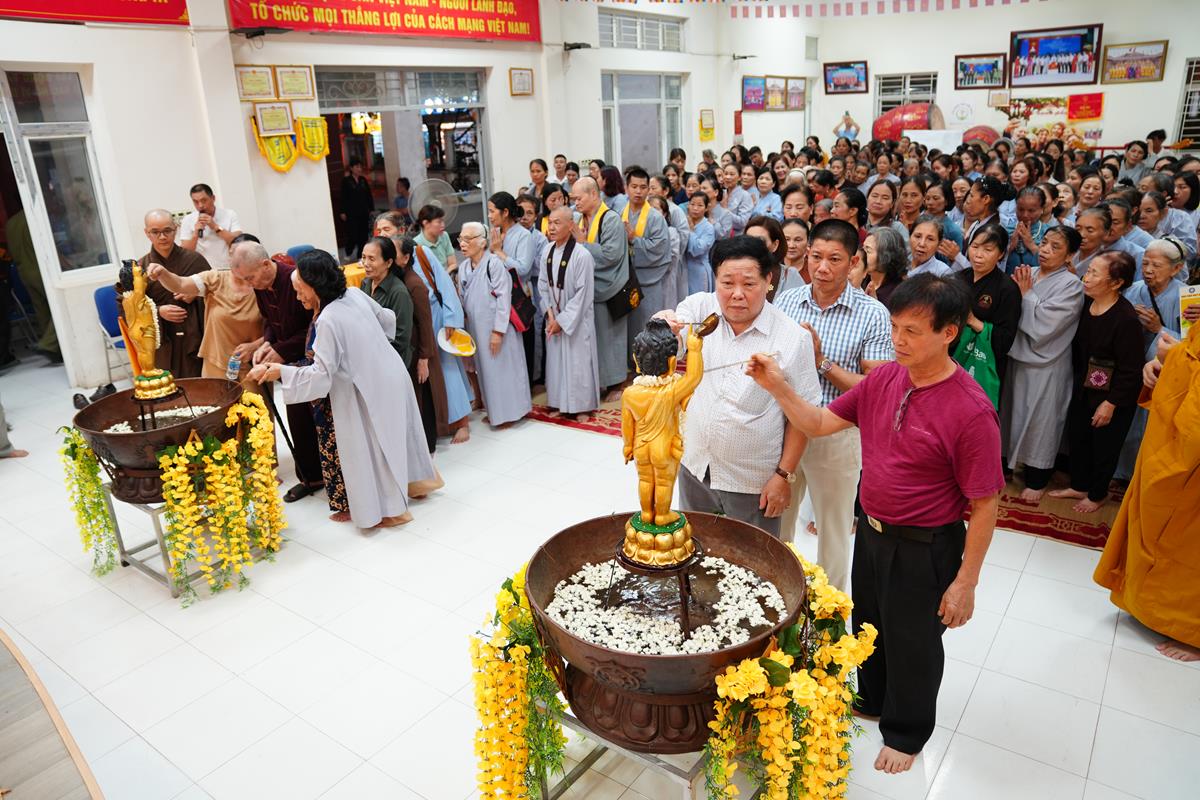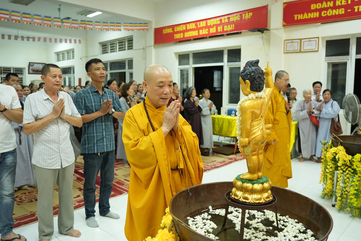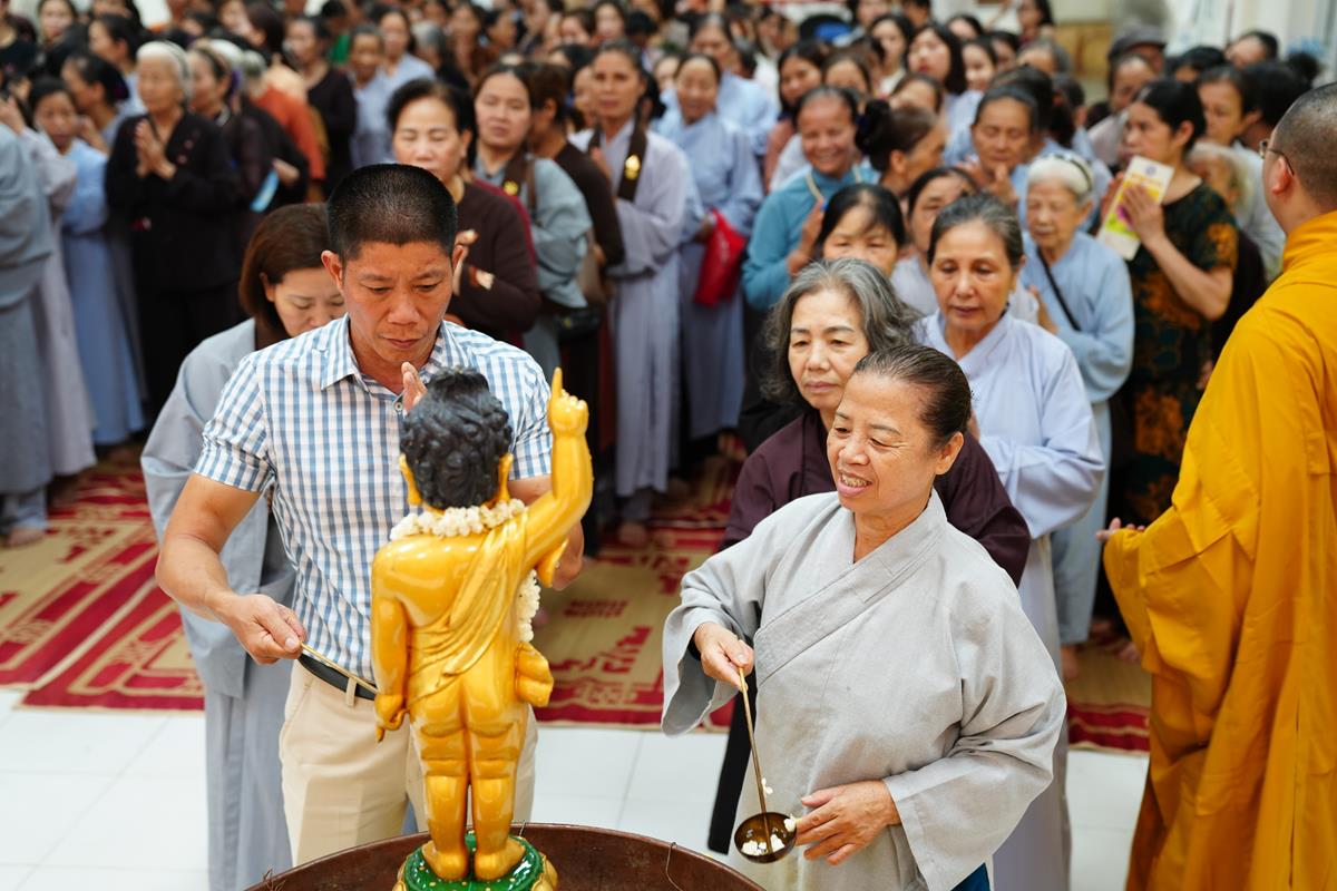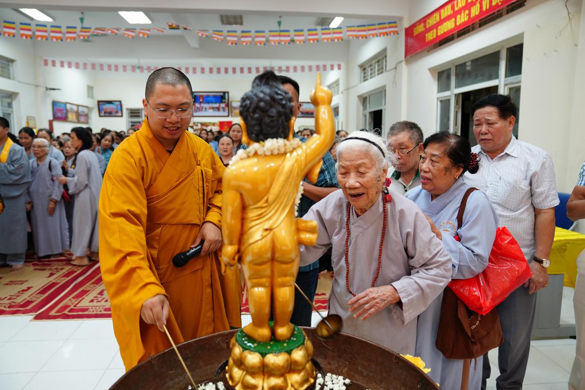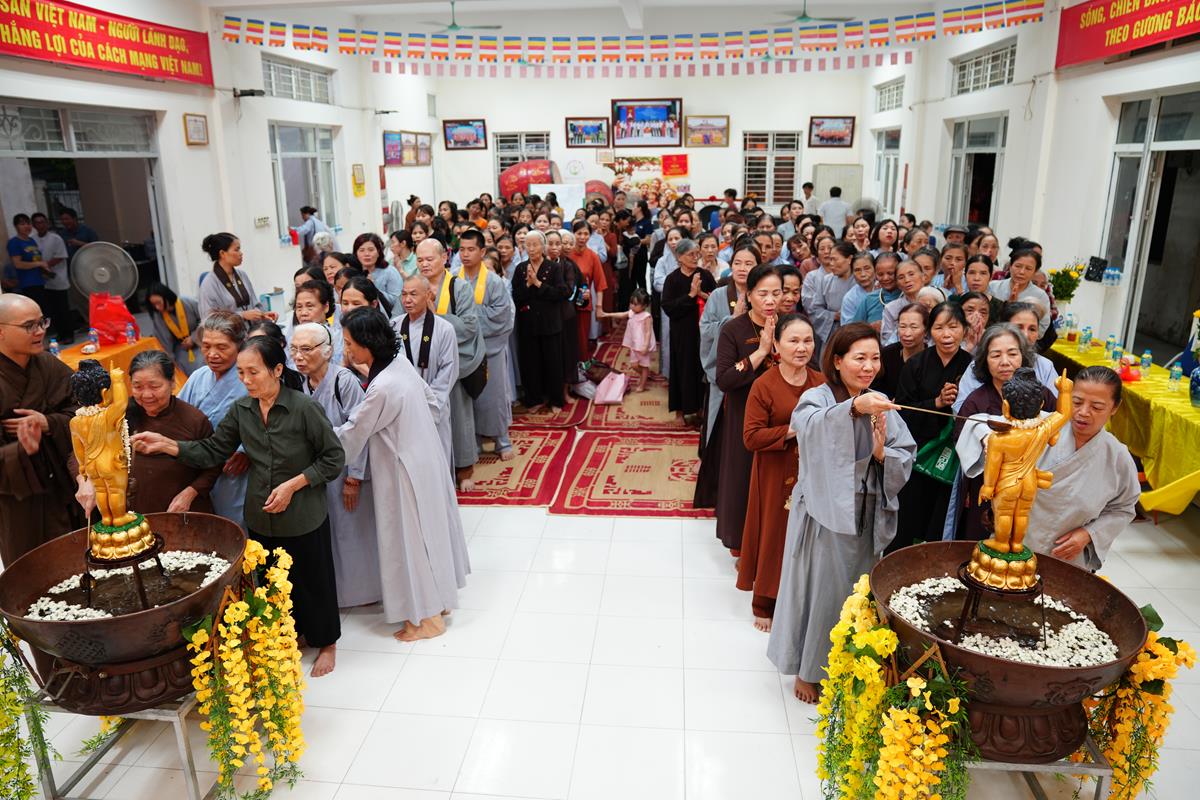 Giây phút mà toàn thể người dân mong chờ nhất, chính là lúc chư Tôn đức cùng đại chúng tụng kinh Phật đản và làm lễ tắm Phật. Già trẻ gái trai trong khu dân cư nô nức xếp hàng chờ tắm Phật. Chư Tăng cùng đại diện Đạo tràng tỉ mỉ hướng dẫn những em bé ánh mắt sáng ngời chắp tay cung kính cầm chiếc gáo tưới nước lên Tôn tượng Đức Bản Sư trong niềm hân hoan háo hức. Nhà văn hóa Bằng B vô cùng đông vui nhộn nhịp kính mừng ngày Đức Thế Tôn thị hiện nơi đời, vì hạnh phúc cho số đông, vì an lạc cho chư Thiên và loài người.