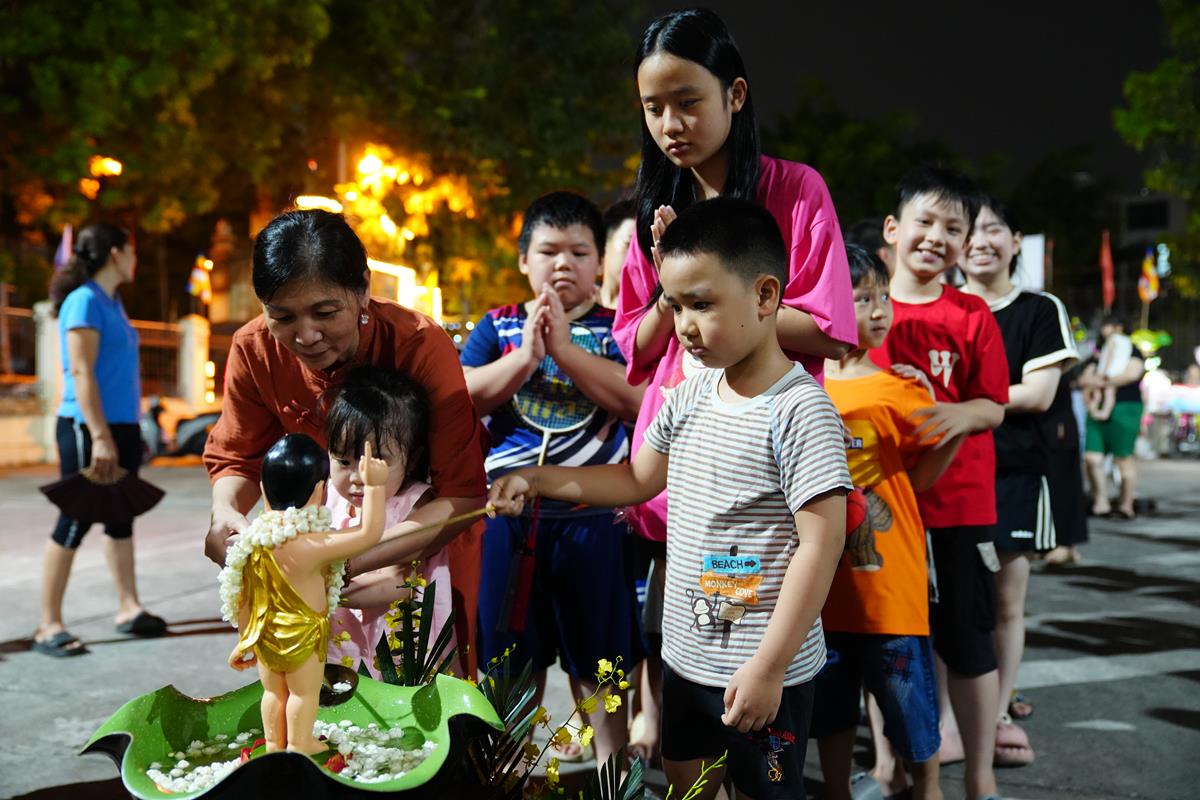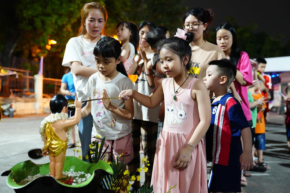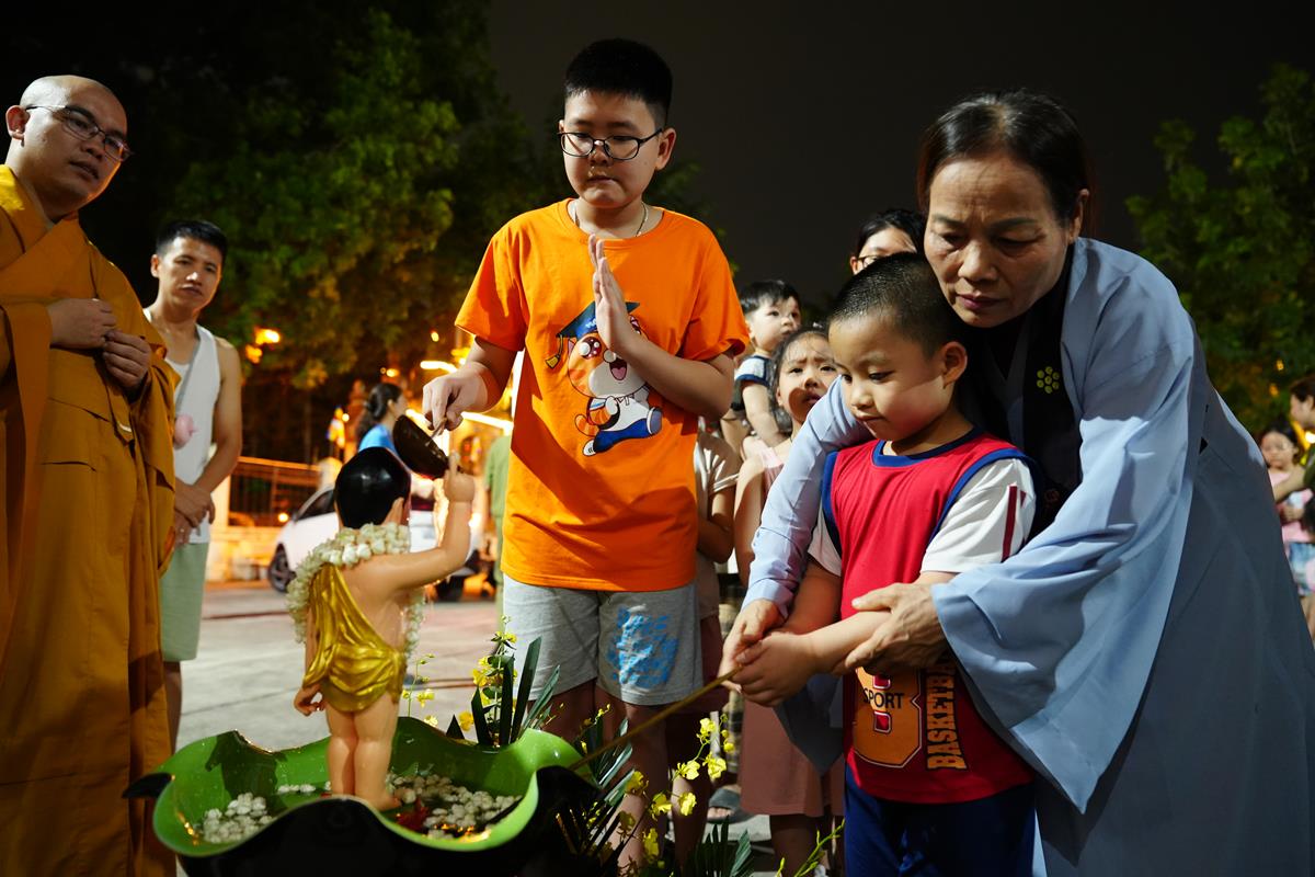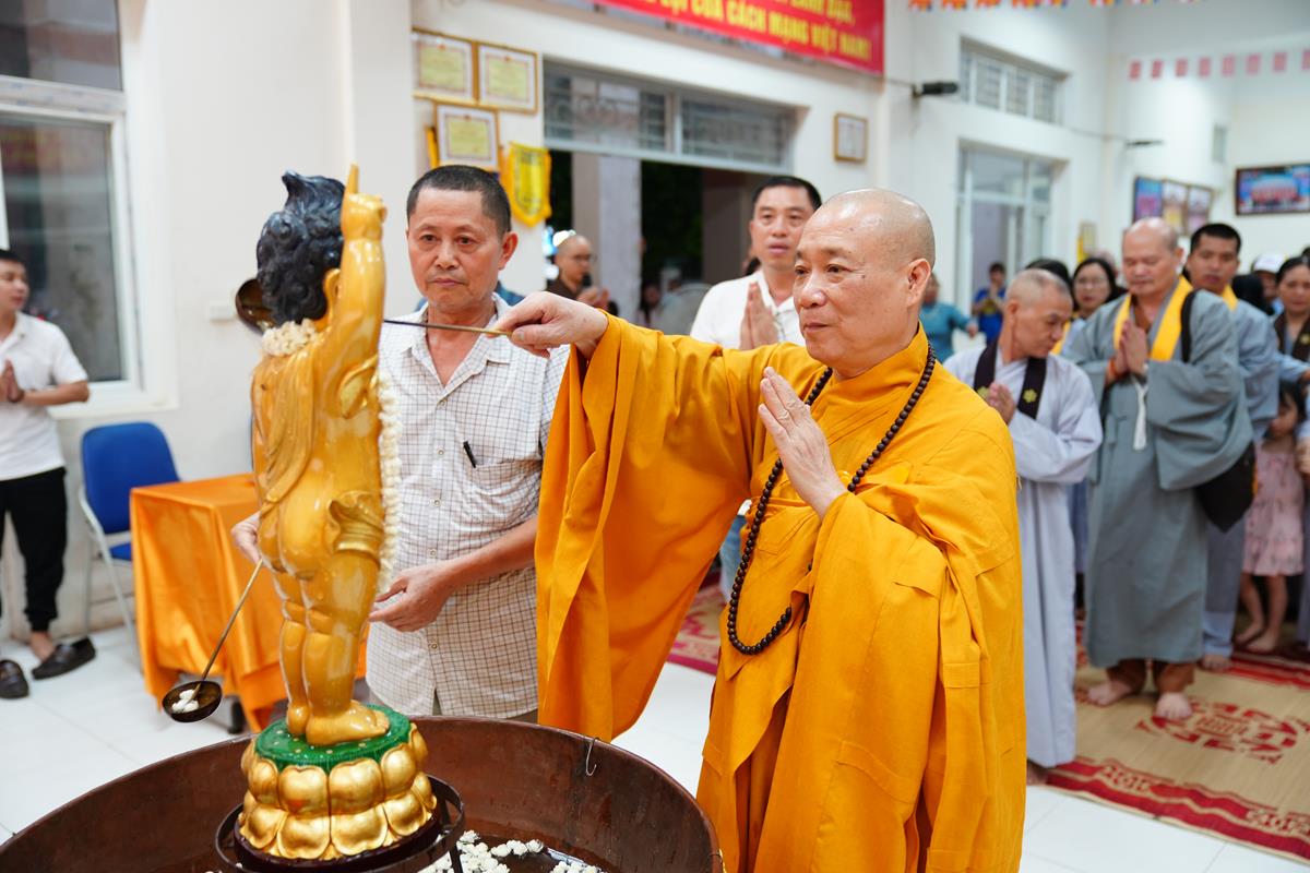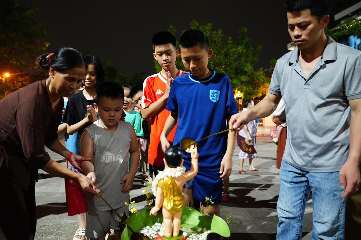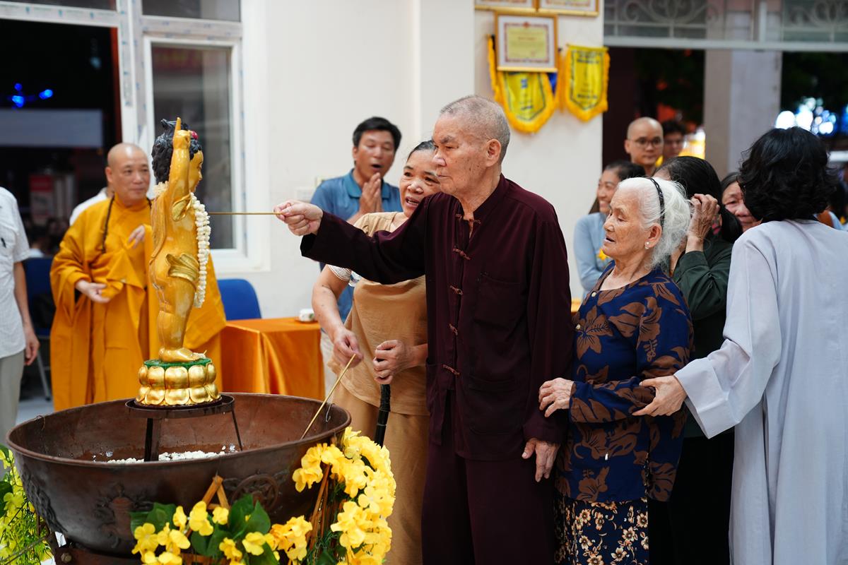 Giây phút mà toàn thể người dân mong chờ nhất, chính là lúc chư Tôn đức cùng đại chúng tụng kinh Phật đản và làm lễ tắm Phật. Già trẻ gái trai trong khu dân cư nô nức xếp hàng chờ tắm Phật. Chư Tăng cùng đại diện Đạo tràng tỉ mỉ hướng dẫn những em bé ánh mắt sáng ngời chắp tay cung kính cầm chiếc gáo tưới nước lên Tôn tượng Đức Bản Sư trong niềm hân hoan háo hức. Nhà văn hóa Bằng B vô cùng đông vui nhộn nhịp kính mừng ngày Đức Thế Tôn thị hiện nơi đời, vì hạnh phúc cho số đông, vì an lạc cho chư Thiên và loài người.
