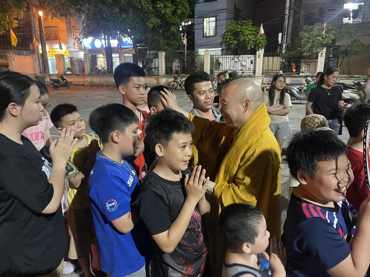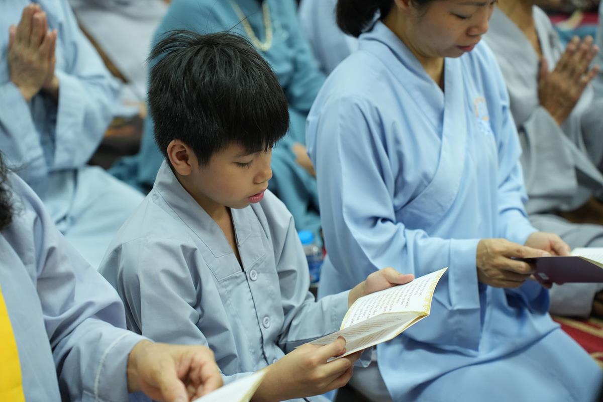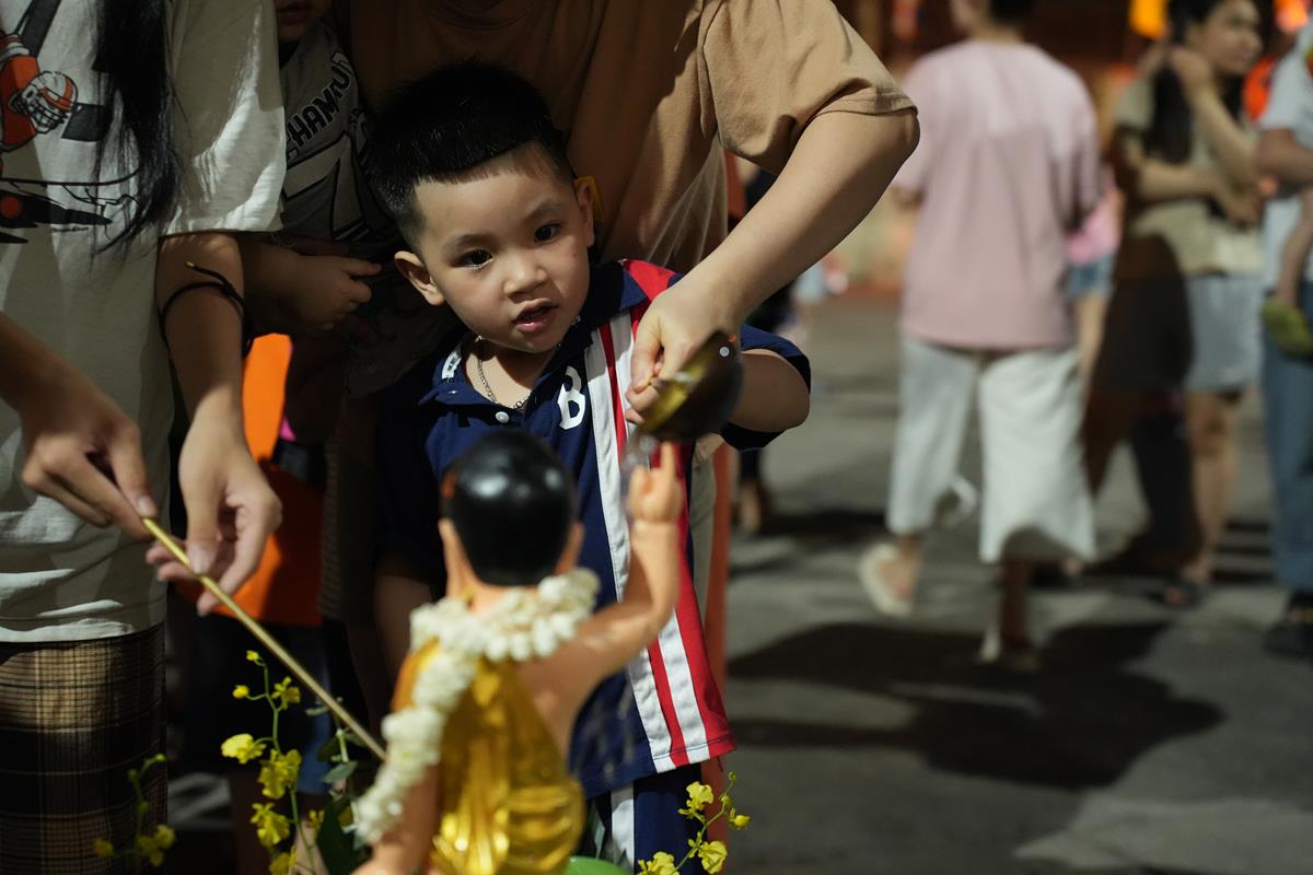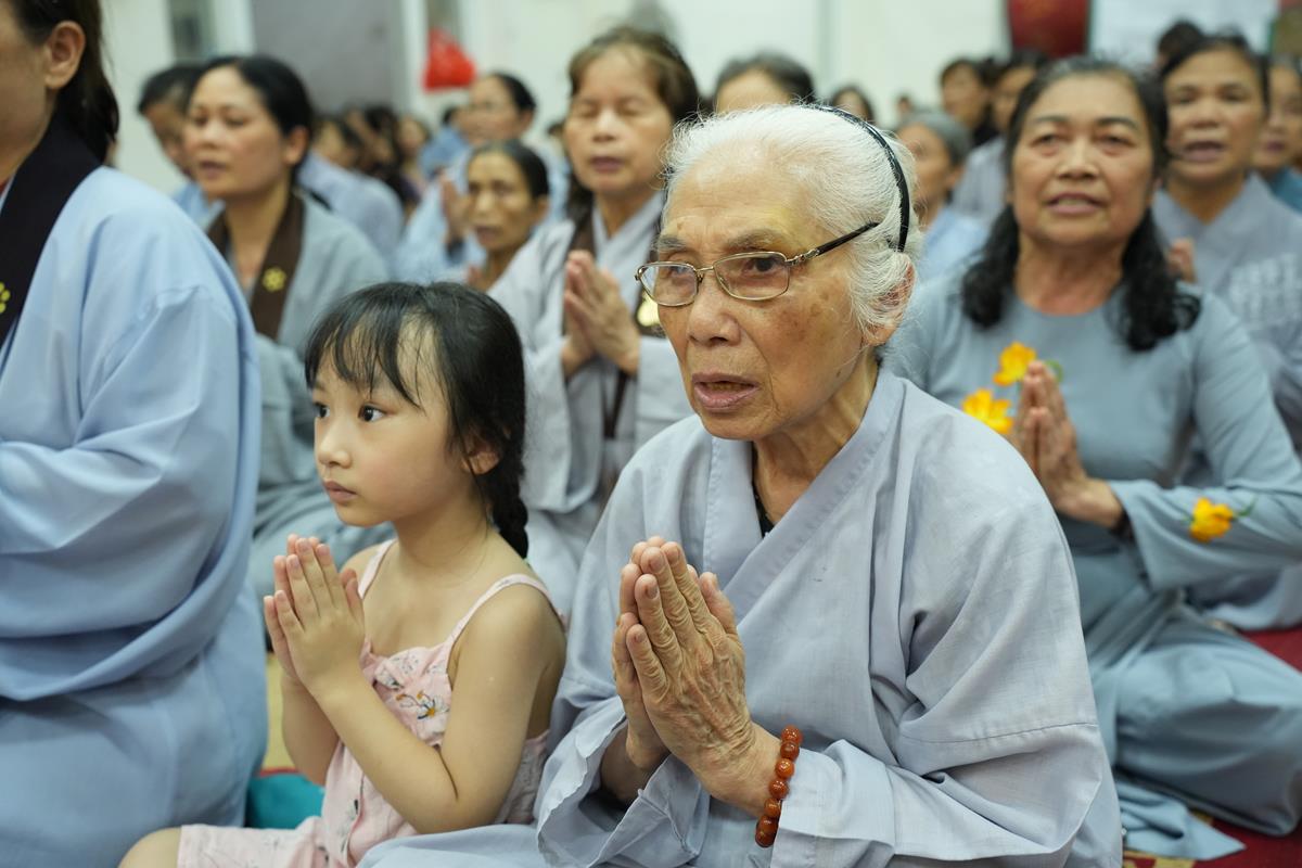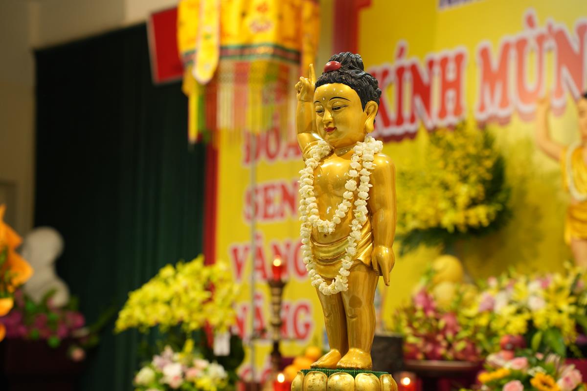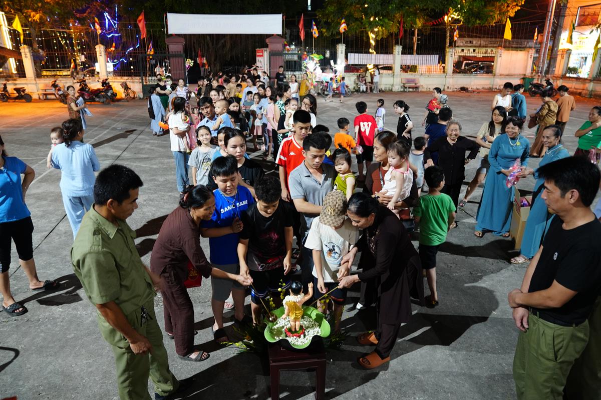 Giây phút mà toàn thể người dân mong chờ nhất, chính là lúc chư Tôn đức cùng đại chúng tụng kinh Phật đản và làm lễ tắm Phật. Già trẻ gái trai trong khu dân cư nô nức xếp hàng chờ tắm Phật. Chư Tăng cùng đại diện Đạo tràng tỉ mỉ hướng dẫn những em bé ánh mắt sáng ngời chắp tay cung kính cầm chiếc gáo tưới nước lên Tôn tượng Đức Bản Sư trong niềm hân hoan háo hức. Nhà văn hóa Bằng B vô cùng đông vui nhộn nhịp kính mừng ngày Đức Thế Tôn thị hiện nơi đời, vì hạnh phúc cho số đông, vì an lạc cho chư Thiên và loài người.