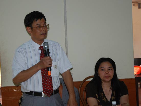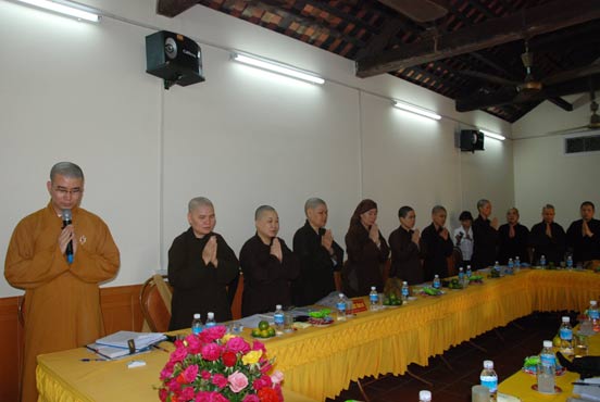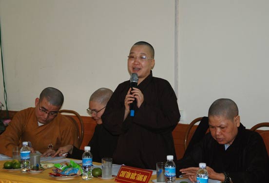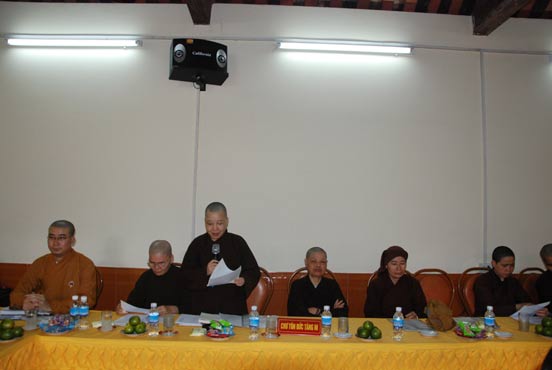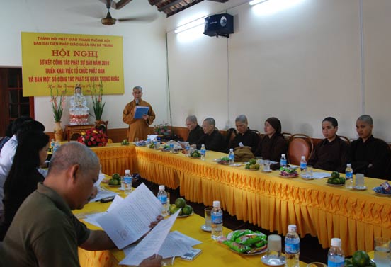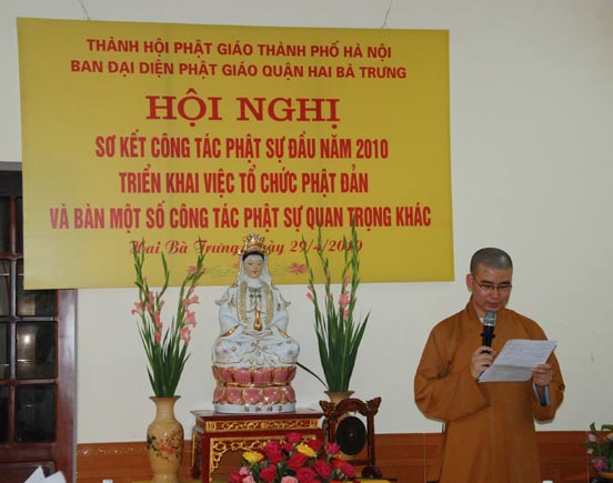 Sư thầy Thích Đàm Nam đọc báo cáo sơ kết công tác Phật sự đầu năm 2010 của Ban đại diện Phật giáo quận Hai Bà Trưng.