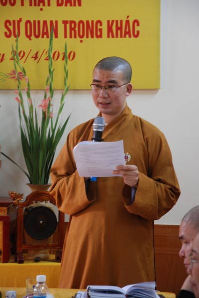 ĐĐ Thích Đạo Thông đọc Thông tư Hướng dẫn tổ chức và văn bản vận động tài chính của Thành hội Phật giáo Hà Nội về việc tổ chức Đại lễ Phật Đản PL 2554 – DL 2010, thông tư hướng dẫn về việc tổ chức An Cư Kiết Hạ năm 2010