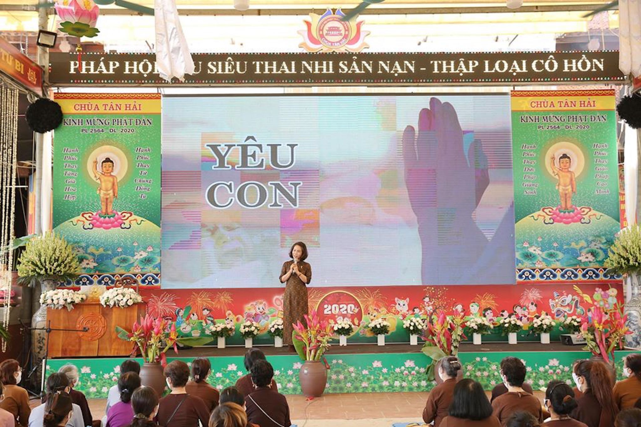Trước khi chính thức bước buổi lễ tụng kinh cầu siêu cho vong linh thai nhi, sản nạn, toàn thể đại chúng đã được nghe Phật tử Hoàng Thái – Chuyên gia tâm lý, trưởng Ban văn hoá chùa Tân Hải chia sẽ những mẩu chuyện rất cảm động về tình mẫu tử, tình phụ tử diễn ra trong đời sống thường nhật qua chủ đề “ Yêu Con”. Qua bài nói chuyện này, Phât tử Hoàng Thái muốn nhắn gửi tới những người cha, người mẹ tác hại của việc nạo hút thai, phá thai và cách nuôi dạy con cái một cách khoa học từ khi lọt lòng mẹ tới khi trưởng thành, cũng như tình trạng báo động về nạo hút thai, phá thai ở lứa tuổi vị thành niên trong xã hội của chúng ta hiện nay. Theo đó, tỷ lệ nạo phá thai độ tuổi vị thành niên ở nước ta hiện nay đứng đầu các nước Đông Nam Á. Ngoài ra, Việt Nam cũng là 1 trong 5 quốc gia có tỷ lệ nạo phá thai cao nhất thế giới. Theo thống kê của Vụ Sức khỏe Bà mẹ trẻ em (Bộ Y tế), trung bình mỗi năm cả nước có khoảng 300 đến 400 ngàn ca phá thai ở độ tuổi 15-19, trong đó 60-70% là học sinh, sinh viên. Còn theo Tổng cục Dân số-Kế hoạch hóa gia đình, mặc dù tỷ lệ phá thai ở Việt Nam trong 10 năm trở lại đây giảm, nhưng tỷ lệ nạo phá thai ở trẻ vị thành niên, thanh niên lại có dấu hiệu gia tăng – chiếm hơn 20% các trường hợp phá thai.