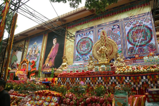 Trước Pháp tòa dát vàng là những tràng hoa rực rỡ kết biểu tượng tám tướng cúng dường. Các pho tượng phật quý giá nguyên bản bằng đồng vàng Quan Âm Thiên Thủ Thiên Nhãn, Quan Âm Tứ Thủ… tranh đá quý khổ lớn và mandala bạc đã được bày đặt an vị một cách thành kính, thiêng liêng trên khán đài.