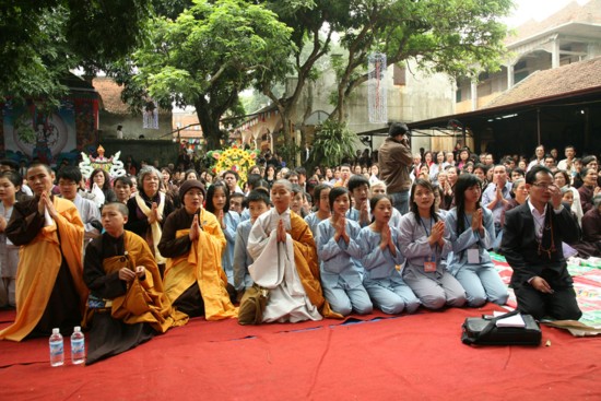 Chư Đại Đức Tăng đoàn Drukpa tọa ở dưới Pháp tòa của Đức Pháp vương, dưới nữa là chư Đại đức Tăng Ni và các Phật tử Việt Nam dàn trải ra khắp ba khu vực trục chính của chùa Quang Ân.