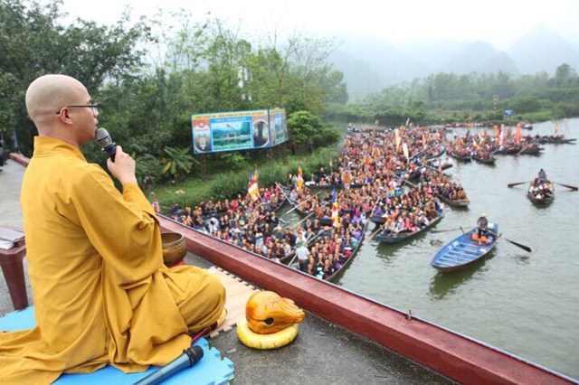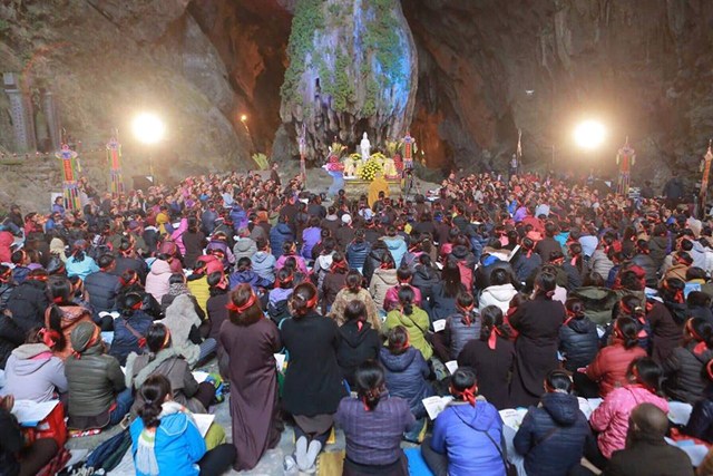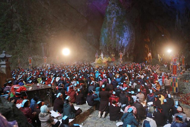 Sau hơn 1 giờ đồng hồ ngồi trên thuyền, đoàn thuyền đã đưa các Phật tử tới chân núi Hương Sơn để các Phật tử chuẩn bị thượng sơn, vân tập về động Hương Tích, chuẩn bị cho khóa lễ tụng kinh Phổ Môn, lễ tạ nhân dịp cuối năm. Trước khi chính thức cử hành nghi lễ tụng kinh Phổ Môn, đại đức Thích Quảng Hiếu – Trưởng BTC chương trình tu học đã chia sẻ cùng các Phật tử về sự tích của Phật Bà Quán Thế Âm tại Hương Tích, 12 đại nguyện của Bồ Tát Quán Thế Âm, nội dung chính của kinh Phổ Môn do chùa Tân Hải biên soạn, cũng như công đức của việc tụng kinh, niệm Phật, lễ Phật, lạy Phật…Sau gần 2 tiếng đồng hồ tụng kinh, lễ lạy trong một không gian rất đỗi thiêngvà rất hy hữu tại động Hương Tích, các Phật tử thấy mình như được lạc vào chốn Bồng Lai Tiên Cảnh, được nói lên tâm tư, nguyện vọng của mình, tất cả các Phật tử ai cũng cảm thấy an lạc, hạnh phúc, hạnh phúc hơn nữa là được đối trước tôn tượng của mẹ hiền Quán Thế Âm để hành trì lễ lạy, bái sám, cầu nguyện cho thế giới hòa bình, chúng sinh an lạc, cầu mong cho một năm mới sắp tới được an khang, thịnh vượng, nhà nhà được ấm no, hạnh phúc.