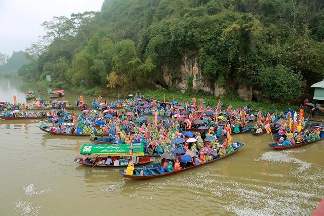 Sau nghi thức phóng sinh bên dòng Suối Yến, đoàn thuyền lại tiếp tục đưa các Phật tử về phía động Hương Tích, đi đầu là đò chở tôn tượng của Bồ Tát Quan Thế Âm được trang trí rất công phu với cờ hoa, băng rôn, biểu ngữ rực rỡ, trang hoàng, lộng lẫy, hòa cùng với đó là tiếng niệm danh hiệu Bồ Tát Quan Thế Âm trầm hùng, tha thiết trước một không gian rất đỗi linh thiêng, yên bình của buổi sáng tinh mơ, hoa cỏ còn mờ hơi sương.