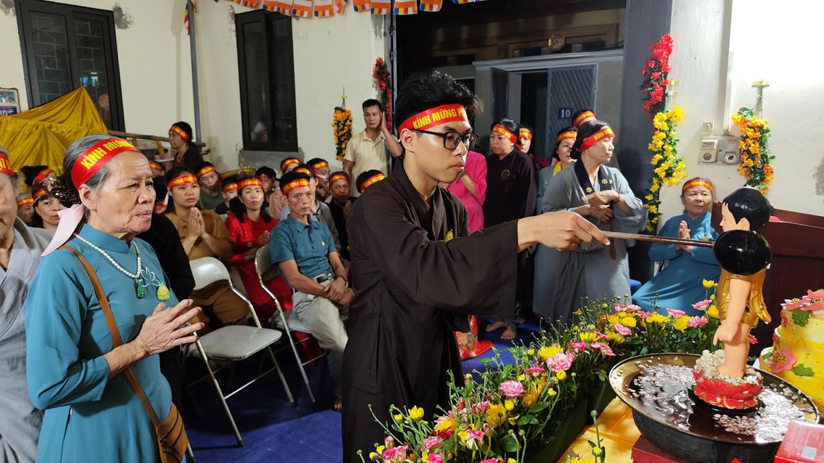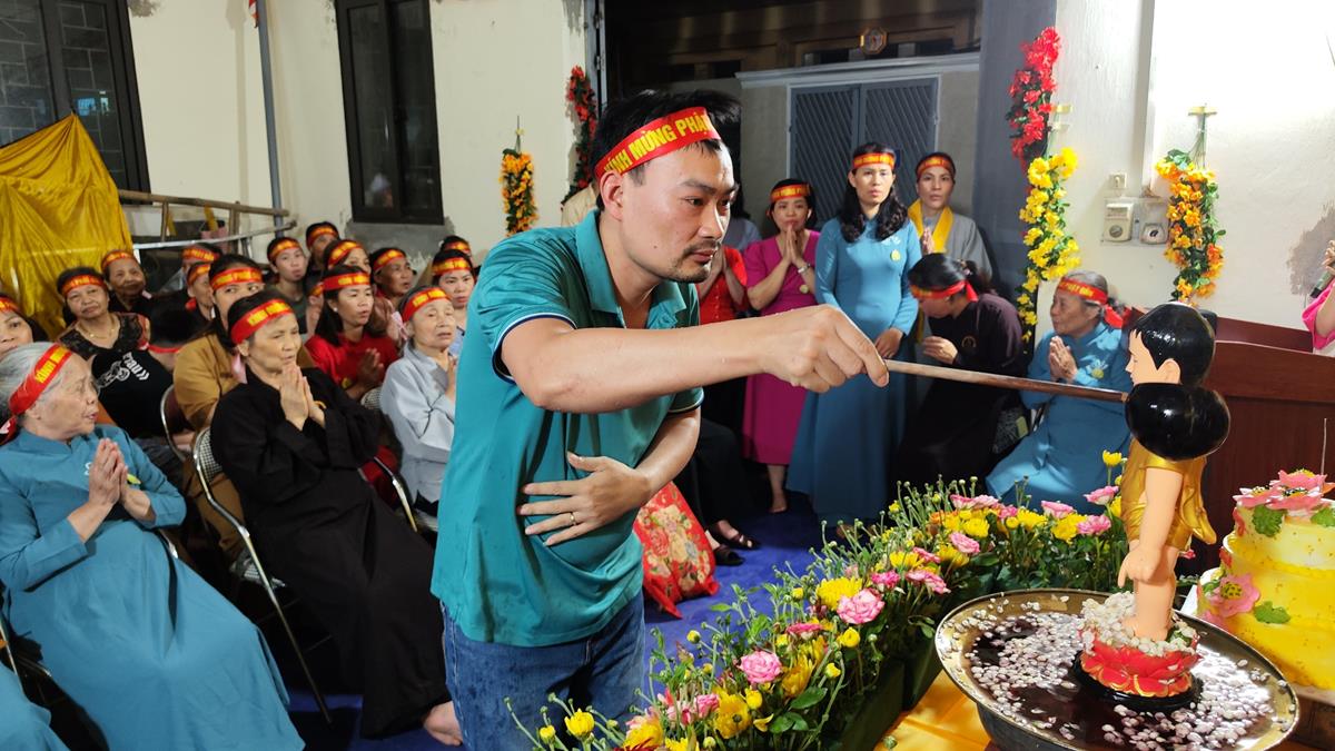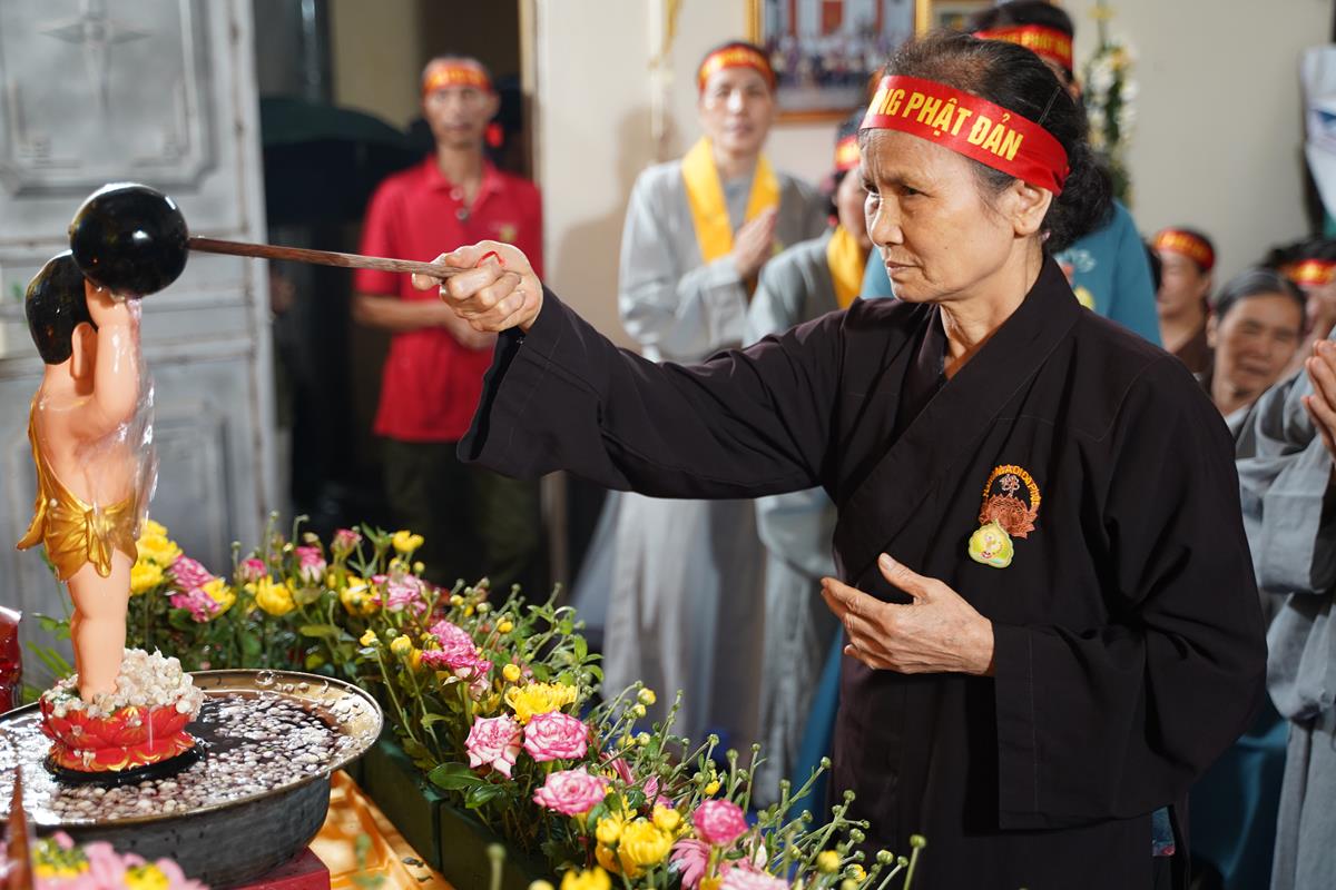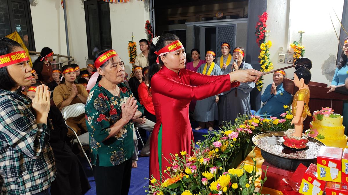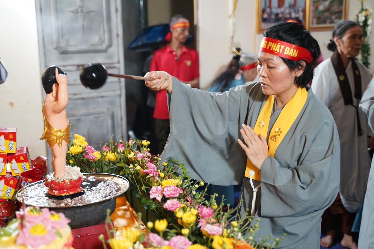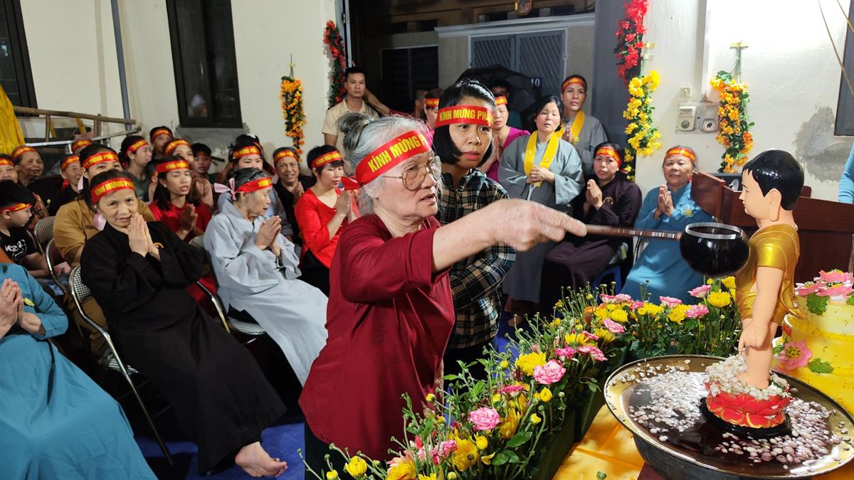 Sau đó, dưới sự hướng dẫn của Phật tử Đạo tràng, toàn thể nhân dân đã cùng nhất tâm hướng về tôn tượng Đức Phật sơ sinh, trì tụng kinh Chuyển Pháp Luân và thực hiện nghi thức Mộc Dục theo truyền thống. Toàn thể nhân dân cùng nhau nô nức, hoan hỷ xếp hàng chờ Tắm Phật trong niềm an lạc và thanh tịnh.