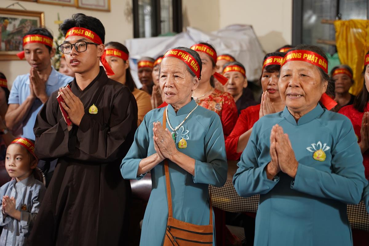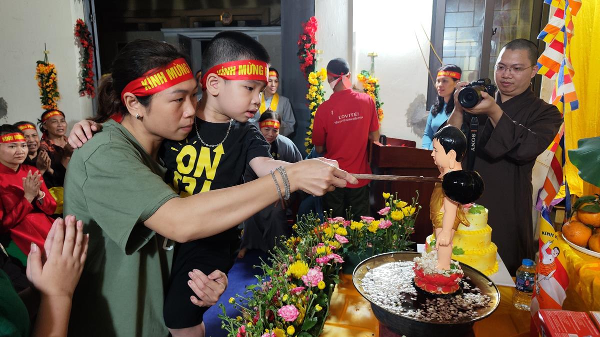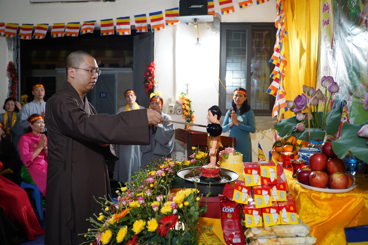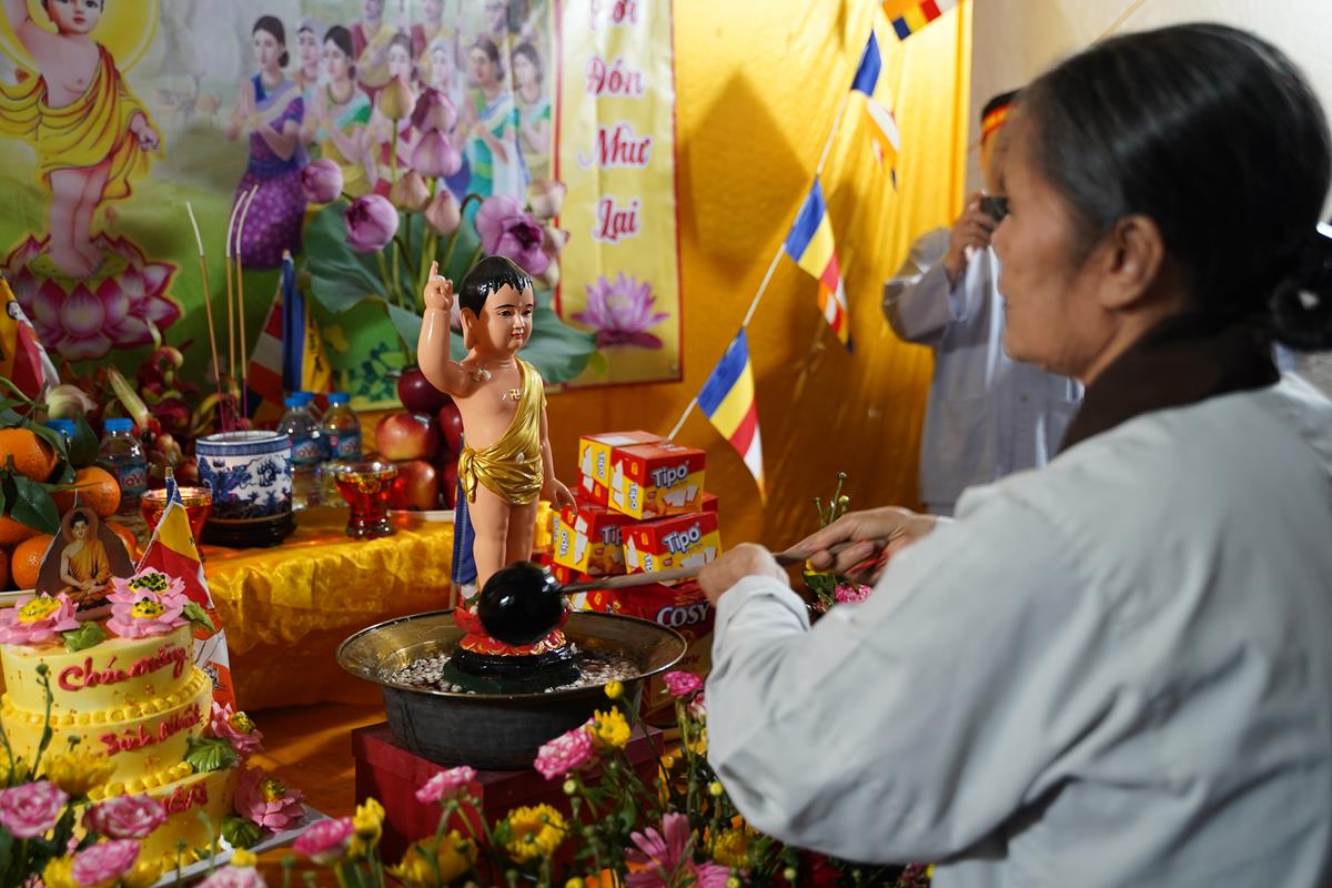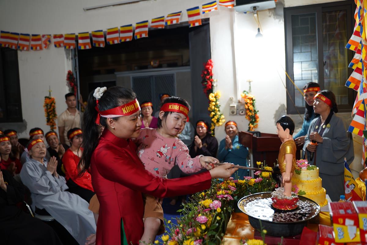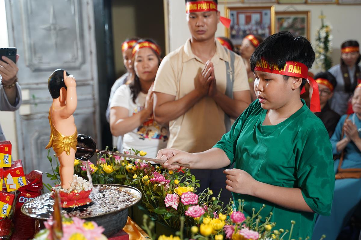 Sau đó, dưới sự hướng dẫn của Phật tử Đạo tràng, toàn thể nhân dân đã cùng nhất tâm hướng về tôn tượng Đức Phật sơ sinh, trì tụng kinh Chuyển Pháp Luân và thực hiện nghi thức Mộc Dục theo truyền thống. Toàn thể nhân dân cùng nhau nô nức, hoan hỷ xếp hàng chờ Tắm Phật trong niềm an lạc và thanh tịnh.