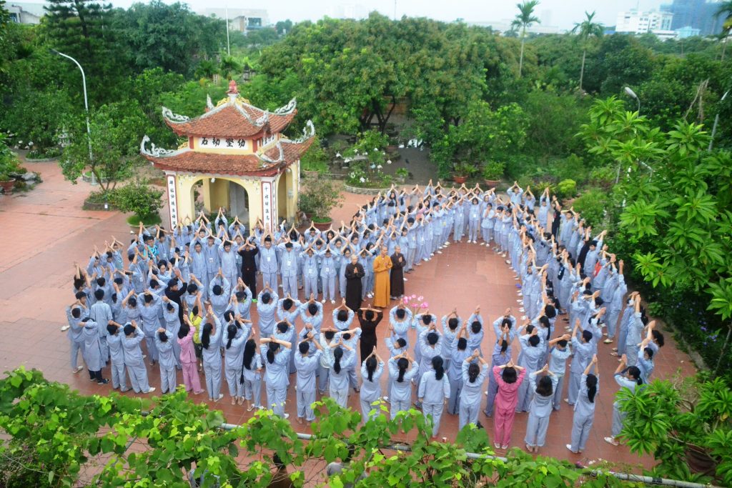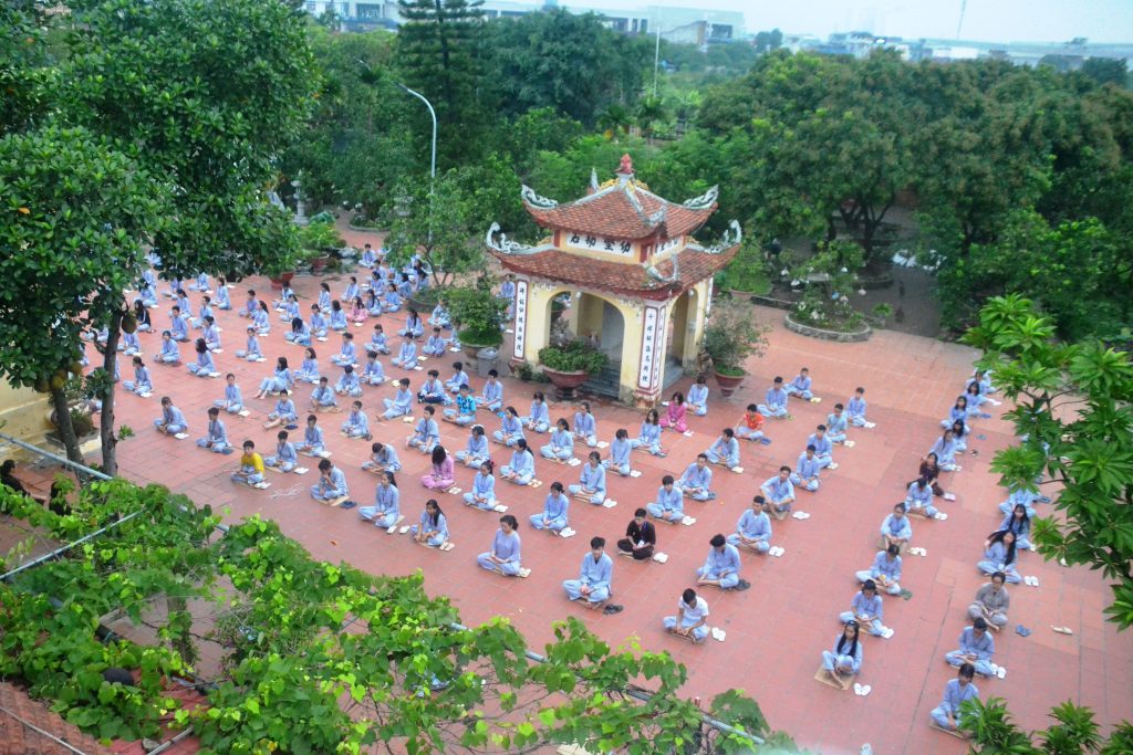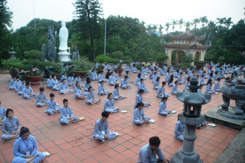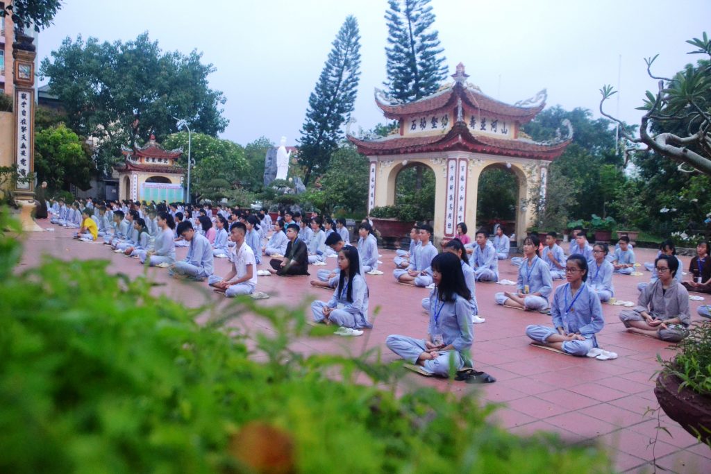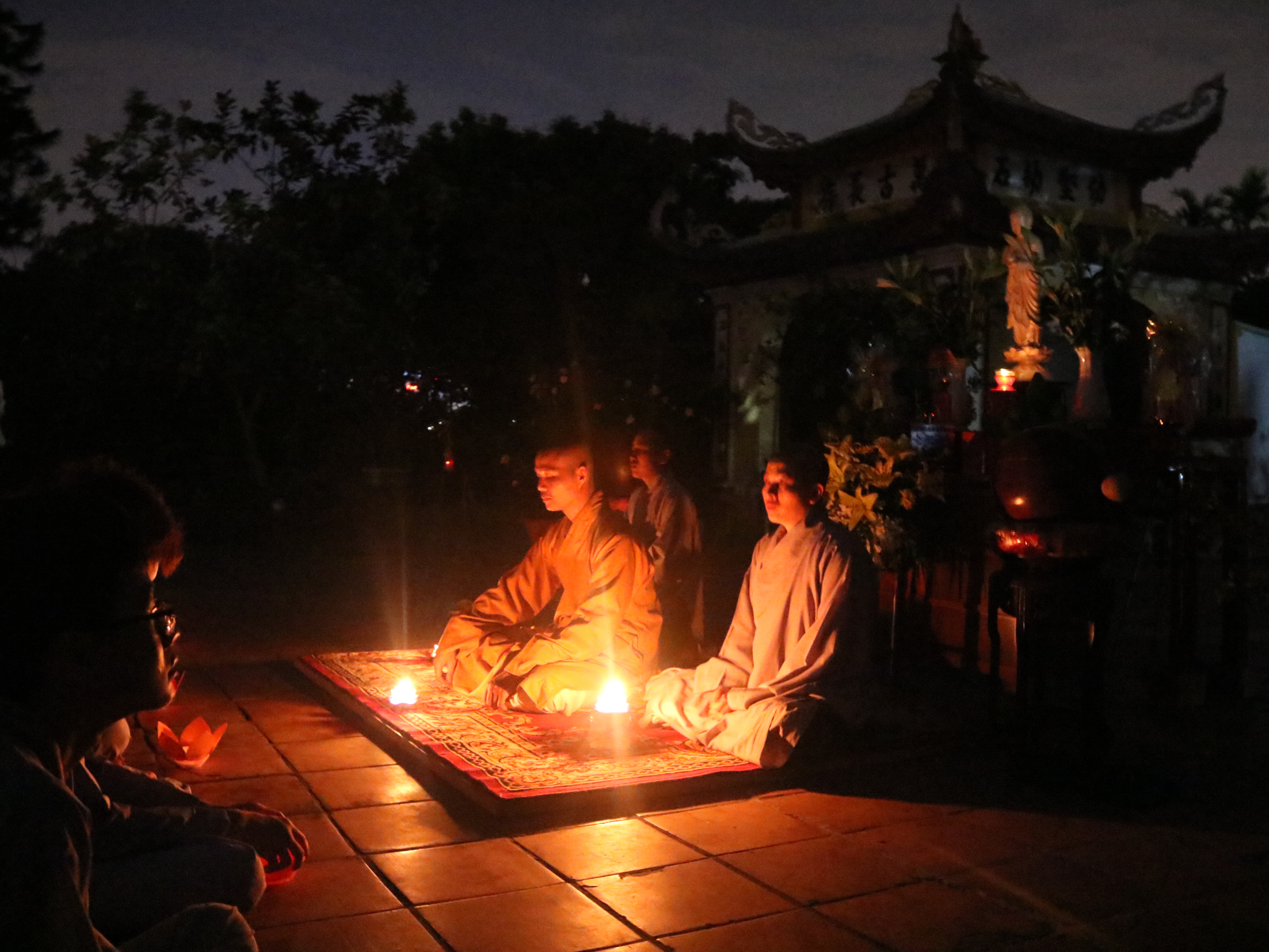 Ngay từ sáng sớm, toàn thể các bạn thiền sinh tọa thiền và tụng kinh Phúc Đức ngoài sân. Thật trang nghiêm và thanh tịnh.