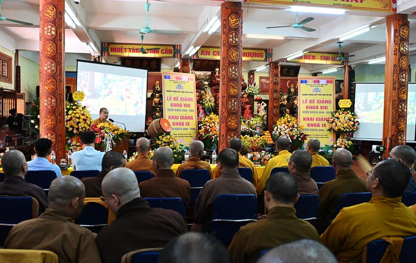 Hòa thượng Thích Bảo Nghiêm ban đạo từ tới buổi lễ. Hòa thượng tán thán công đức của Ban giám hiệu nhà trường trong công tác đào tạo Tăng ni sinh trong khóa học 2018 – 2022, Cám ơn các vị mạnh thường quân, nhà hảo tâm đã giúp đỡ và đồng hành cùng nhà trường để có được kết quả như trong báo cáo của nhà trường. Hòa thượng cũng cám ơn các vị Nghiệp sư của các Tăng Ni sinh đã tạo mọi điều kiện để Tăng Ni sinh có điều kiện tham gia tu học tại ngôi trường Trung cấp Phật học Hà Nội, Hòa thượng cũng sách tấn Tăng Ni sinh của Trường Trung cấp Phật học Hà Nội cố gắng giữ nề nếp gia phong đạo hạnh chốn thiền môn vừa trau giồi trí thức nội ngoại điển thật tốt để xứng danh trưởng tử của Như lai giữ gìn mạng mạch của Phật giáo góp phần xây dựng Giáo hội Phật giáo Hà Nội và Phật giáo Việt Nam trường tồn và Hưng thịnh.