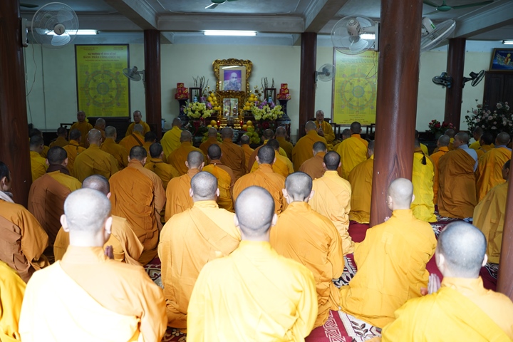 Toàn thể Tăng Ni đã vân tập về Đại Hùng Bảo Điện, đỉnh lễ Tam Bảo. Sau đó là nghi lễ niêm hương đỉnh lễ Tổ sư, đỉnh lễ giác linh cố Trưởng lão đệ nhị Pháp chủ.