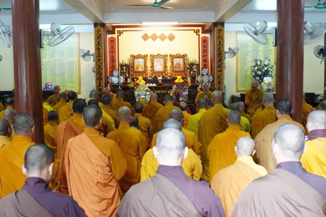 Tại đây, toàn thể Tăng Ni đỉnh lễ Tam bảo, niêm hương đỉnh lễ Tổ sư, Giác linh cố Đệ nhị Pháp chủ GHPGVN, khánh tuế chư vị giáo phẩm và họp mặt sơn môn.