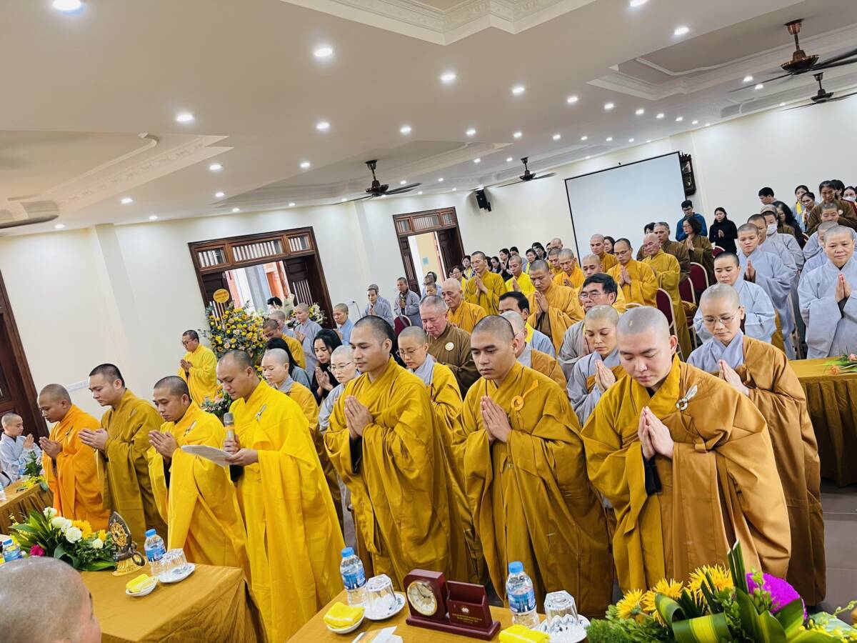 Sau lời phát biểu khai mạc, Tăng Ni giảng sinh cùng quý Phật tử dâng lời tác bạch tri ân và dâng những món quà, những bó tươi thắm tỏ lòng biết ân chư Tôn thiền đức.