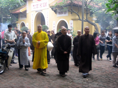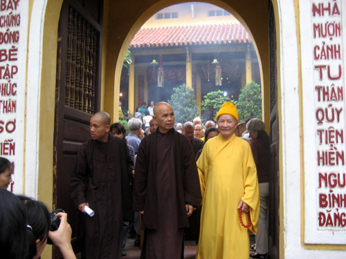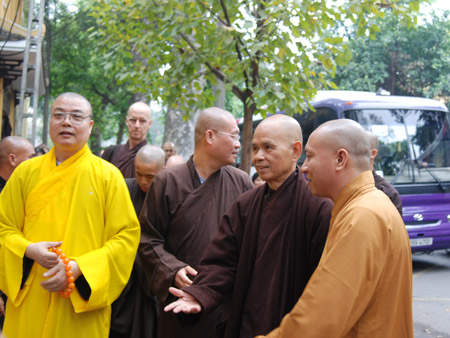 Đúng 9 giờ, phái đoàn Tăng thân Quốc tế Làng Mai đã tập kết tại Tam quan chùa Quán Sứ. Nhị vị TT Thích Thanh Nhiễu, Thích Gia Quang trân trọng ra tận cửa xe đón Thiền sư và Tăng thân lên Đại Hùng Bảo điện lễ Phật, lễ Tổ trong tiếng chuông trống Bát nhã vang lừng. Thiền sư cùng Tăng thân đã thành kính dâng hương, bái Phật bái Tổ. Ngay sau đó, tại Đại Giảng đường Tùng lâm Quán Sứ, Hoà thượng Thích Thanh Tứ đã chủ trì Lễ tiếp Thiền sư Thích Nhất Hạnh và Phái đoàn Tăng thân Quốc tế Làng Mai. Thay mặt Trung ương GHPGVN và Tổ đình Tùng lâm Quán Sứ, Hoà thượng Thanh Tứ đã phát biểu chào mừng và cảm ơn Hoà thượng Thiền sư và Tăng thân Làng Mai đã đến thăm chư Tăng nhân dịp về thăm quê hương. Đáp từ, Thiền sư Nhất Hạnh đã phát biểu bày tỏ niềm vui mừng và lòng biết ơn chân thành khi được đến thăm, được nhận sự giúp đỡ lâu dài, được đón tiếp trọng thị của Trung ương GHPGVN và Tổ đình Tùng lâm Quán Sứ. Buổi lễ tiếp đoàn kết thúc sau khi trao quà lưu niệm và nghe Tăng thân Làng Mai tụng Tâm Kinh Bát Nhã bằng Anh ngữ. Trước khi chia tay thân mật, Đại biểu các bên tham gia buổi đón tiếp đã cùng chụp hình lưu niệm. Vào lúc 15 giờ cùng ngày, Thiền sư Thích Nhất Hạnh cùng Đại diện Tăng thân Quốc tế Làng Mai đã đến thăm Ban tôn giáo Chính phủ tại Trụ sở số 53, phố Tràng Thi, Hà Nội. Cùng đi với Đoàn có TT Thích Gia Quang – Phó Trưởng Ban Quan hệ Quốc tế Trung ương GHPGVN. Đón và tiếp đoàn có: Ông Nguyễn Hữu Oanh – Phó trưởng Ban Tôn giáo Chính phủ; Ông Nguyễn Tài Tính – Vụ trưởng Vụ Hợp tác Quốc tế; Ông Bùi Hữu Dược – Vụ Trưởng Vụ Phật giáo, cùng các Chuyên viên trong Ban. Tại cuộc gặp, Thiền sư đã giới thiệu về Đạo tràng Mai thôn: Đây là một tổ chức Phật giáo tập hợp nhiều Tăng Ni Phật tử trẻ, gồm nhiều Quốc tịch khác nhau, tu tập theo truyền thống Phật giáo Việt Thầy Thích Chân Pháp Ấn trình bày kết quả của 2 Trai đàn Chẩn tế do Tăng thân Làng Mai chủ trì tổ chức vừa qua tại Tp. Hồ Chí Minh và Huế; về công tác chuẩn bị cho Trai đàn sắp mở tại Hà nội; đề đạt nguyện vọng được giúp đỡ để Trai đàn thứ 3 này được thành tựu như 2 Trai đàn vừa qua. Đáp từ, ông Nguyễn Hữu Oanh đã thông báo với Đoàn về vai trò của Phật giáo với Dân tộc và tình hình tôn giáo ở Việt Ông Bùi Hữu Dược đã bày tỏ thiện cảm với tổ chức và hoạt động của Tăng thân Làng Mai, đứng đầu là Thiền sư Nhất Hạnh và hy vọng nhiều sự đóng góp của Thiền sư cho đất nước và dân tộc Việt Nam trong giao đoạn ngày nay. Hai bên đã tặng quà lưu niệm. Buổi gặp gỡ diễn ra trong không khí vui vẻ, thẳng thắn, thân mật và hiểu biết, chia sẻ lẫn nhau. Tin và ảnh: Huệ Minh – Xuân Loan PTVN xin giới thiệu chùm ảnh trong các hoạt động trên. Thượng tọa Thích Thanh Nhiễu (ngoài cùng bên trái), Phó Tổng thư ký Hội đồng Trị sự, Chánh văn phòng I Trung ương Giáo hội Phật giáo Việt Nam đón Hòa thượng Thích Nhất Hạnh