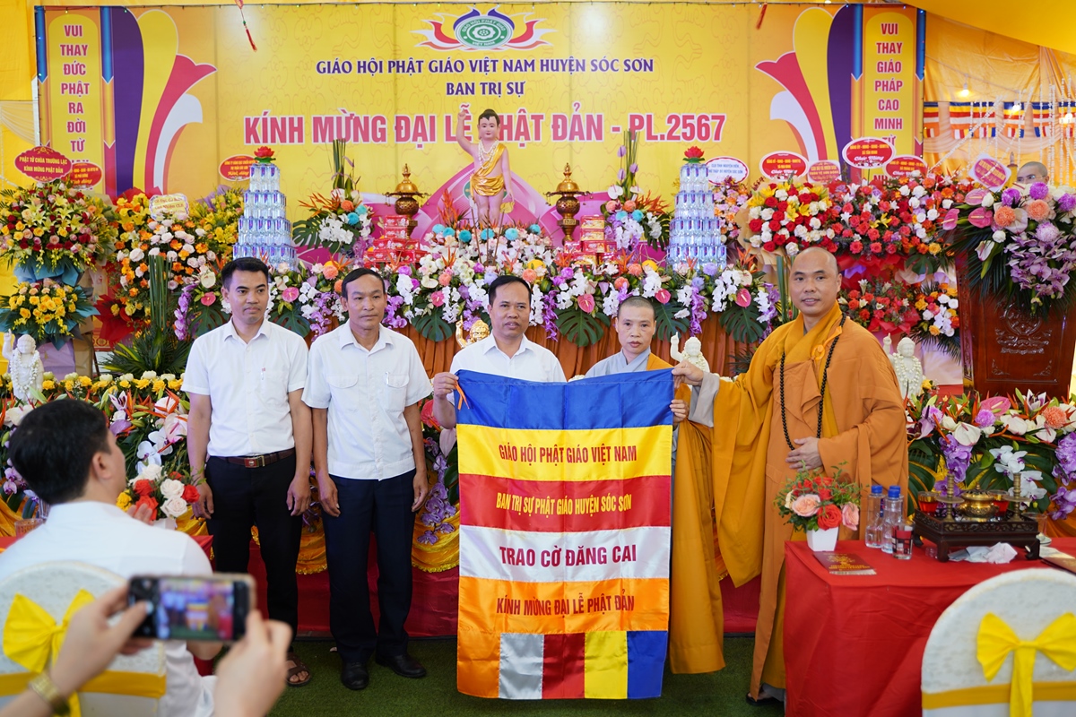 Phát biểu tại buổi lễ, ông Phạm Quang Ngọc đã thay mặt chính quyền sở tại gửi đến chư tôn đức Tăng Ni và toàn thể Phật tử trong huyện lời chúc mừng tốt đẹp nhất, chúc đại lễ Phật đản thành công viên mãn. Ông nhấn mạnh trong thời gian qua, Phật giáo Sóc Sơn luôn phát huy truyền thống đoàn kết đồng hành cùng dân tộc mà các bậc tiền bối đã để lại. Được sự lãnh đạo của GHPGVN, BTS Phật giáo TP Hà Nội, nhiều năm qua, BTS Phật giáo huyện Sóc Sơn đã đồng thuận, tham gia đóng góp tích cực vào sự phát triển kinh tế, các chương trình từ thiện, an sinh xã hội. Đặc biệt là phong trào toàn dân xây dựng nông thôn mới. Ông cũng cho biết, khối đại đoàn kết dân tộc luôn được củng cố, các hoạt động tự do tín ngưỡng tôn giáo trên địa bàn huyện được quan tâm, chăm sóc, những thành tựu đã đạt được thể hiện sự cố gắng, sự phấn đấu của toàn xã hội, trong đó có sự đóng góp tích cực của quý Tăng ni và đồng bào Phật tử huyện nhà. Thay mặt cho chính quyền địa phương, ông Phạm Quang Ngọc ghi nhận và đánh giá cao, chúc mừng kết quả đã đạt được của BTS GHPGVN huyện Sóc Sơn trong thời gian vừa qua. Ông mong rằng trong thời gian tới quý chư tôn đức tiếp tục giữ gìn và phát huy truyền thống hộ quốc an dân, với phương châm “Đạo pháp – Dân tộc – Chủ nghĩa xã hội” của Phật giáo Việt Nam trong thời kỳ mới.