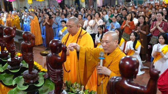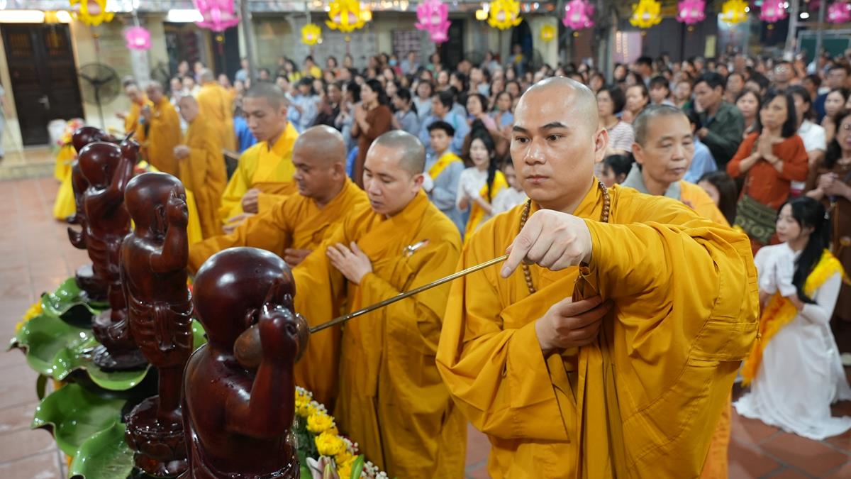 Khép lại buổi lễ, chư tôn đức và toàn thể đại chúng đã thực hiện nghi thức niêm hương bạch Phật, tụng kinh Phật Đản và làm lễ tắm Phật đầy thành kính. Tắm Phật là nghi thức tưới nước thơm lên tượng Phật sơ sinh, ngoài mục đích kỷ niệm ngày Phật đản sinh còn mang ý nghĩa sâu sắc về sự tẩy trừ phiền não, hướng đến thanh tịnh ba nghiệp thân khẩu ý của con người.