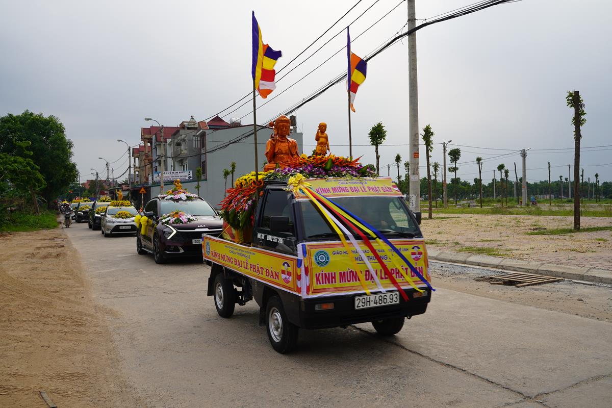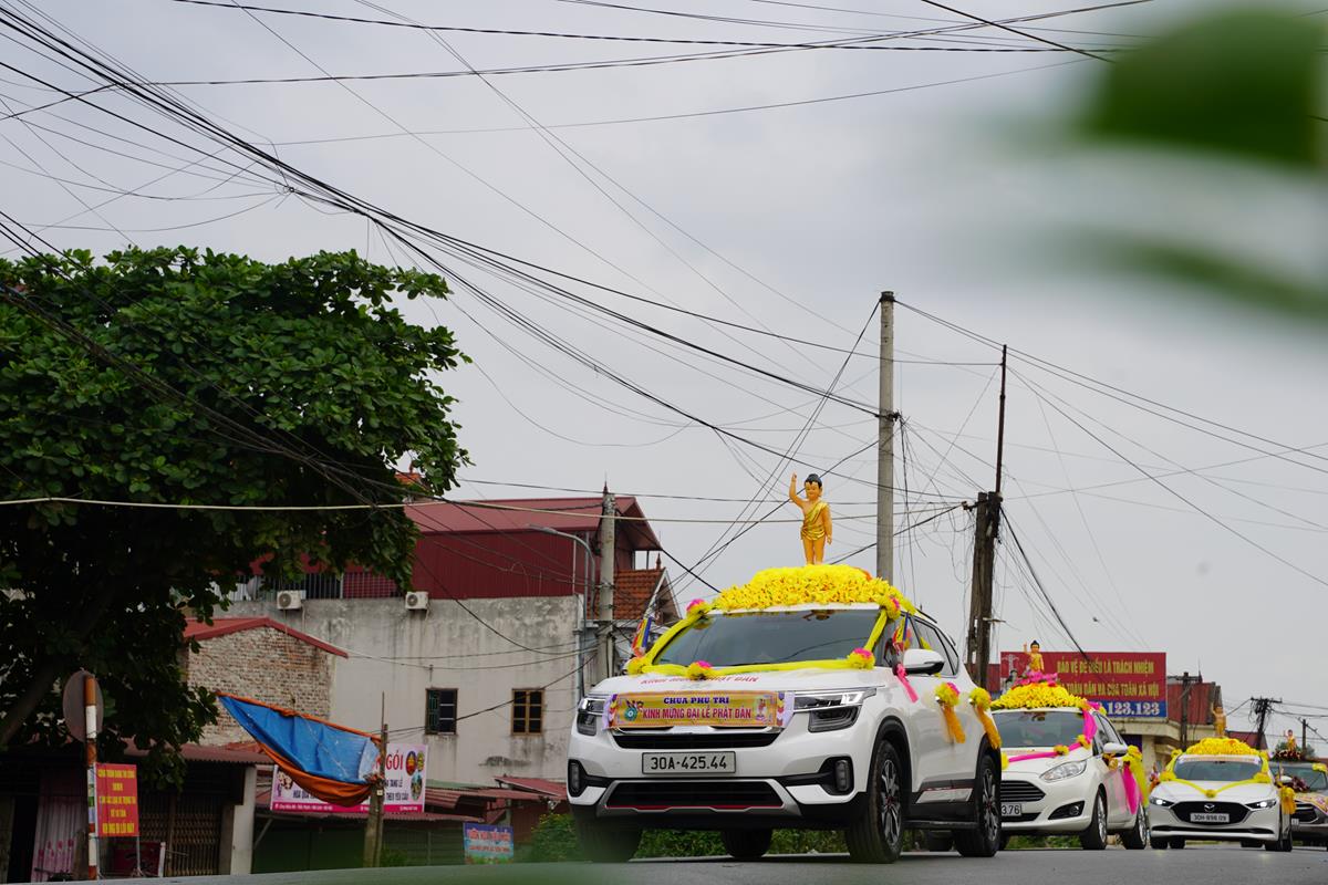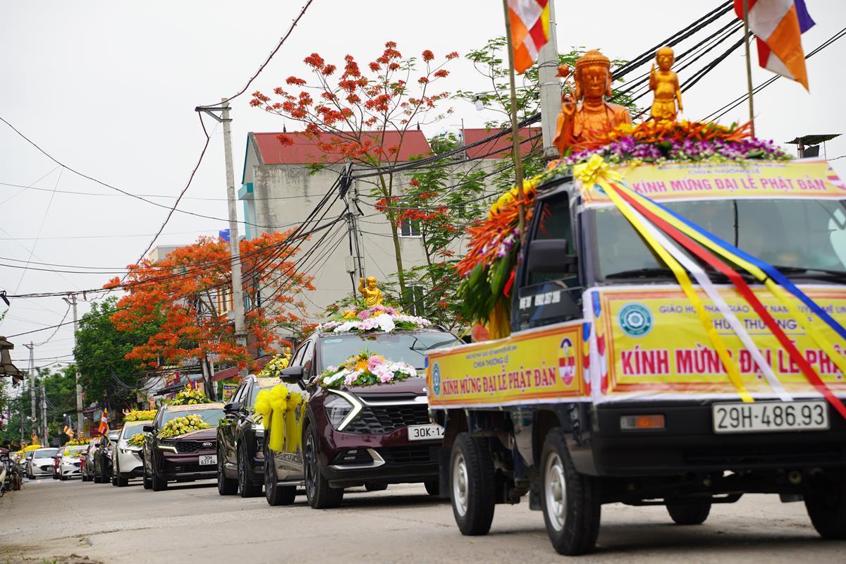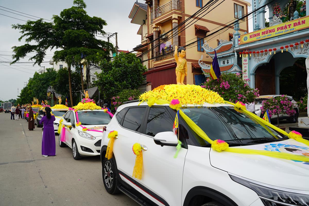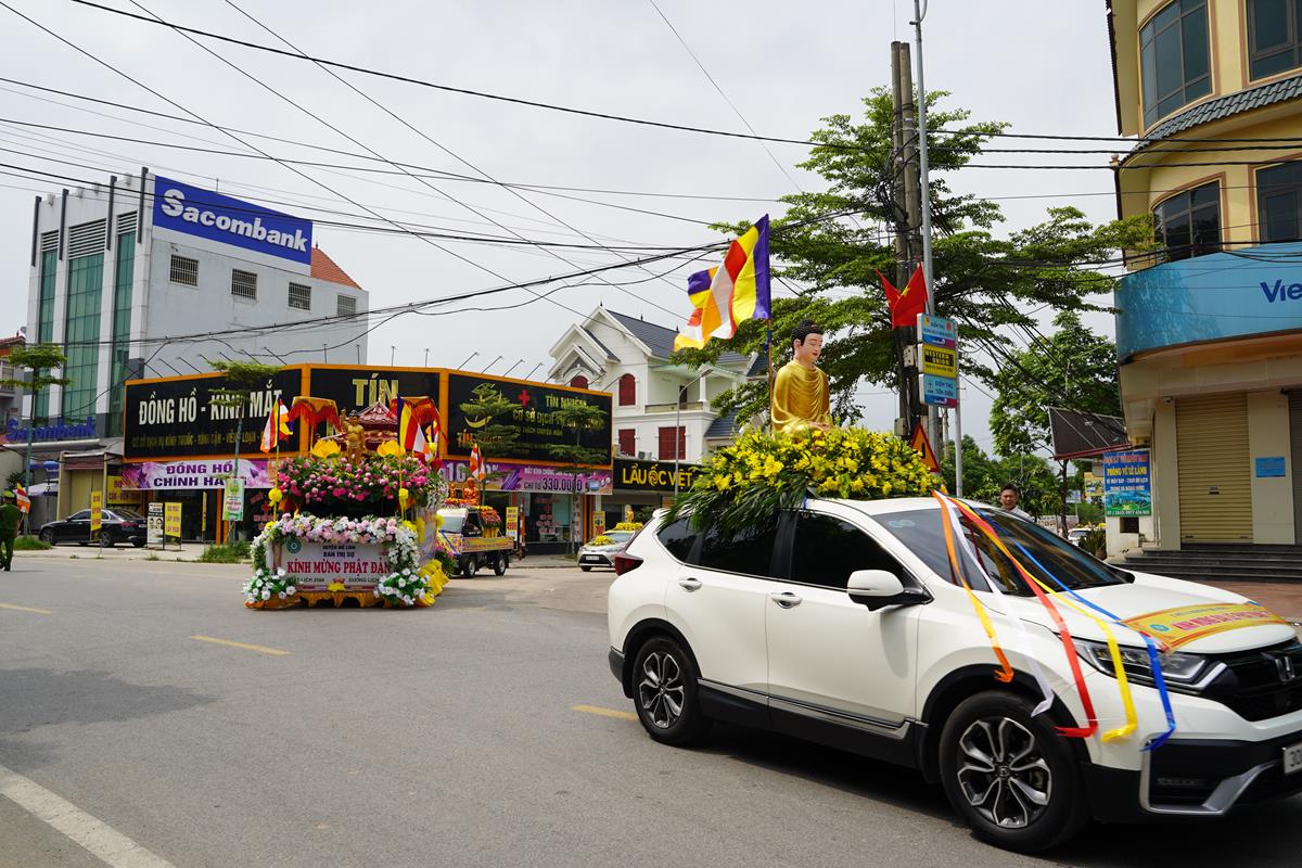 Dẫn đầu là xe hoa với Tôn tượng Đức Bản Sư Thích Ca Mâu Ni. Tiếp đến là xe hoa thiết trí mô phỏng lại hình tượng Thái tử Tất Đạt Đa đản sinh nơi vườn Lâm Tỳ Ni, cùng hình tượng Ngài thành Đạo, để đánh dấu sự kiện Ngài đã đến với cuộc đời từ tỉnh thức và thiền định, từ thể nhập chân lý và đại nguyện cứu khổ chúng sinh. Nối tiếp theo sau là hàng dài chiếc xe được thiết trí trang hoàng lộng lẫy, gồm hoa tươi, cờ ngũ sắc và tượng Đản sinh được đặt nơi vị trí trung tâm. Đó đều là tất cả lòng thành kính của người con Phật hướng về Đấng cha lành của 3 cõi, vị cha lành của 4 loài.