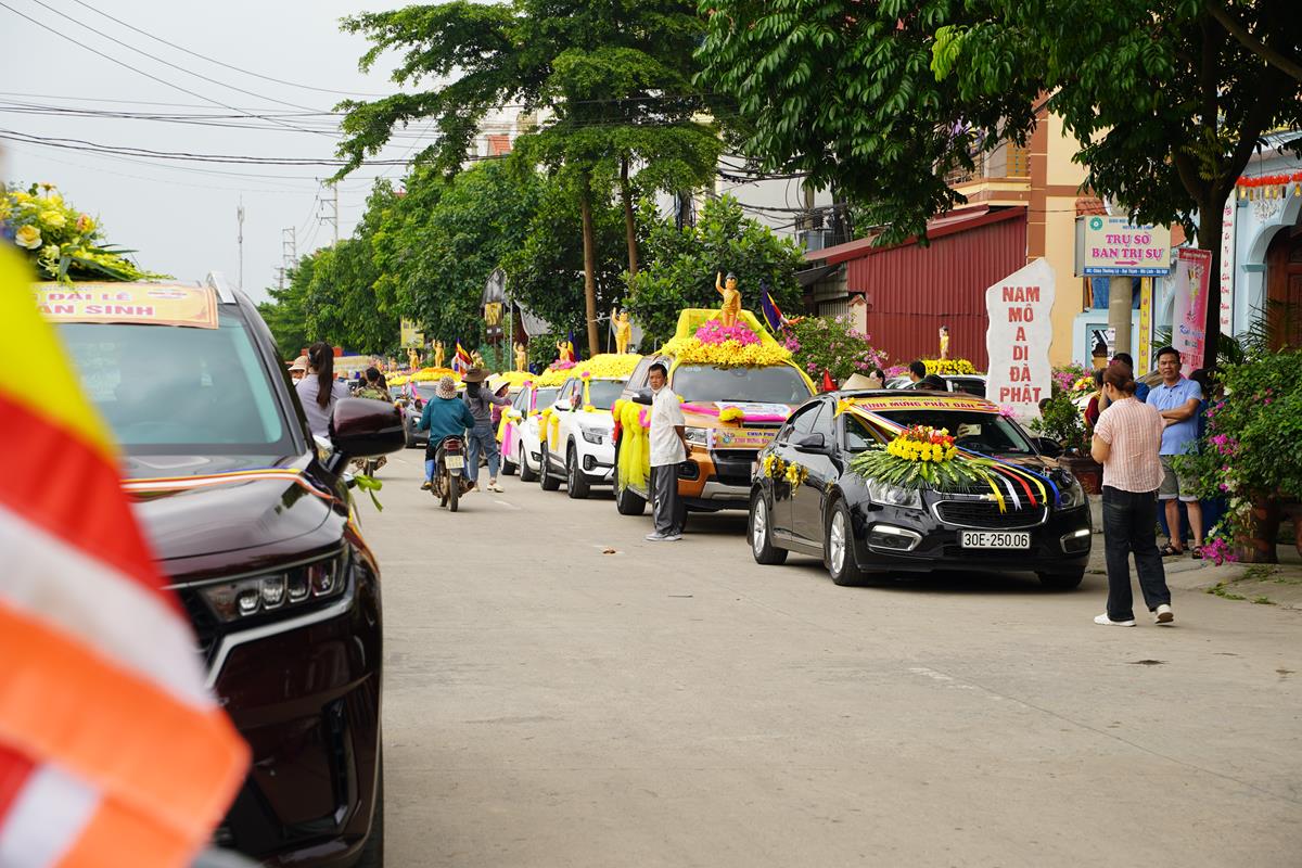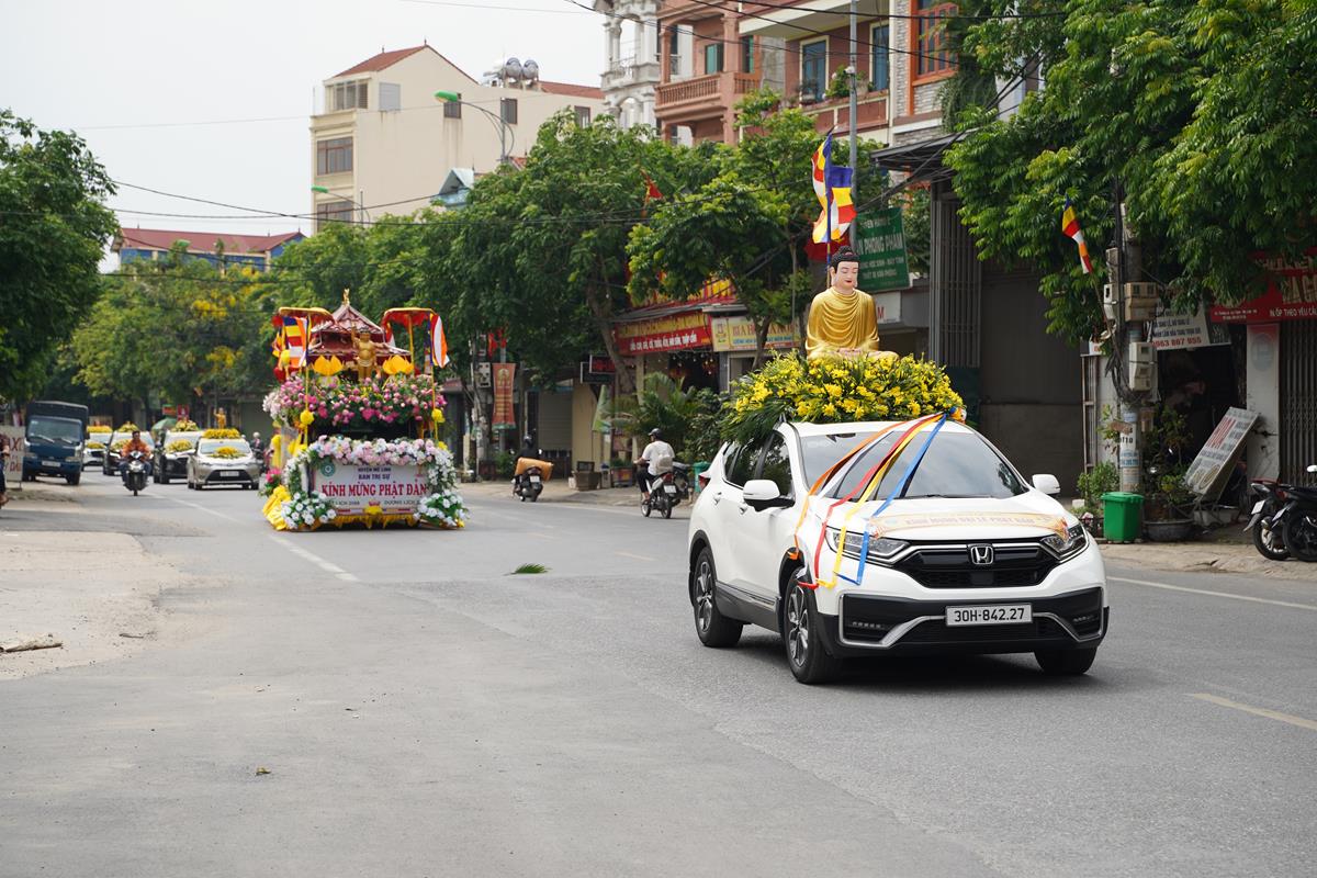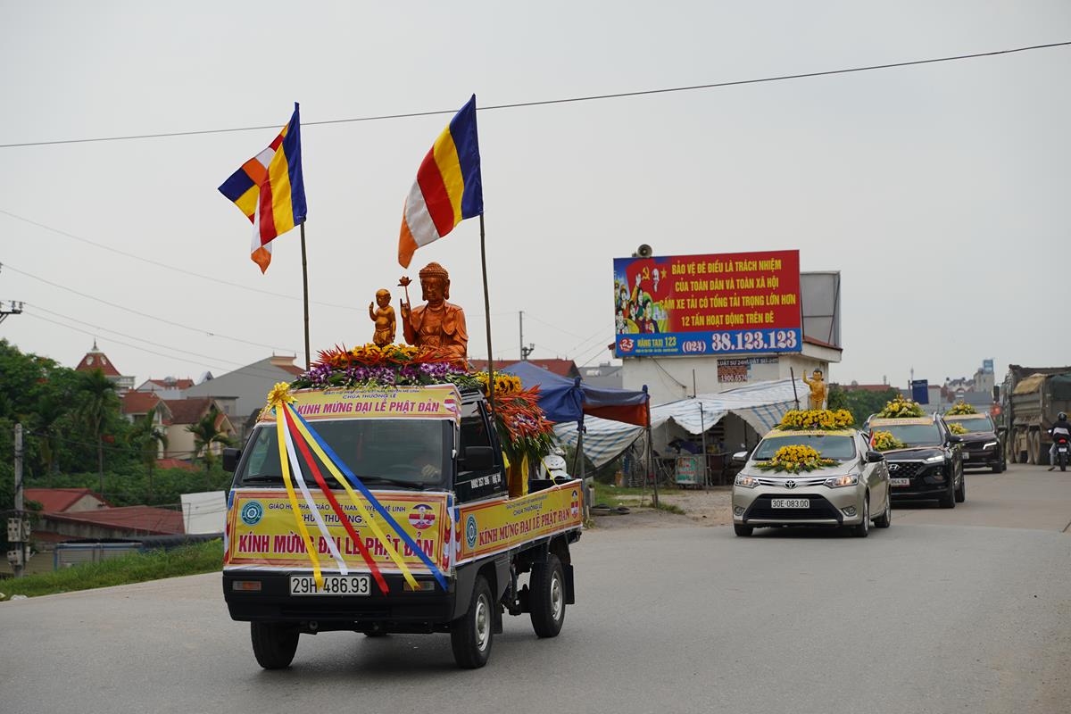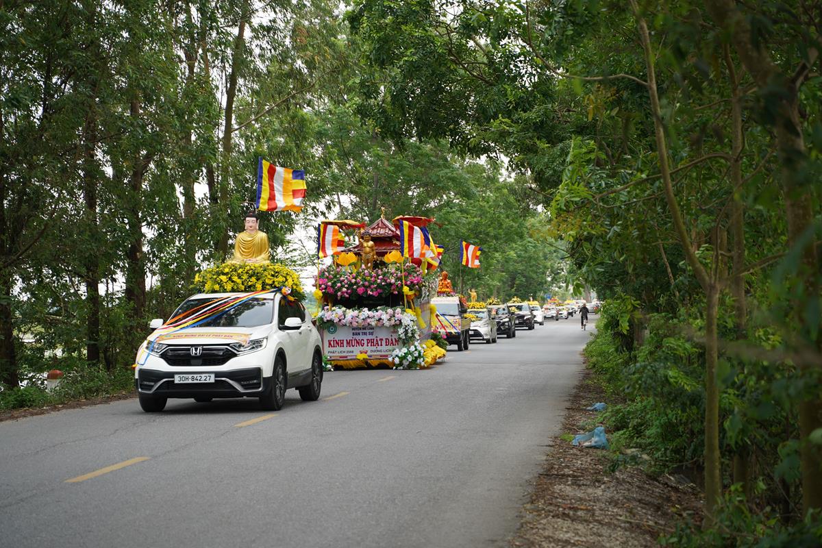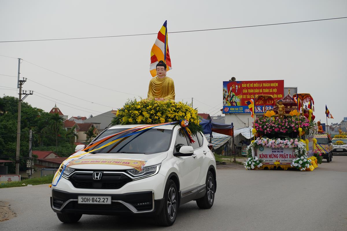 Dẫn đầu là xe hoa với Tôn tượng Đức Bản Sư Thích Ca Mâu Ni. Tiếp đến là xe hoa thiết trí mô phỏng lại hình tượng Thái tử Tất Đạt Đa đản sinh nơi vườn Lâm Tỳ Ni, cùng hình tượng Ngài thành Đạo, để đánh dấu sự kiện Ngài đã đến với cuộc đời từ tỉnh thức và thiền định, từ thể nhập chân lý và đại nguyện cứu khổ chúng sinh. Nối tiếp theo sau là hàng dài chiếc xe được thiết trí trang hoàng lộng lẫy, gồm hoa tươi, cờ ngũ sắc và tượng Đản sinh được đặt nơi vị trí trung tâm. Đó đều là tất cả lòng thành kính của người con Phật hướng về Đấng cha lành của 3 cõi, vị cha lành của 4 loài.