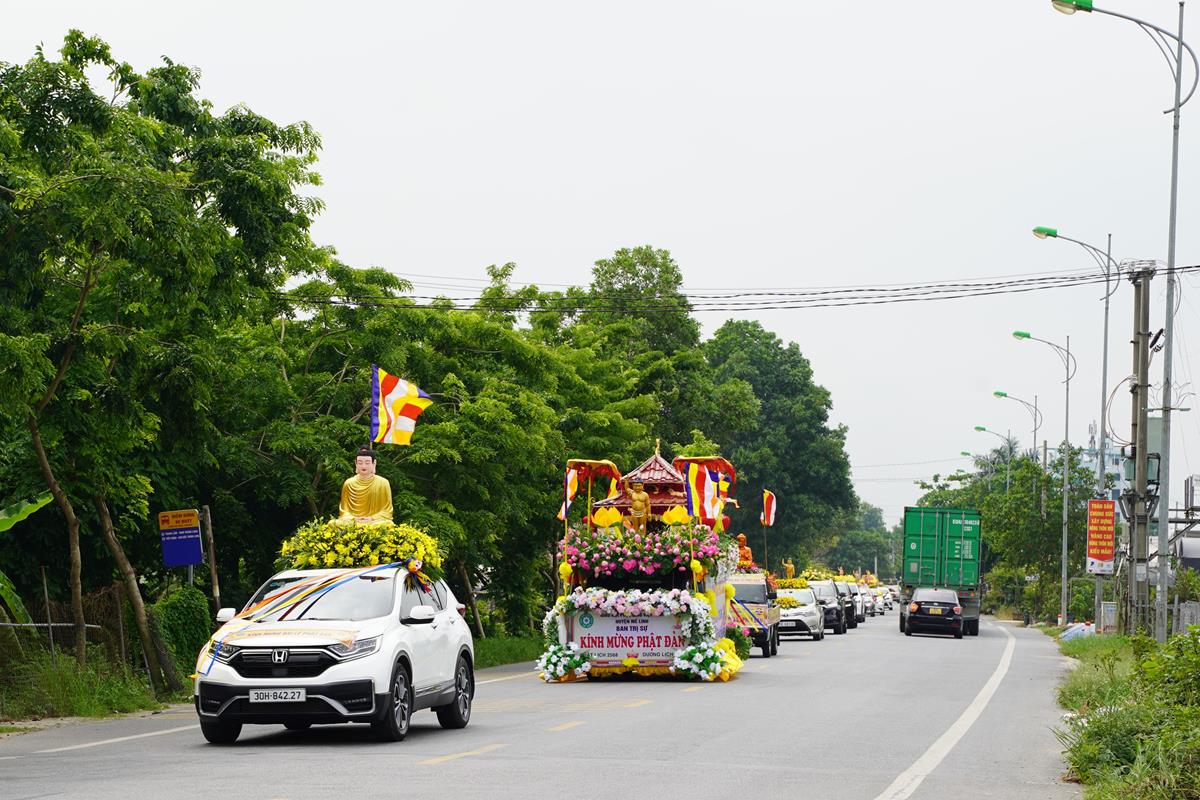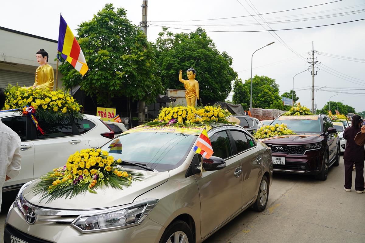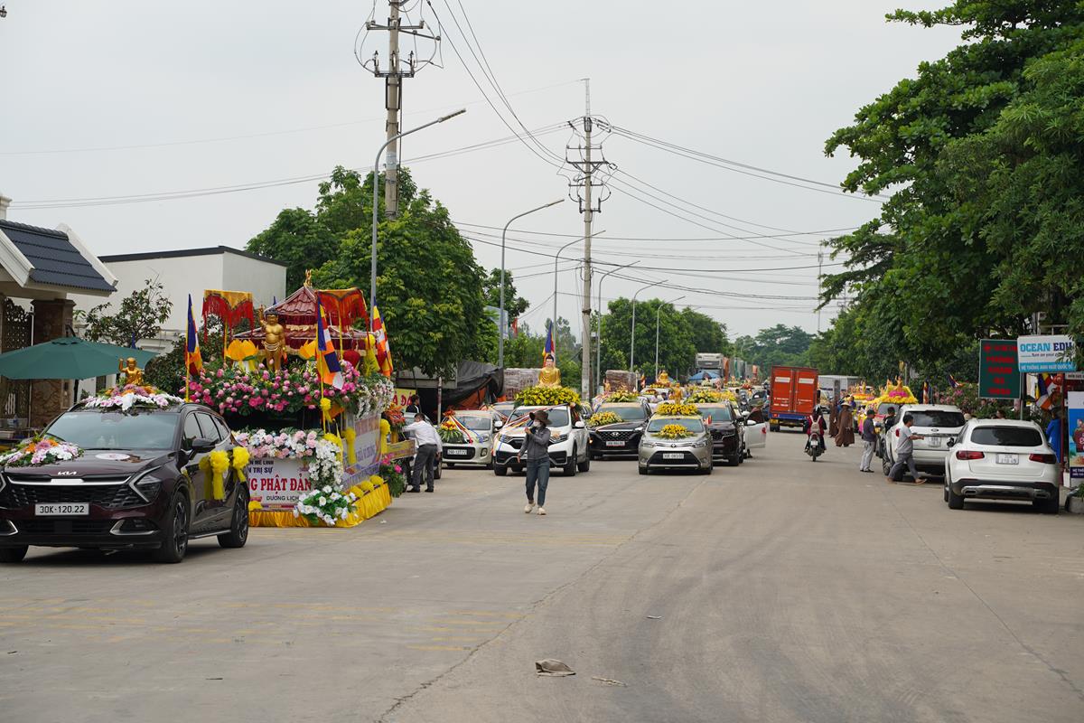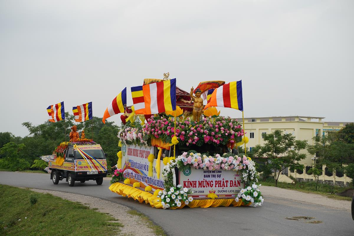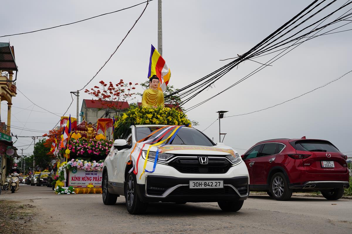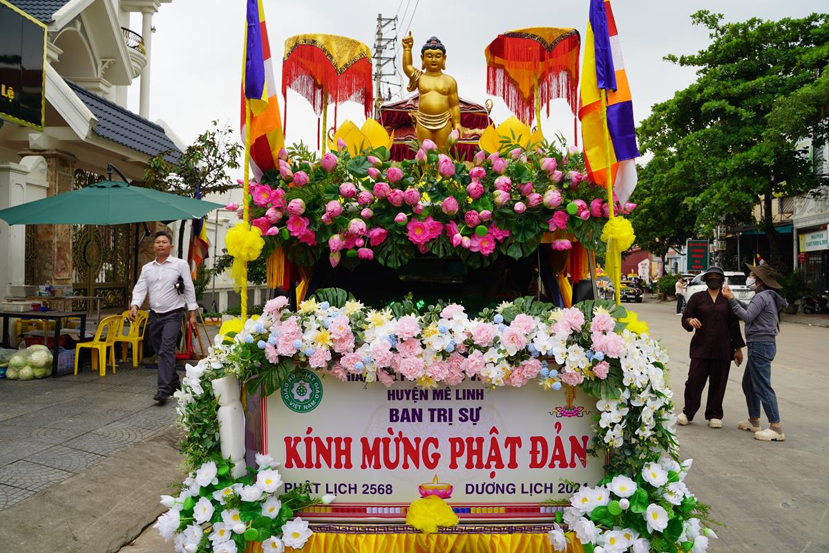 Dẫn đầu là xe hoa với Tôn tượng Đức Bản Sư Thích Ca Mâu Ni. Tiếp đến là xe hoa thiết trí mô phỏng lại hình tượng Thái tử Tất Đạt Đa đản sinh nơi vườn Lâm Tỳ Ni, cùng hình tượng Ngài thành Đạo, để đánh dấu sự kiện Ngài đã đến với cuộc đời từ tỉnh thức và thiền định, từ thể nhập chân lý và đại nguyện cứu khổ chúng sinh. Nối tiếp theo sau là hàng dài chiếc xe được thiết trí trang hoàng lộng lẫy, gồm hoa tươi, cờ ngũ sắc và tượng Đản sinh được đặt nơi vị trí trung tâm. Đó đều là tất cả lòng thành kính của người con Phật hướng về Đấng cha lành của 3 cõi, vị cha lành của 4 loài.