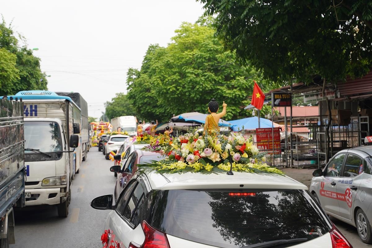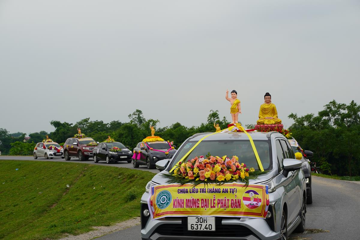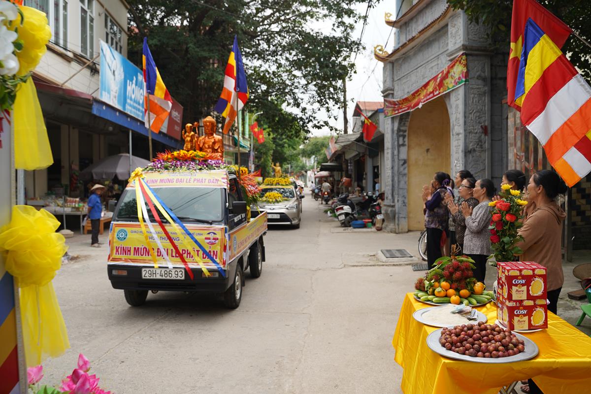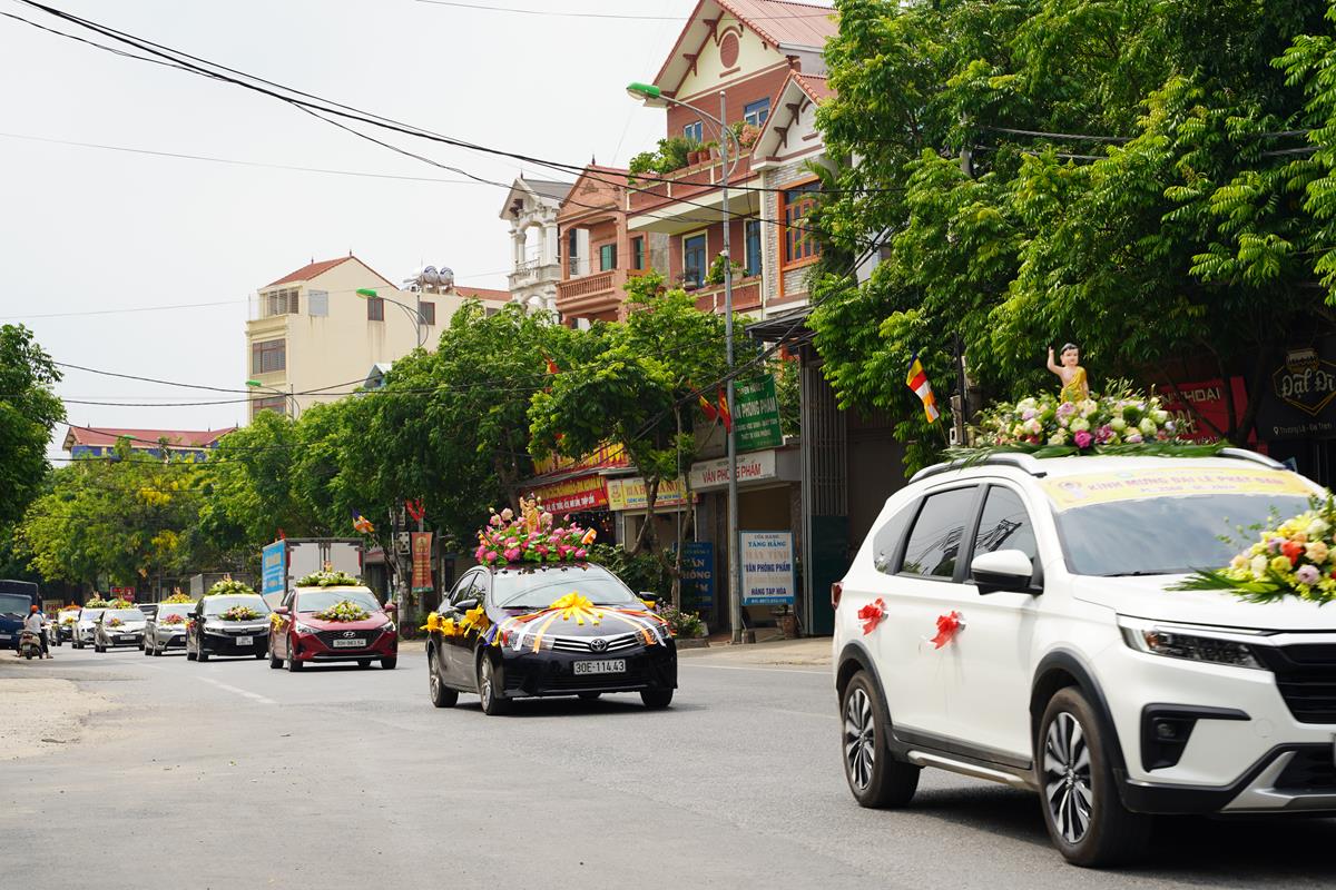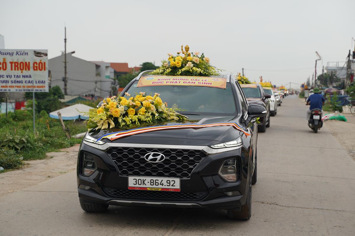 Dẫn đầu là xe hoa với Tôn tượng Đức Bản Sư Thích Ca Mâu Ni. Tiếp đến là xe hoa thiết trí mô phỏng lại hình tượng Thái tử Tất Đạt Đa đản sinh nơi vườn Lâm Tỳ Ni, cùng hình tượng Ngài thành Đạo, để đánh dấu sự kiện Ngài đã đến với cuộc đời từ tỉnh thức và thiền định, từ thể nhập chân lý và đại nguyện cứu khổ chúng sinh. Nối tiếp theo sau là hàng dài chiếc xe được thiết trí trang hoàng lộng lẫy, gồm hoa tươi, cờ ngũ sắc và tượng Đản sinh được đặt nơi vị trí trung tâm. Đó đều là tất cả lòng thành kính của người con Phật hướng về Đấng cha lành của 3 cõi, vị cha lành của 4 loài.