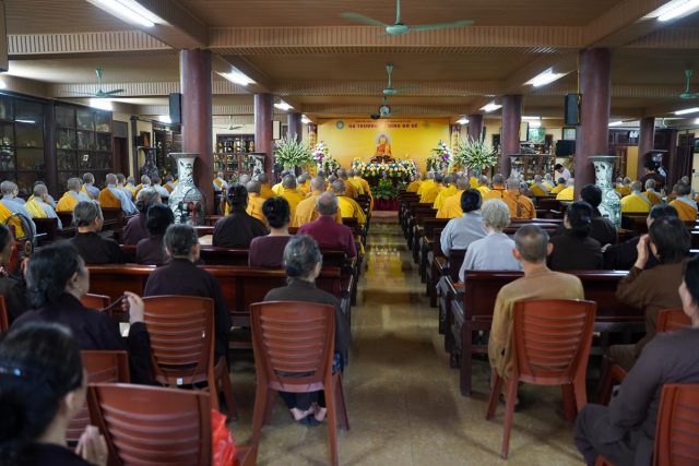 Sau khi cử hành nghi lễ cúng Phật đại khoa, trong không khí trang nghiêm thanh tịnh, 128 hành giả Tăng Ni cùng vân tập về Giảng đường để cử hành Tạ Pháp An Cư theo nghi thức cổ truyền. Đại diện chư hành giả tại hạ trường Bồ Đề đã dâng lời tác bạch Tạ Pháp, cảm niệm ân đức của chư tôn đức trong Ban chức sự hạ trường, trong 3 tháng vừa qua đã luôn tận tâm tận lực, không quản ngại Phật sự đa đoan, giúp cho các hành giả vân tập về nơi đây kiết hạ an cư được như luật, như pháp. Đồng thời, đại diện chư hành giả cũng dâng lời khánh tuế lên chư tôn đức, mừng chư tôn đức thêm một tuổi hạ.