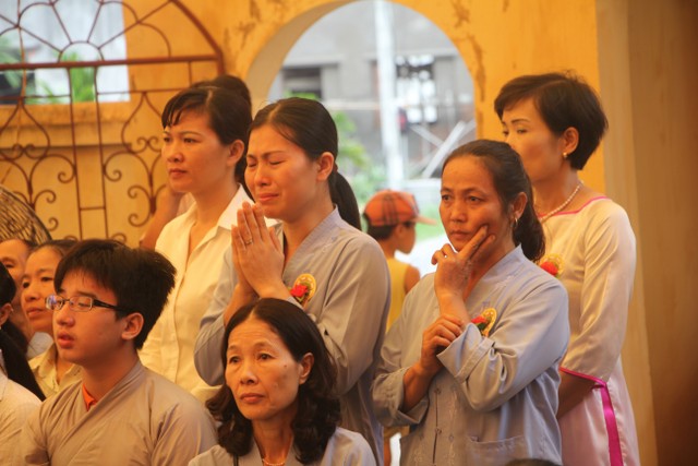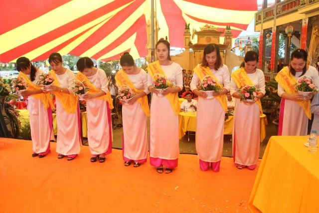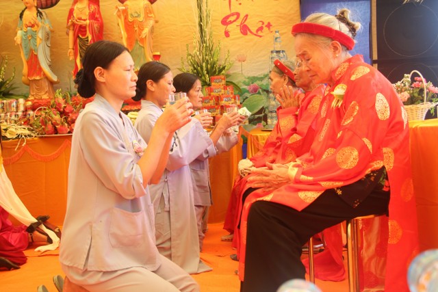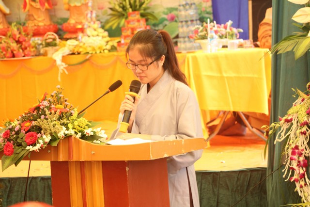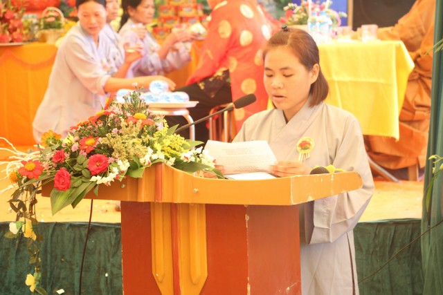 Toàn thể đại chúng vô cùng xúc động khi nghe diễn đọc ý nghĩa cài hoa hồng và hoài niệm về những ngày thơ bé bên cha mẹ. Sau đó, các bạn trẻ đã cài hoa hồng kính dâng chư tôn đức, tặng quý vị khách quý cùng nhân dân Phật tử trong niềm cảm thương dâng trào về người cha, người mẹ khả kính.